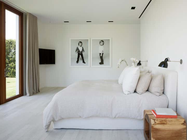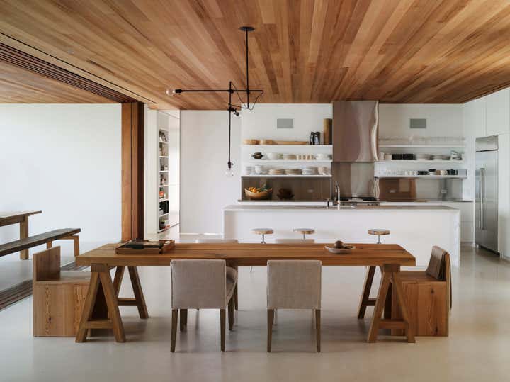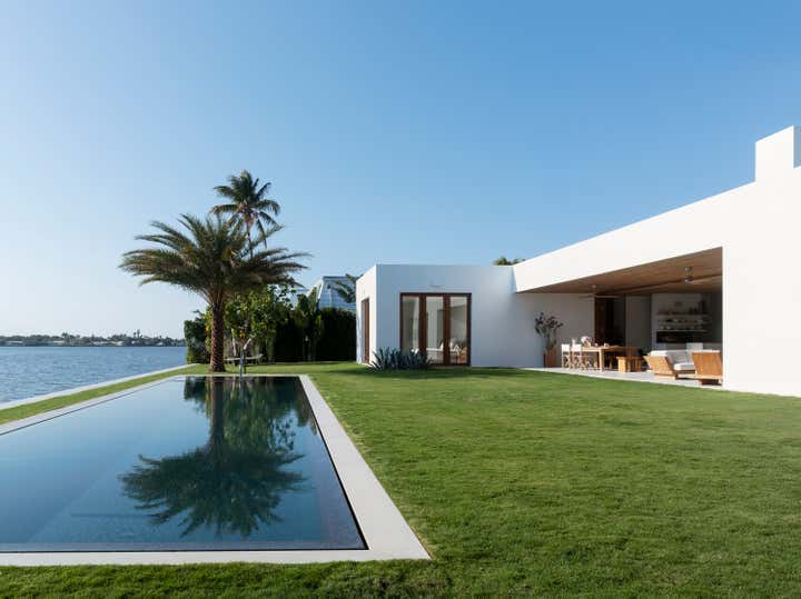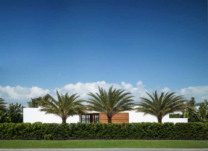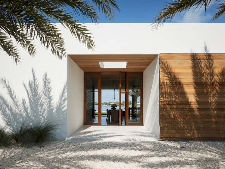 Located on the inner coast of Palm Beach, this single-family residence was designed with an eye toward casual luxury and modern simplicity. The layout maximizes flexibility and opportunities for indoor/outdoor living. Strategic landscaping enhances street-front privacy while the rear of the house opens up to the backyard, highlighting the pool and the waterway beyond. A kitchen, dining room, and living room combine at the center of the plan, while corner bedroom suites are sequestered from these social spaces. Throughout the interiors, wooden elements add warmth to the white stucco walls and cool concrete floors.