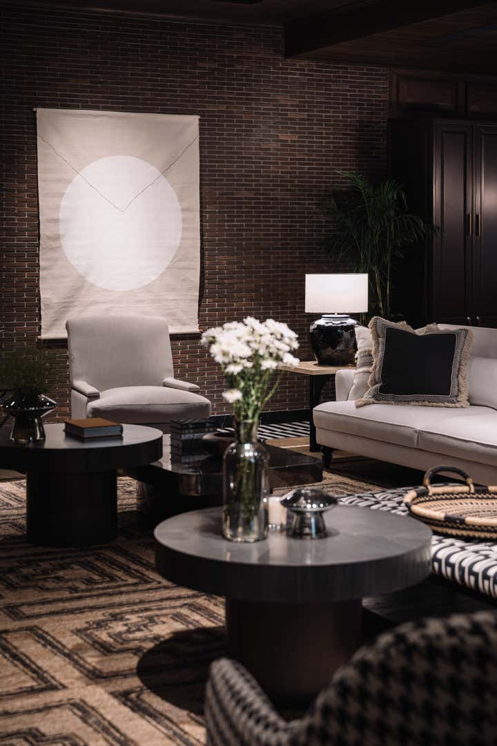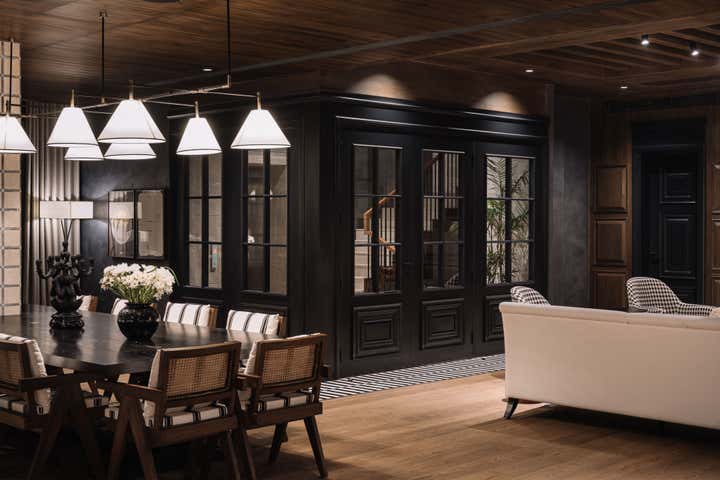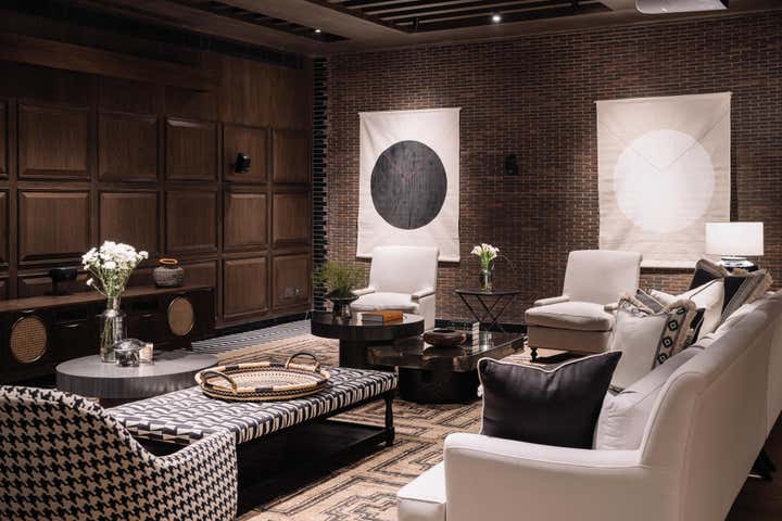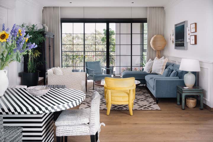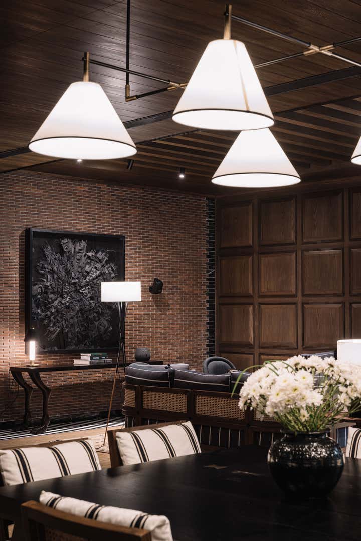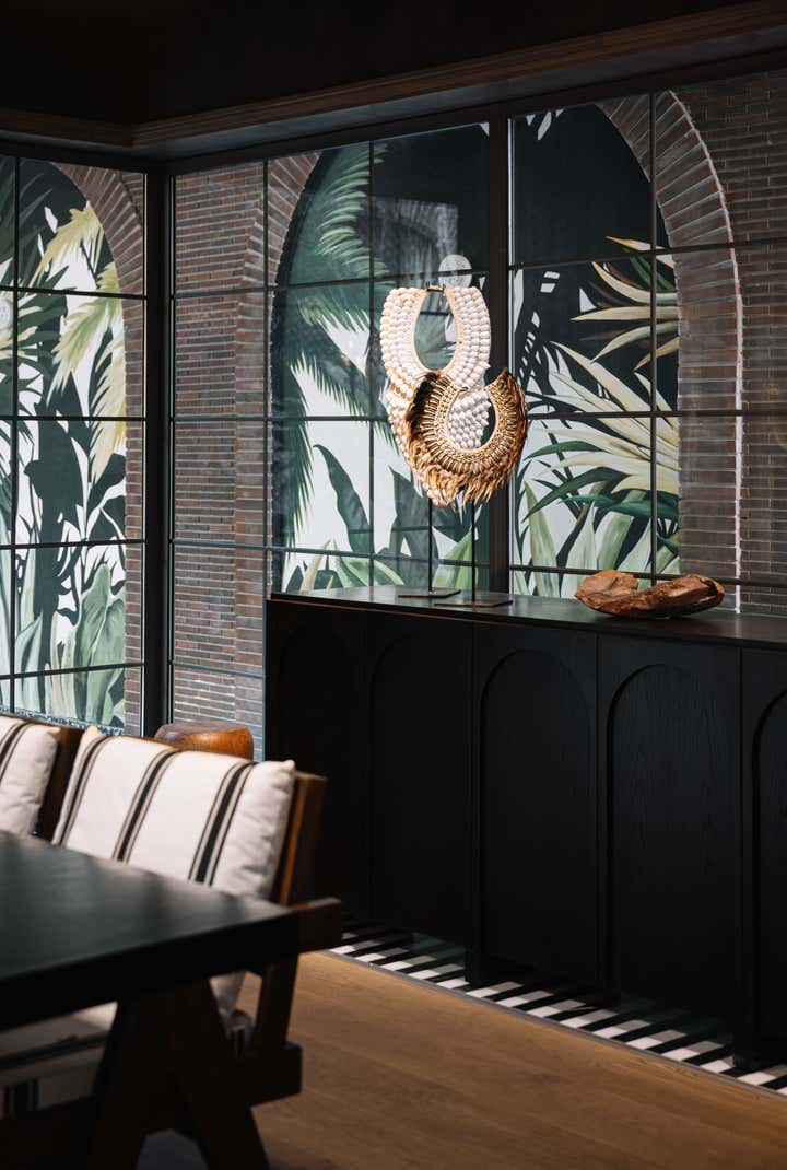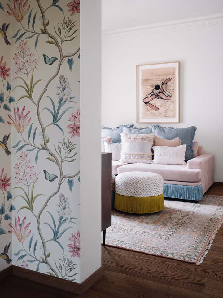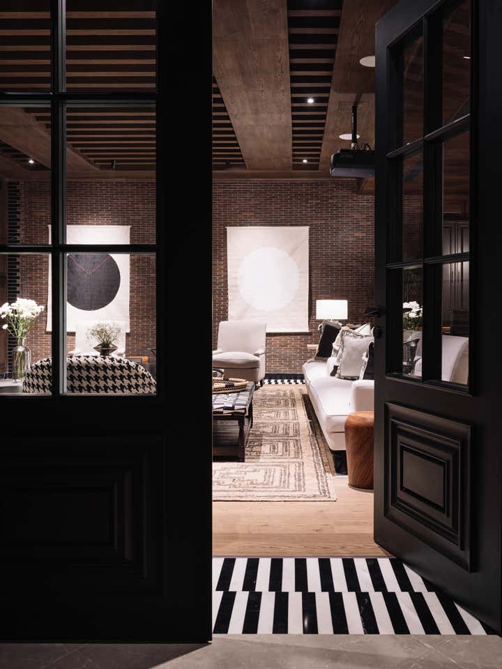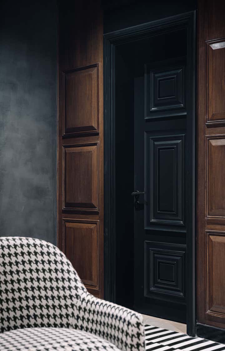 We used a crisp leitmotif accent of black and white in various ways throughout the house as a unifying element and each element was thought through carefully to reflect the family. The large basement is their main entertainment area and opens out into a small open to air courtyard. A large wall is clad with aged bricks & brick arches soften the linearity of the sunken courtyard. A large tree holds court in the courtyard and the arches are hand painted with a mural of more trees. Crittall aluminum exterior doors in a graphite grey tone are used across the entire home while the basement has inky black painted wooden internal doors that lead into it from the lobby. It is a play of textures and details then, from the warm oak wooden floors bound by a black and white marble border, brick walls with black stone corner junctions, and wood paneled walls. The first floor is the couple’s private space and also where they entertain a more intimate group of friends. The lounge is another double height space clad with a creamy ivory matte PU finished custom made paneling. The clients loved prints and florals and we worked on incorporating them in their bedrooms, both on their floors and the children’s rooms on the second floor.