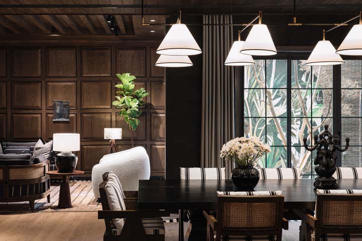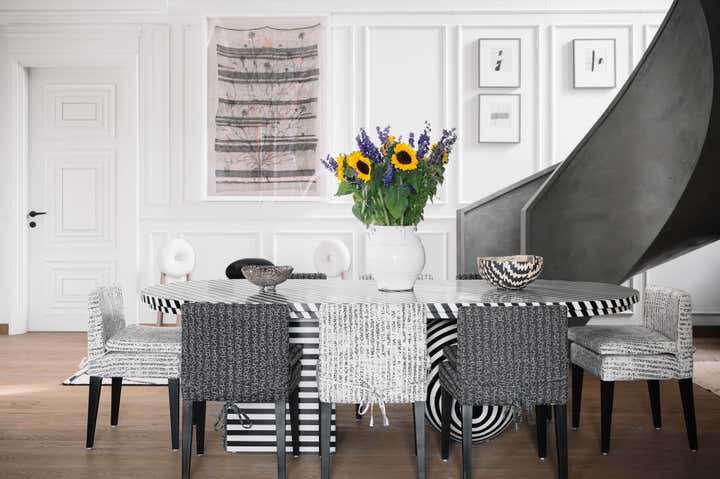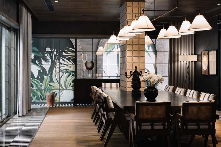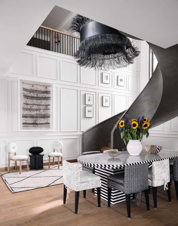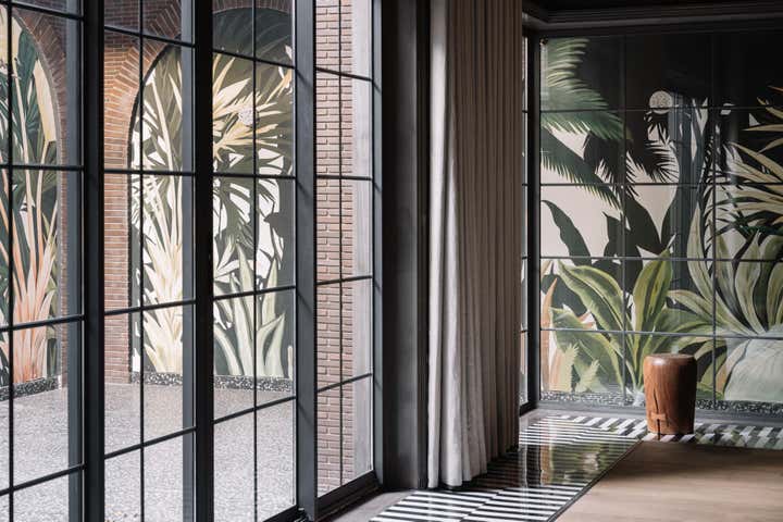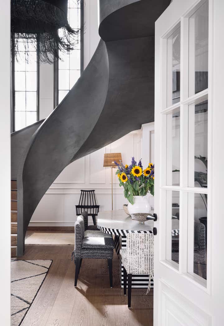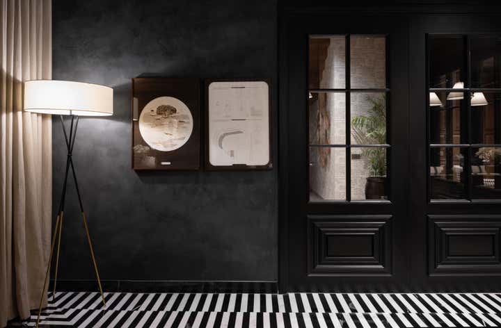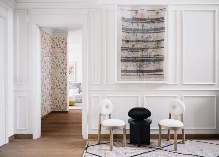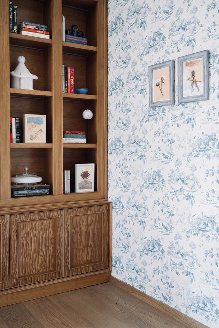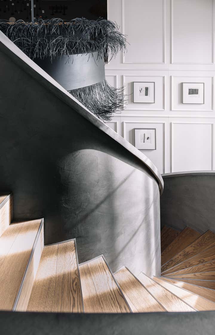 We used a crisp leitmotif accent of black and white in various ways throughout the house as a unifying element and each element was thought through carefully to reflect the family. The large basement is their main entertainment area and opens out into a small open to air courtyard. A large wall is clad with aged bricks & brick arches soften the linearity of the sunken courtyard. A large tree holds court in the courtyard and the arches are hand painted with a mural of more trees. Crittall aluminum exterior doors in a graphite grey tone are used across the entire home while the basement has inky black painted wooden internal doors that lead into it from the lobby. It is a play of textures and details then, from the warm oak wooden floors bound by a black and white marble border, brick walls with black stone corner junctions, and wood paneled walls. The first floor is the couple’s private space and also where they entertain a more intimate group of friends. The lounge is another double height space clad with a creamy ivory matte PU finished custom made paneling. The clients loved prints and florals and we worked on incorporating them in their bedrooms, both on their floors and the children’s rooms on the second floor.