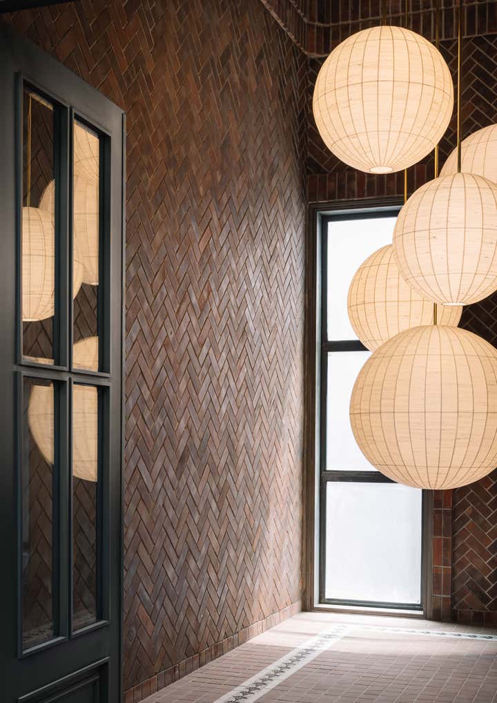 The home is divided into 3 floors where the family resides, along with a terrace and a stilt area which houses the car parking and is also their main entrance. The large double height entrance lobby is brick clad in a herringbone pattern with a multi-level brick cornice.