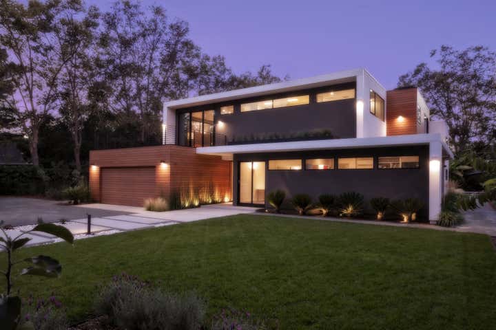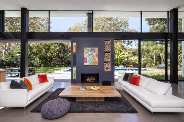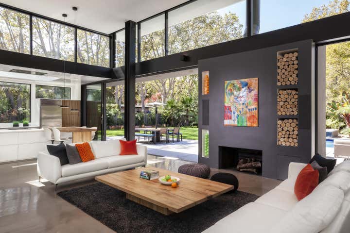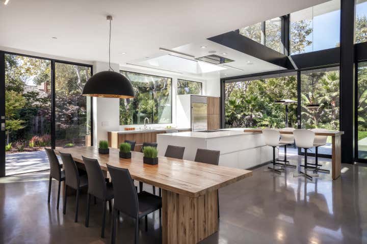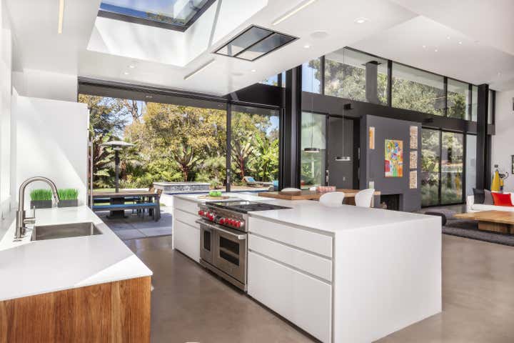 Designed with the objective to be able to see the sky from anywhere in the house, Maydan Architects incorporated a massive skylight in the main living space, and additional skylights throughout the kitchen, bedrooms, and bathrooms. The front exterior of the house retains privacy with clerestory windows and a set-back entry door. Wood siding adds a touch of warmth to the ultra-modern minimalist facade and blends well with the white overhangs, dark stucco, and glass. The rear facade is in stark contrast to the privacy of the front. Taking advantage of the large lot, the rear is awash in 16-foot floor-to-ceiling windows that open up to the backyard and provide unimpeded views to the pool and lush landscaping. The design offers a seamless indoor-outdoor transition.