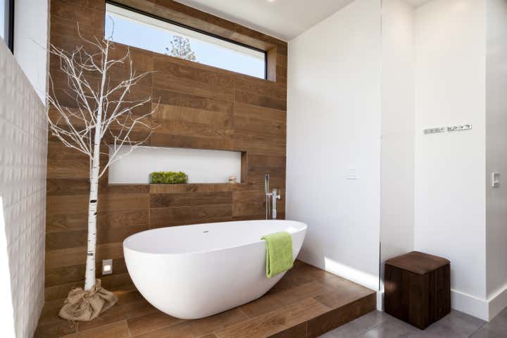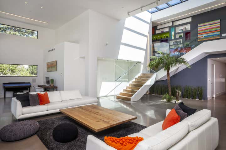 In addition to the stunning windows, in order to further meld the surrounding nature with the interior, Maydan Architects planted a palm tree in the living area using an existing planting atrium, which gets natural light from the oversized skylight above. The neutral color palette of the home is outfitted with quirky and colorful design details, such as the cut-out bookshelf at the top of the stairs and the art throughout the home. The home is unique and modern while remaining warm and inviting.