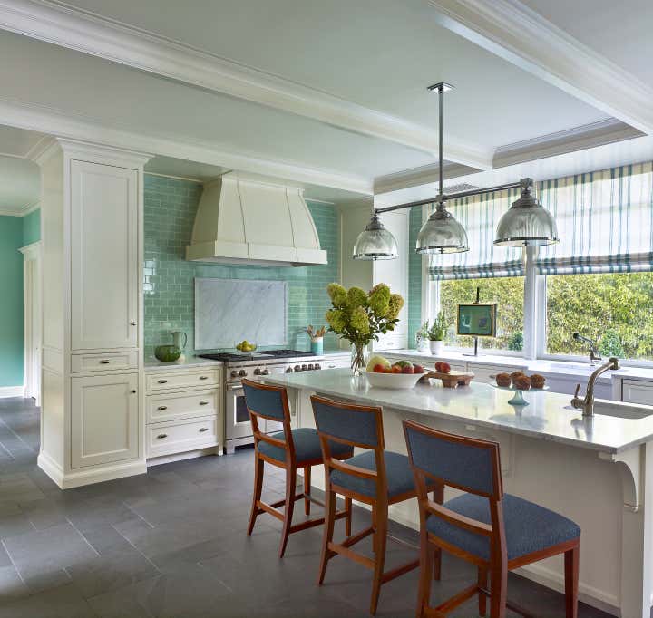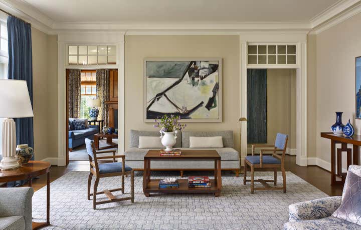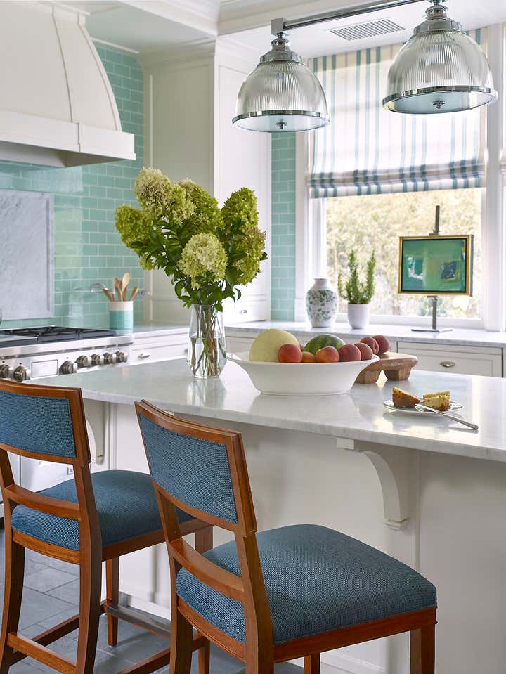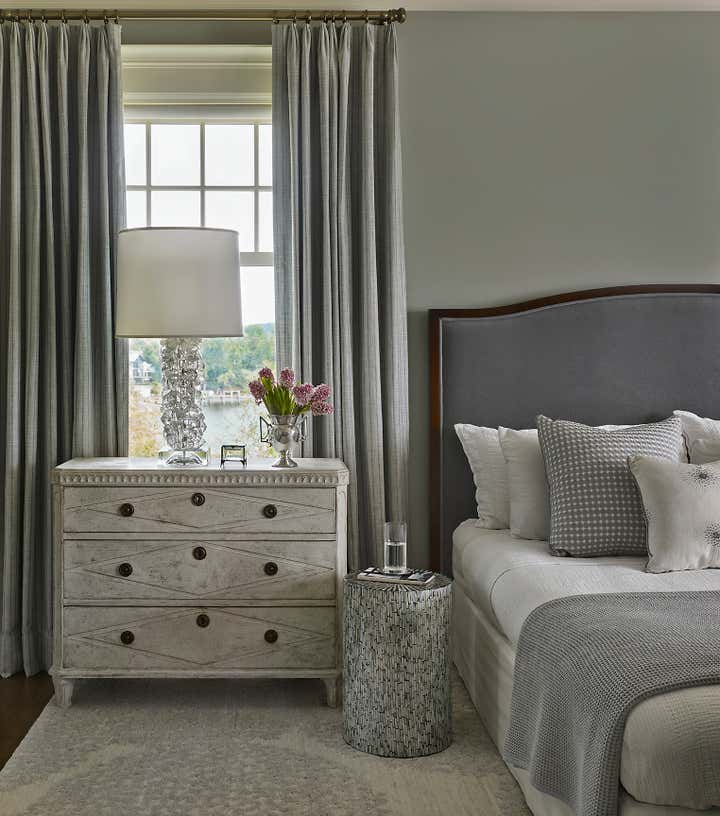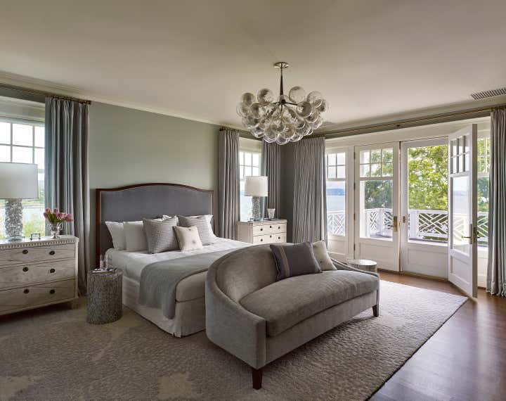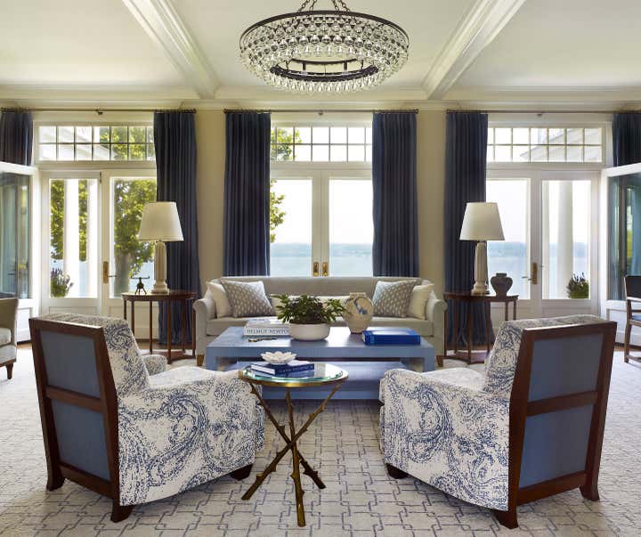 A color palette of tempered marine blues, celadon, and sophisticated neutrals was chosen, paying homage to the verdant landscape and gleaming water beyond the structure’s facade. The resulting spaces are comfortably classic and ideally suited to the stunning naturalistic panoramas.