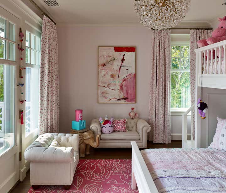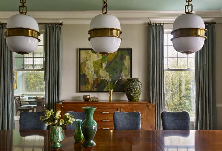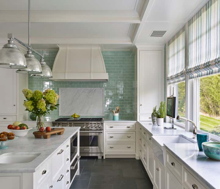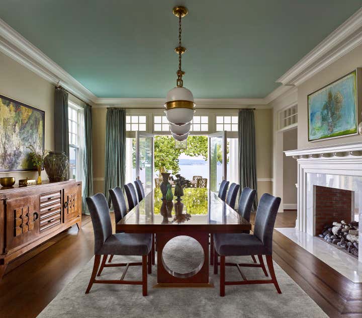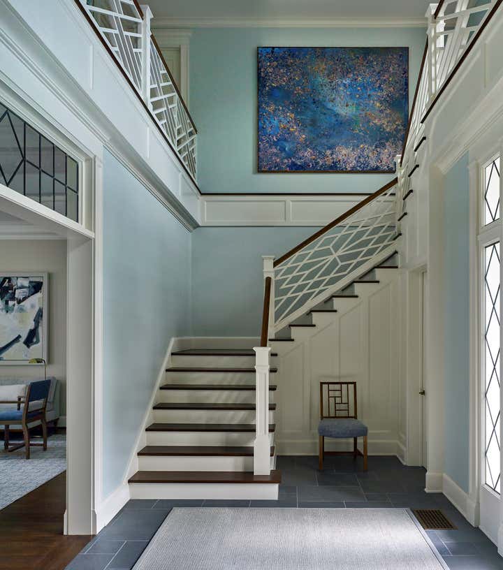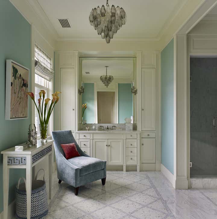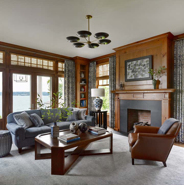 A color palette of tempered marine blues, celadon, and sophisticated neutrals was chosen, paying homage to the verdant landscape and gleaming water beyond the structure’s facade. The resulting spaces are comfortably classic and ideally suited to the stunning naturalistic panoramas.