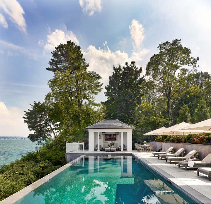With the interiors complete, the focus turned to the client’s wish for a pool and cabana, presenting a daunting set of challenges. Working closely with an engineer, landscape designer, and an experienced pool builder, the team moved the earth–quite literally–to create a plateau for a resort-inspired infinity edge pool. The resulting terrace appears effortlessly carved into the landscape—as if it has always been there—the ultimate hallmark of successful exterior design.