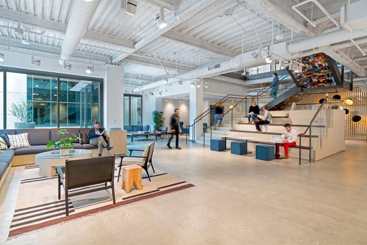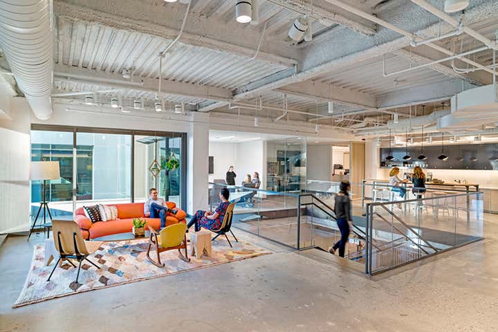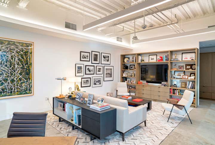 When Imagine Entertainment outgrew their Beverly Hills offices and moved into new digs a block away, they faced two challenges. The first was how to make the new space feel modern and creative to attract new talent while retaining and burnishing the studio’s 30-year legacy. The second was how to interconnect Imagine’s television and movie departments, which had occupied separate spaces in the former location. What could have been an obstacle, the fact that the new offices were divided among two floors of a four-story building, became an opportunity. The organization required that the design prioritize openness throughout the two floors with a combined 22,000 square foot space. A large central staircase was created between the two stories, flanked with areas for impromptu gatherings. This new focal point is just one the many public spaces that enliven the workplace. A formal conference room, an informal living room, an area where the entire staff can congregate, and several small lounges for spontaneous collaboration offer a suite of spaces for meetings and work. Many of these public spaces are located on the perimeter of the building, bringing natural light and open sight lines deep into the floor plate.