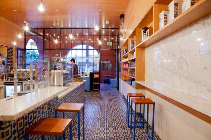 Intelligentsia Silverlake is the West Coast flagship for the Chicago-based specialty coffee importers and roadsters. Part of the foodie vanguard transforming the aesthetics of coffee enjoyment, Intelligentsia wanted to a new type of coffeehouse that redefined the tasting experience for modern consumers. A highly visible and accessible location in the heart of Silverlake’s dining and shopping district required sensitivity to the local established style and vernacular. We had to marry that with the client’s devotion to providing customers with an unparalleled coffee and tea experience in an environment steeped in knowledge, thus creating a coffeebar that expressed their own particular culture. Our solution to bring these two characteristics together was to design a public living room defined by rich material and social qualities. The super graphic tile pattern runs from the side walk through the patio to the inside and up the walls of the central service counter.