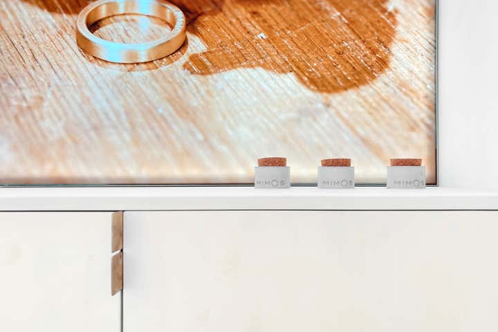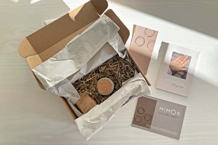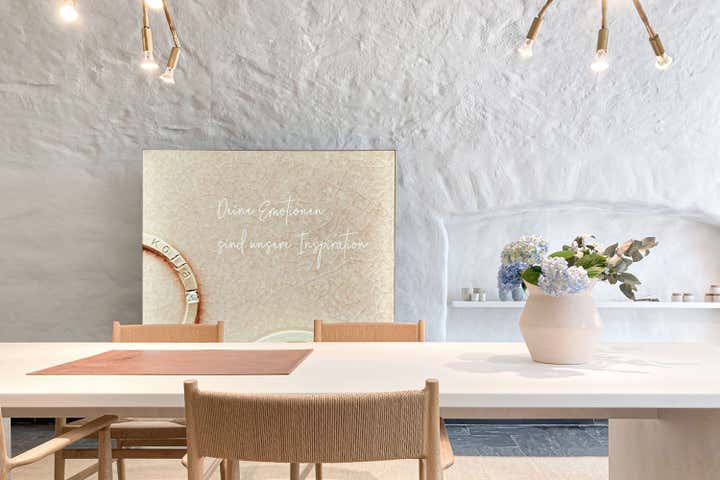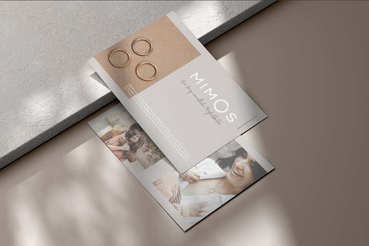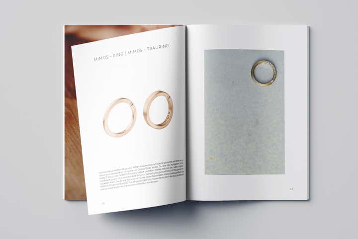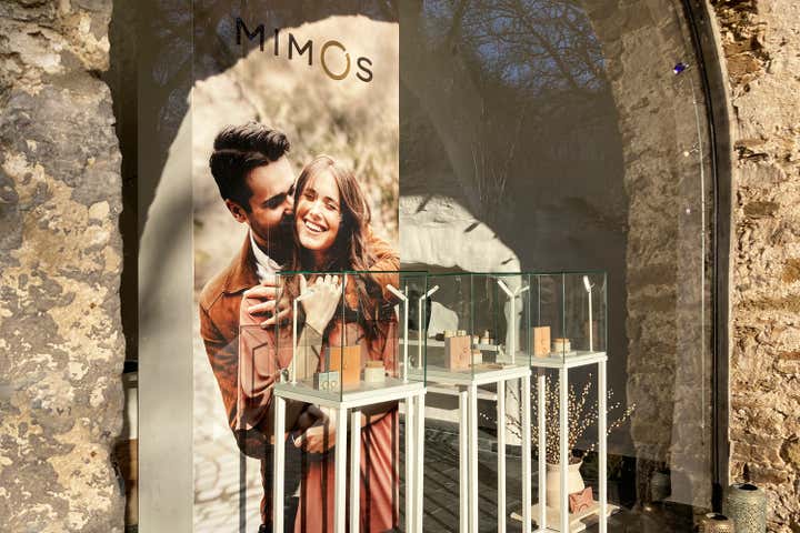 For the new jewelry brand MIMOS we were allowed to take over the showroom in Schloss Lüntenbeck as well as a large part of the graphic design. The already existing logo was embedded in a into a holistic graphic and spatial concept. The emotions and warmth emanating from the product idea can now be experienced in space and digital as well as printed media. The white glazed wood of the consulting table and the built-in cabinet create a bright and inviting atmosphere. The noble impression of the theme "individual jewelry" is enhanced by the special details and brass lamps, the soaped oak chairs from a Danish manufacturer, the special showcase equipment and the brand communication in LED light frames and picture frames. created. The window display also clearly reflects the brand's content and invites the viewer to explore.