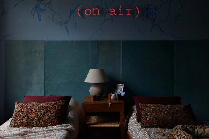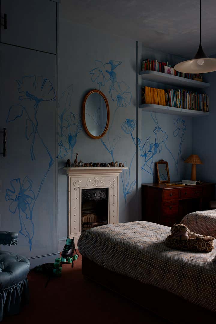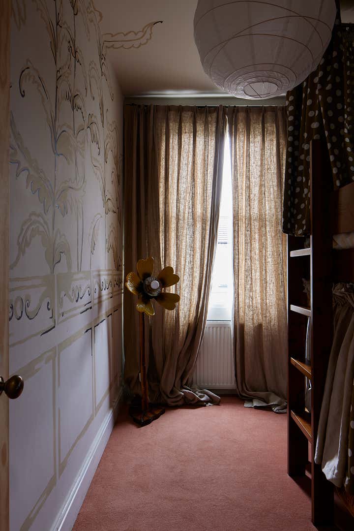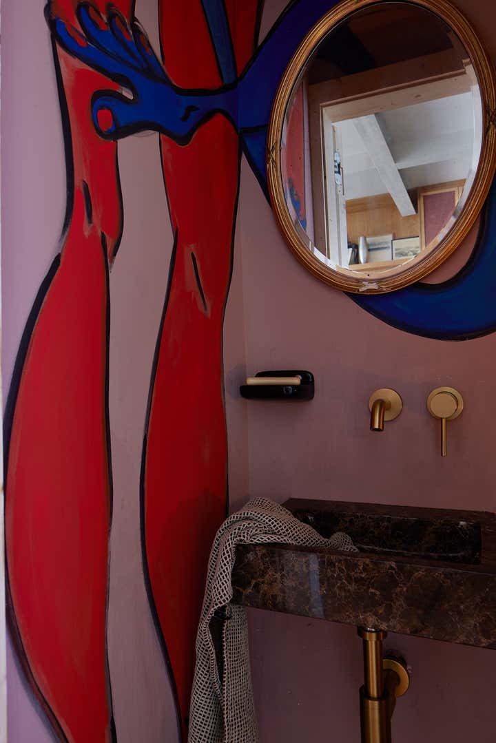 Throughout the home, Selway’s hand-painted murals, found in her daughters’ bedrooms and other spaces, reflect her painterly background and experimental spirit. In the powder room, a playful mural of limbs and gestures by artist Annelie Fawke, paired with her custom ceramic lighting, brings a sense of whimsy and warmth.