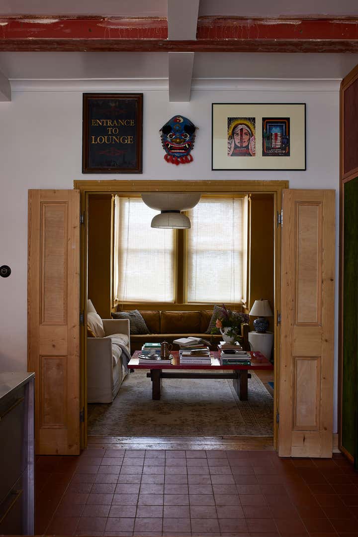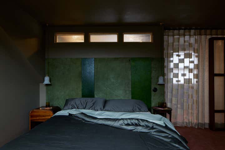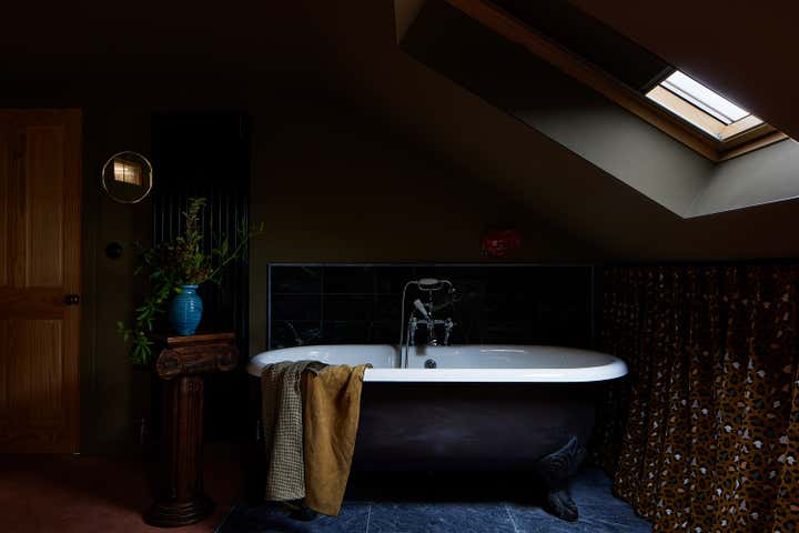 Repurposed heirlooms and salvaged materials layer the design with meaning: scrap leather and suede panel cabinetry, marble tiles from Selway’s childhood home frame the skylit clawfoot tub, and fabrics from her mother’s 1970s wedding dress are reimagined as bedding.