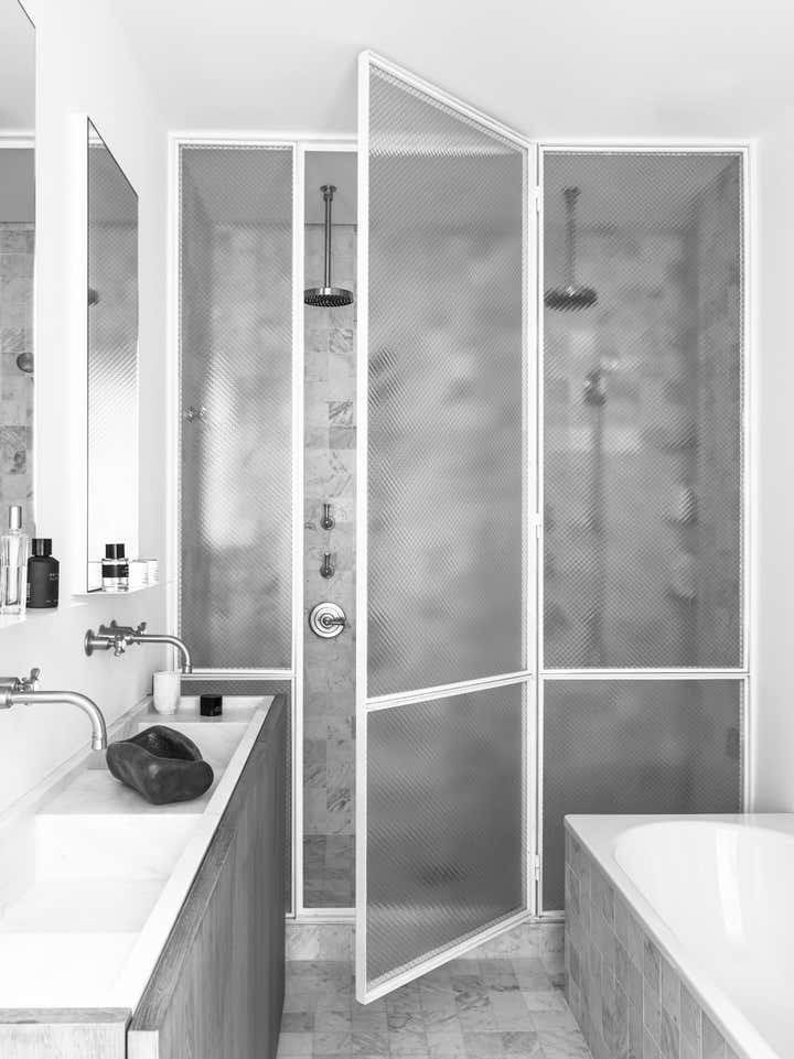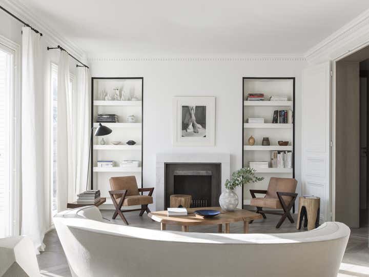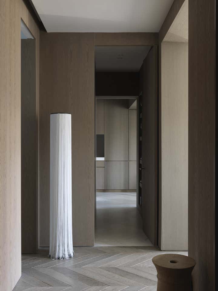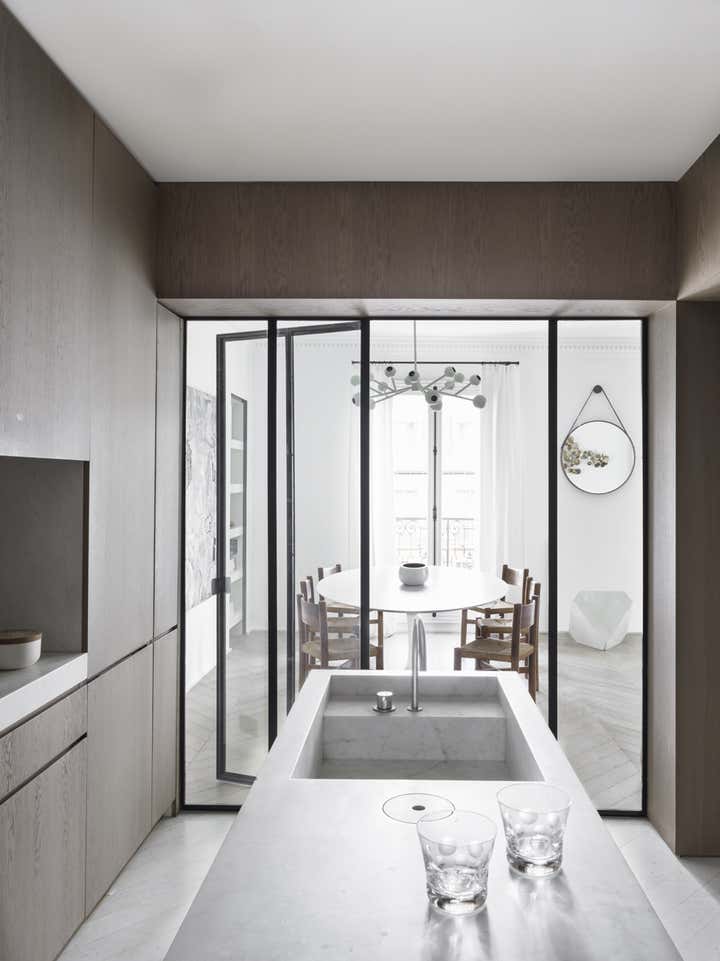 Located in the 6th arrondissement in Paris, on a busy street near Montparnasse, this apartment hadn’t been restored or even rethought in 40 years. We completely transformed the layout, inverting the location of the kitchen with that of the bathroom and created a large living space from what had been three small rooms. At its heart is the kitchen, wrapped in brushed oak paneling with a sculptural marble counter at its center and a glass partition to let in natural light.