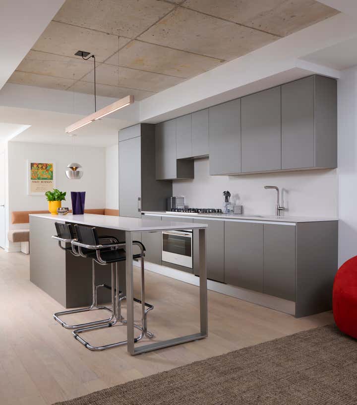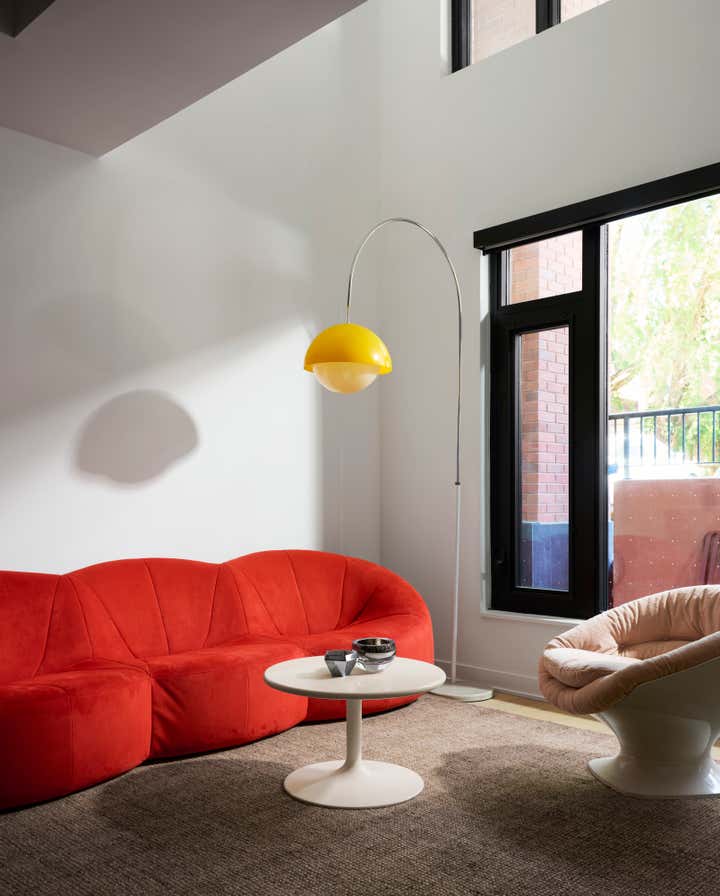 The interior, designed by Dimitri Chris, was completed within a compressed timeline using primarily locally sourced vintage furniture. The approach to sourcing was guided less by trend and more by continuity, selecting pieces that carried a sense of history while still feeling adaptable to different occupants over time. A shared affinity for 1960s Space Age design subtly informs the space through curved silhouettes, low-slung seating, and sculptural lighting, introducing a quiet sense of futurism without overwhelming the lived-in quality of the interiors.
