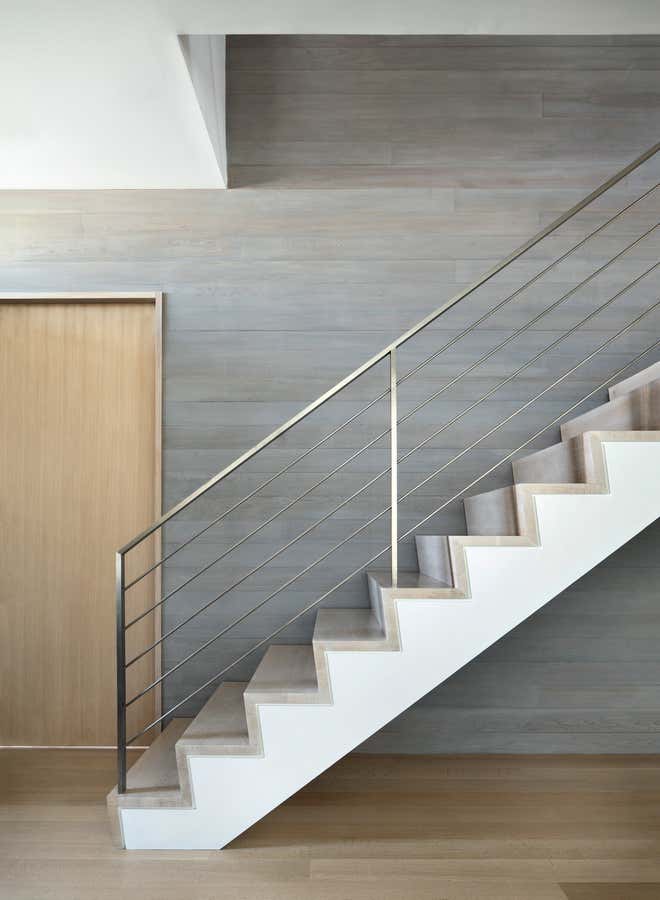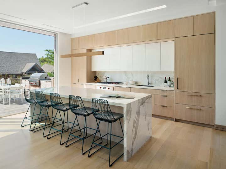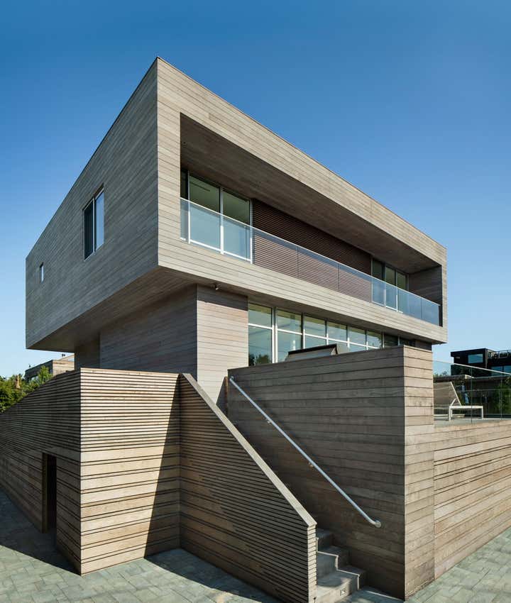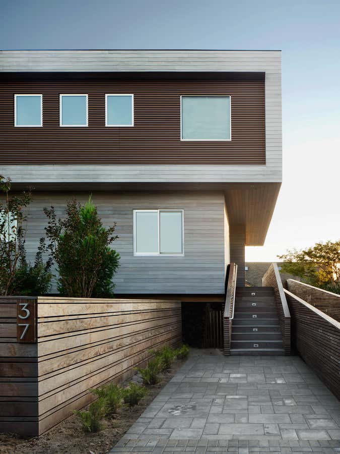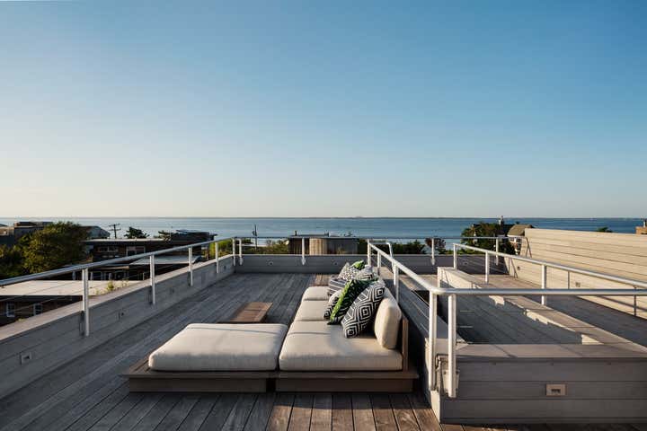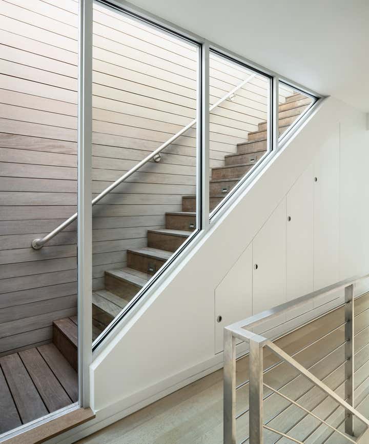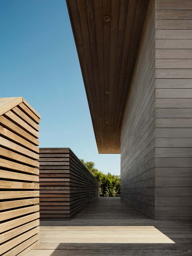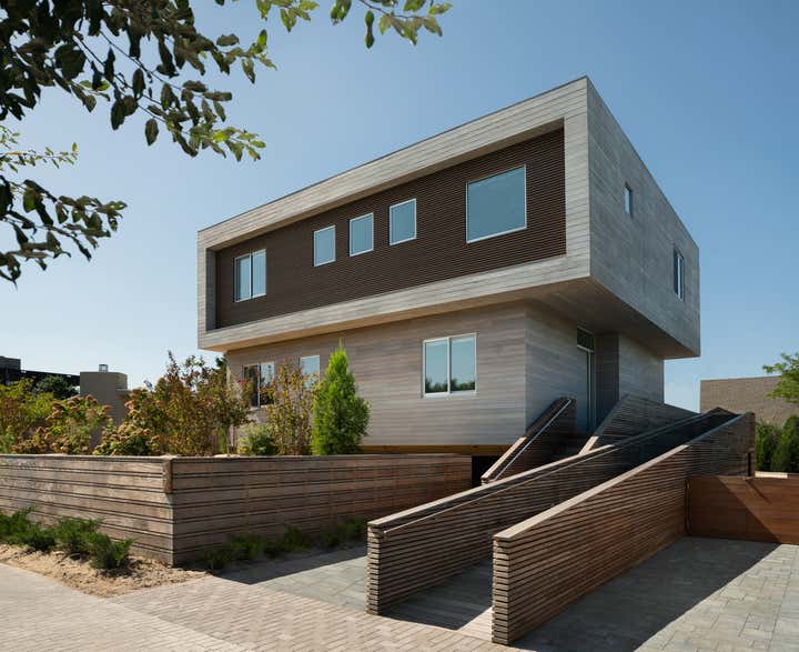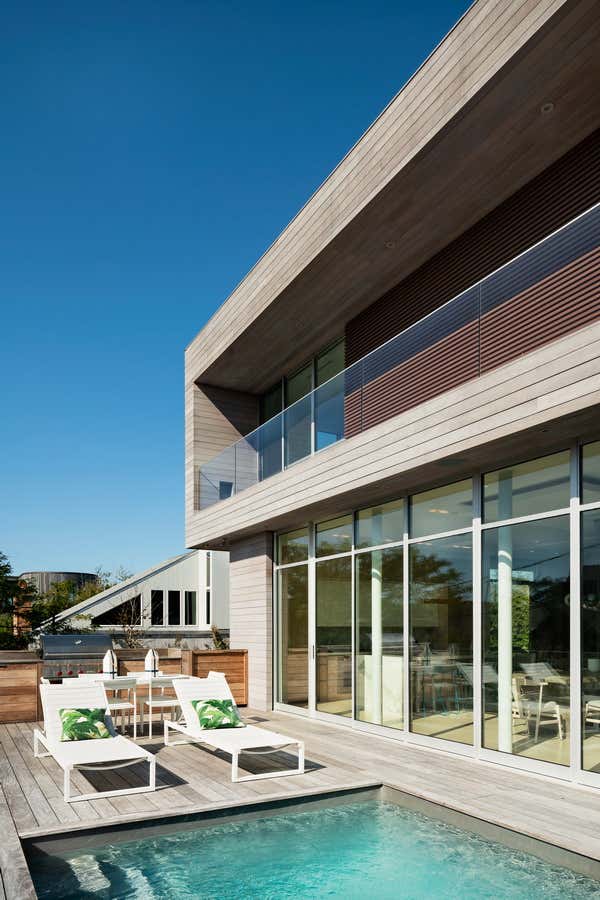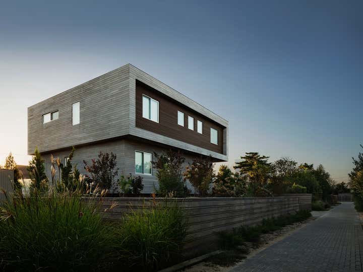 Located in the seasonal community of Seaview, Fire Island NY this beach house was built as a summer retreat for a family of six who live and work in Manhattan. A residence that would not only serve comfortably for the immediate family but would also accommodate busy summer weekends with extended family, friends, children and guests. The tight lot, paired with the clients sizable program needs, culminated in the building envelope being pushed to its regulatory limits. The resulting stacked box volumes maximize the zoning footprint and ensure the most efficient use of floor space, ceiling heights, glazed views and circulation to outdoor spaces. Falling in a FEMA flood zone, the first floor was built 8 feet above grade, suspended on wood pilings. The sanitary system also having to be constructed above grade is located in the front yard and concealed with an Ipe fenced wall, an African hardwood. Natural beach grasses consistent with local vegetation covers the top. Ipe was used throughout the exterior on the deckings, railings, skirting and fencing. A customized rain-screen clip system was used to clad the structure. With its extreme density and durability, Ipe becomes virtually maintenance free, as it is allowed to naturally silver and adapt to the local vernacular in the ever so harsh maritime climate. A small plunge pool located at the rear deck is flanked by a built-in barbecue with outdoor eating space. In the interior, rift and quartered white-washed white oak floors run throughout the house. Sliding glass door panels line the rear to allow maximum light penetration given the southern-faced exposure. The open living, kitchen and dining area, in addition to the flexibility of conjoining exterior rear deck, serve as one large entertaining space. Floating ceilings and light troughs help break up and define the spaces below. A white oak treaded staircase with bespoke stainless steel railing circulates up to the second floor.