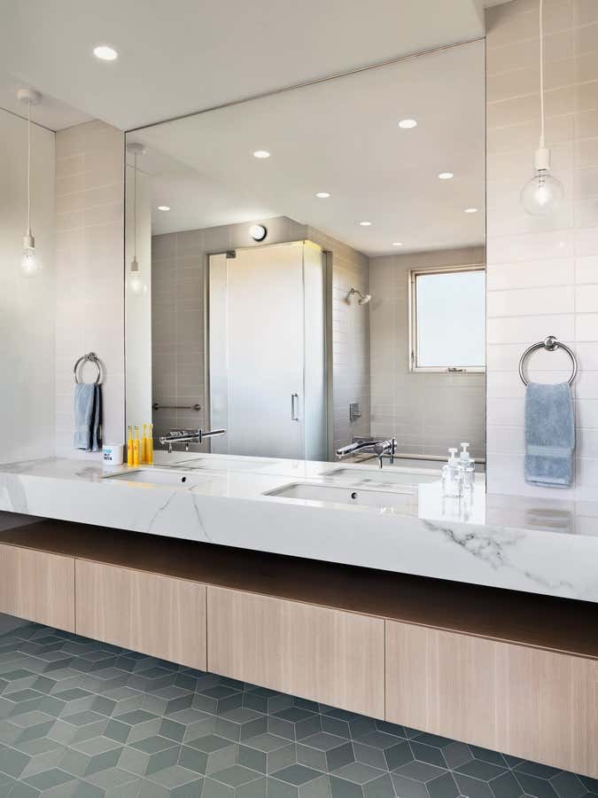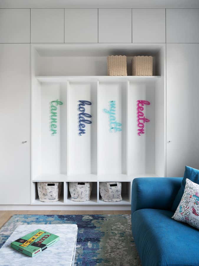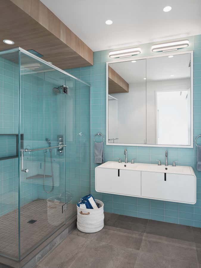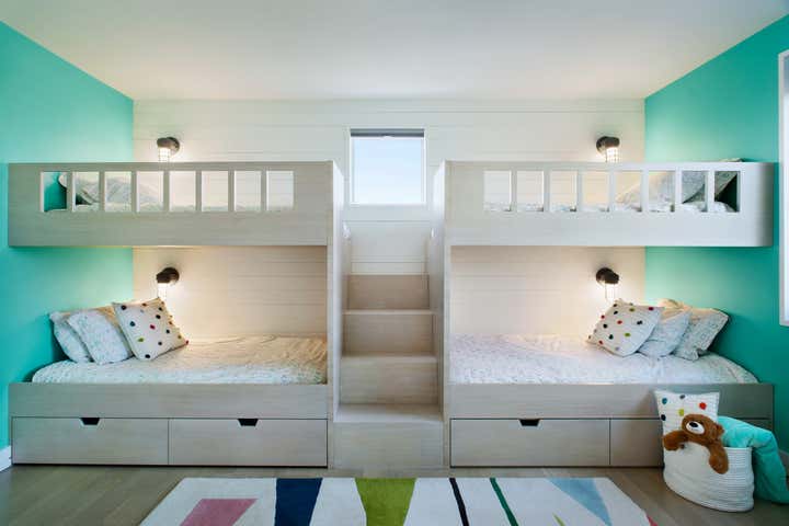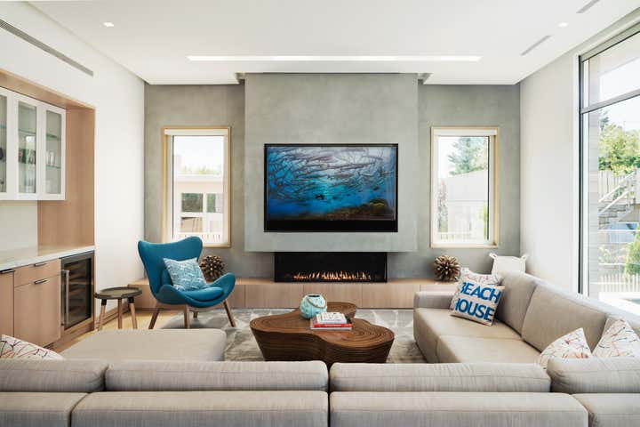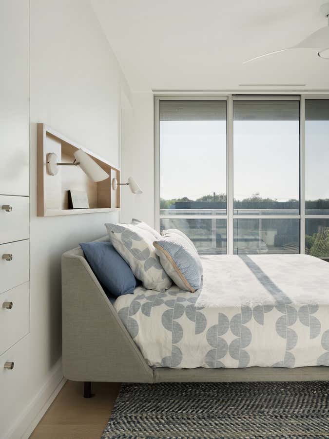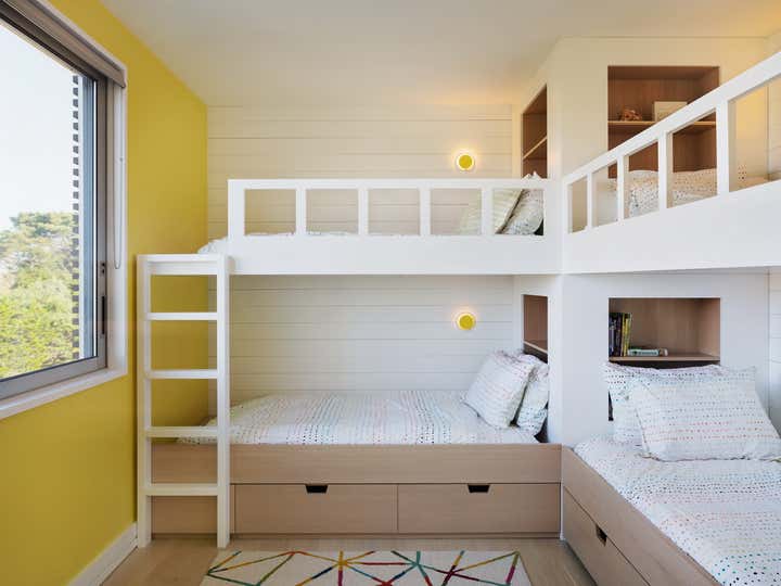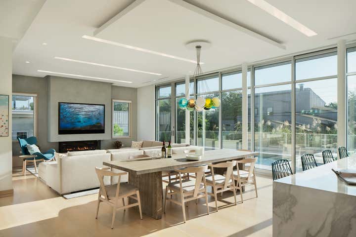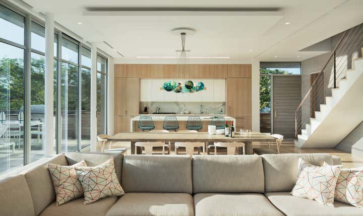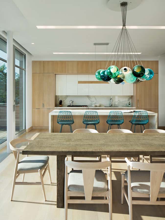 Located in the seasonal community of Seaview, Fire Island NY this beach house was built as a summer retreat for a family of six who live and work in Manhattan. A residence that would not only serve comfortably for the immediate family but would also accommodate busy summer weekends with extended family, friends, children and guests. The tight lot, paired with the clients sizable program needs, culminated in the building envelope being pushed to its regulatory limits. The resulting stacked box volumes maximize the zoning footprint and ensure the most efficient use of floor space, ceiling heights, glazed views and circulation to outdoor spaces. Falling in a FEMA flood zone, the first floor was built 8 feet above grade, suspended on wood pilings. The sanitary system also having to be constructed above grade is located in the front yard and concealed with an Ipe fenced wall, an African hardwood. Natural beach grasses consistent with local vegetation covers the top. Ipe was used throughout the exterior on the deckings, railings, skirting and fencing. A customized rain-screen clip system was used to clad the structure. With its extreme density and durability, Ipe becomes virtually maintenance free, as it is allowed to naturally silver and adapt to the local vernacular in the ever so harsh maritime climate. A small plunge pool located at the rear deck is flanked by a built-in barbecue with outdoor eating space. In the interior, rift and quartered white-washed white oak floors run throughout the house. Sliding glass door panels line the rear to allow maximum light penetration given the southern-faced exposure. The open living, kitchen and dining area, in addition to the flexibility of conjoining exterior rear deck, serve as one large entertaining space. Floating ceilings and light troughs help break up and define the spaces below. A white oak treaded staircase with bespoke stainless steel railing circulates up to the second floor.