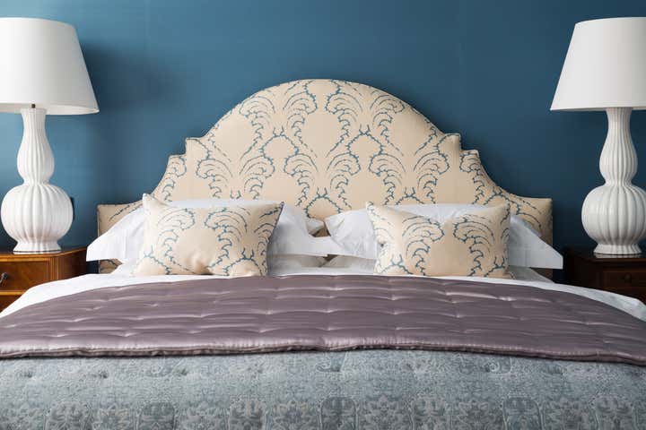 A chic London pied-à-terre where luxurious comfort is paired with a clean simplicity. Vibrant, jewel-like colour tones mix with the twinkle of antique mirror and brass. Bedroom walls are clad in blue silk and the delicately panelled and mirrored wardrobe doors and bathroom vanity were custom designed for the client.