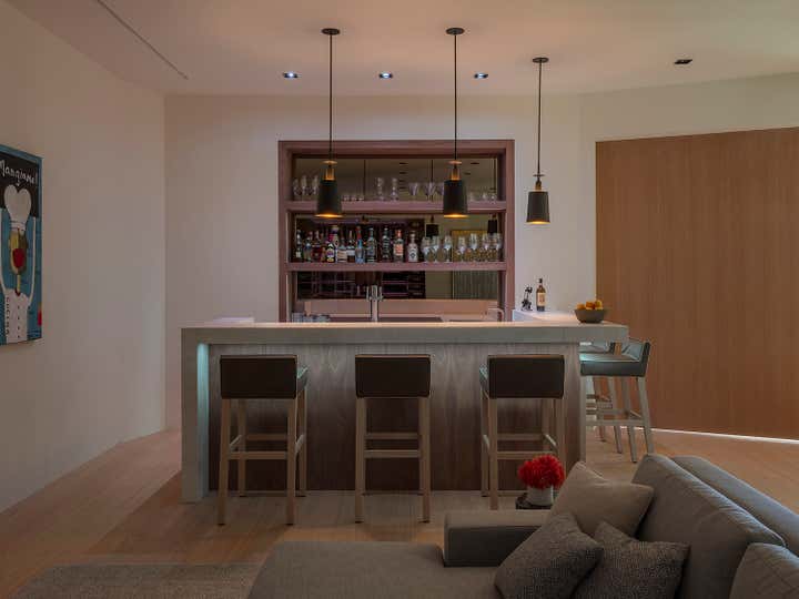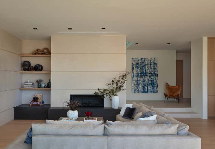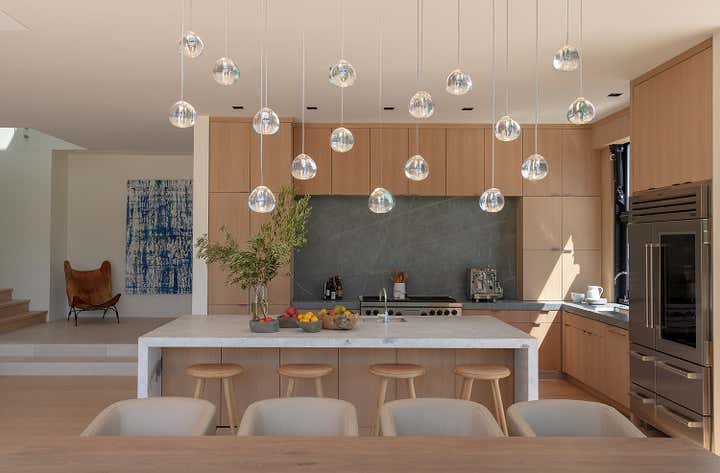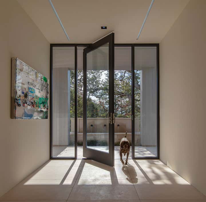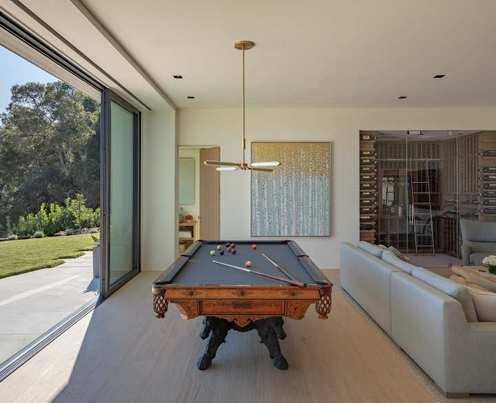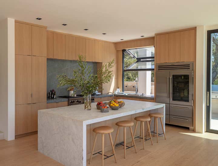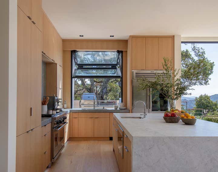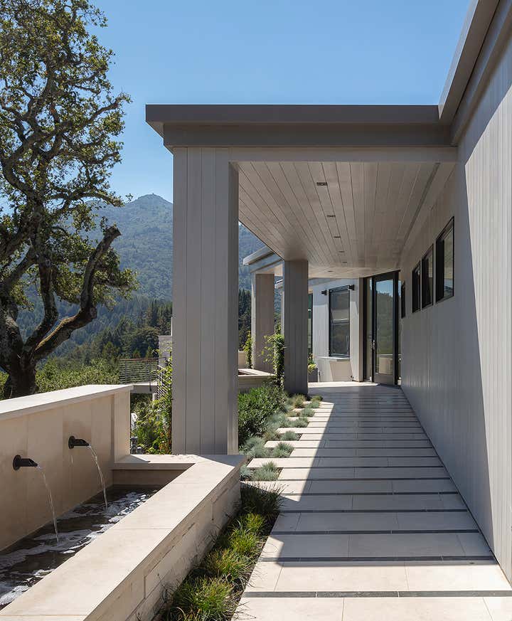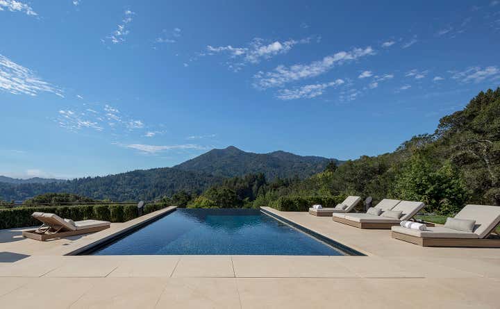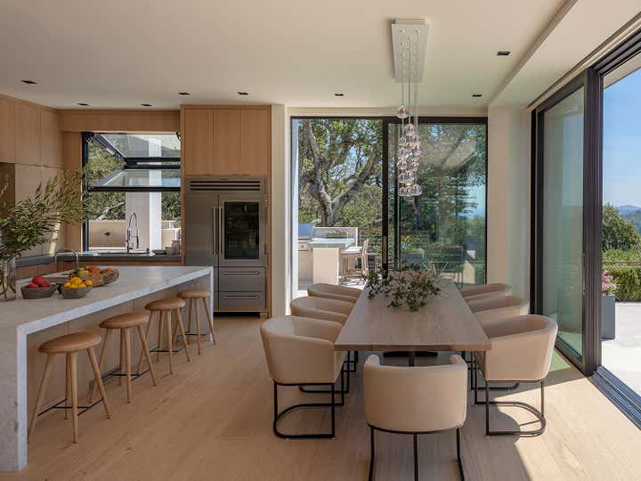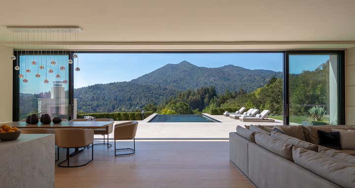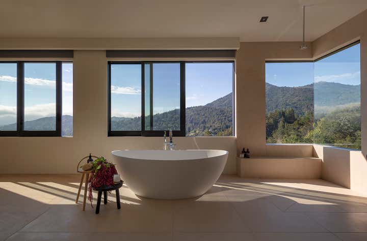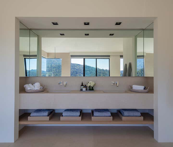 Tucked into Mt. Tam enjoy 360 degree views and the ultimate indoor-outdoor connection. This new home epitomizes California luxury and European simplicity. It was especially fun to collaborate with our talented and like-minded clients who also appreciate quality materials and contemporary design. The home is adorned with wide plank European white oak floors, grooved limestone walls, luxe Dutch hardware, and custom furnishings throughout including a steel and walnut dining table, leather saddle stitched headboard & bedframe; and spa-like bathroom design. Come slip into this slice of heaven with us…but first, go fill up your glass at the family’s onsite vineyard.