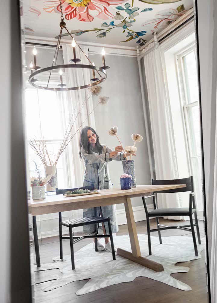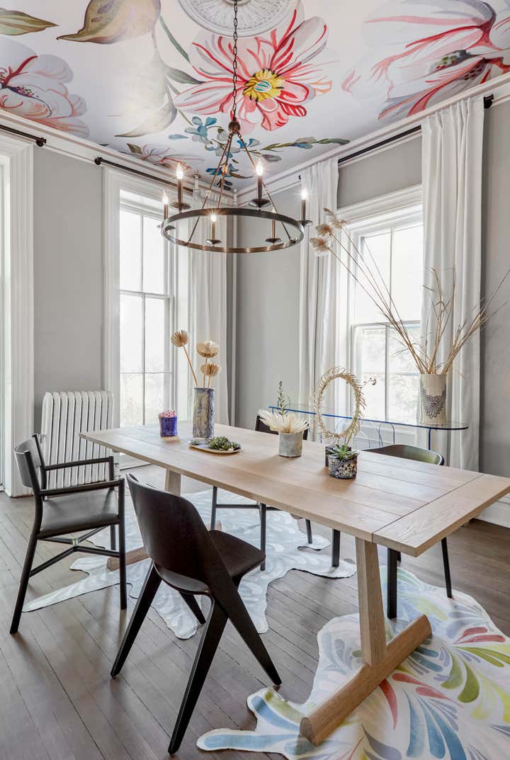 Most design showhouses are properties for sale, and each designer creates a space for viewing. It’s a great way to market the property and the designer. However, the Kingston Design Showhouse in the Fall of 2019 was at Historic Wiltyck House in Kingston, New York, that's partially used as an Airbnb and home for the owners. The room I designed is the homeowner's private dining room; therefore, we took their taste and needs into account, especially on architectural decisions. The overall style is a mixture of modern and traditional, feminine and masculine, and moody and bright, lots of depth but not overwhelming. The architecture serves as a canvas for the furniture showcased during the exhibit and then the homeowner's furniture that will occupy the space afterward. Small details such as replacing or refinishing the doorknobs, replacing the switches and outlets were not forgotten. Then more significant details such as the wallpapered ceiling, new ceiling medallion, and light fixture make a tremendous impact on the space. The wall paint is neutral enough but adds depth with its medium tone gray. Then we added a white border and mauve painted trim as an interpretation of the crown molding that's missing. During the exhibit, we had local makers from the Hudson Valley well represented through furniture, accessories, art, and floral arrangements. All are makers that I love and want to share with you; without them, the room wouldn’t be as lovely as it is. Makers and vendors include: Athabold from Germantown created beautiful floral/plant arrangements. Black Creek Mercantile & Trading Co. from Kingston displayed their natural oak Trestle dining table. Flavor Paper from Brooklyn customized their Camelia wallpaper for the ceiling. Forbes and Lomax from New York City brass switches added more character and elegance to what is usually an ignored detail. Gallery and Goods from Pine Plains loaned paper sculptures and handmade ceramic vessels. Gestalt in Hudson chairs