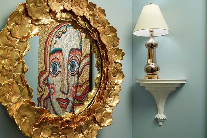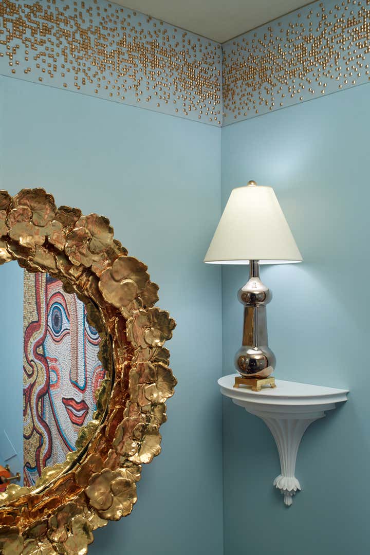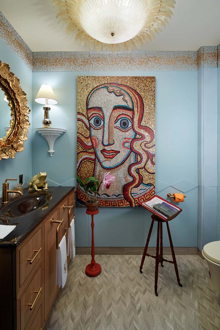 This Presentation Powder Room was completed with Kohler Co. as one of the gracious sponsors for the Kips Bay Showhouse 2016 and the help of Element Design Group. Custom blue leather walls by Dualoy crowned with a band of bespoke Ankasa embroidery on Stark fabric were able to form a worthy canvas to feature the rare and exquisite mosaic panel 'Queen of Malaren' by Einar Forseth from Modernity Gallery in Stockholm. Created in 1923 as a maquette for the Stockholm City Hall, the pane was digitally reproduced for the Showhouse. Christopher Spitzmiller created the geranium leaf ceramic mirror and the 'Hadley' lamps like pieces of jewelry for the Powder Room. Accessories by E.Braun & Co and their custom embroidered hand towels added an extra touch. The room was lit by a 'petrified' sunflower Murano glass fixture from L'Antiquaire in Westport, a gold toad and an antique dictionary stand for reading, as well as the orange toilet paper are typical 'Harry' touches.