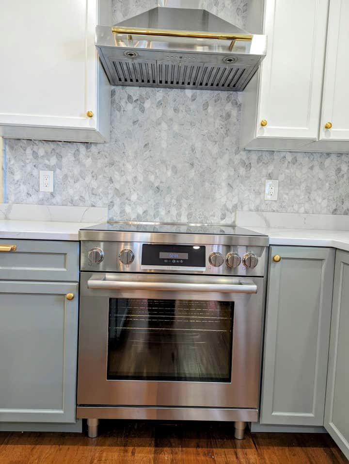 This kitchen was a complete remodel. We took it down to the studs. The house sits atop a hill so the view is of the trees and I wanted to bring that sense of nature indoors while maintaining a sense of luxury and high end as the neighborhood expects. The base cabs are sage green. The hardware is brushed gold and the marble backsplash is marble. I love the leaflet design. The small space was a challenge for functionality and a feeling of spaciousness but we did it. It's a wonderful space!