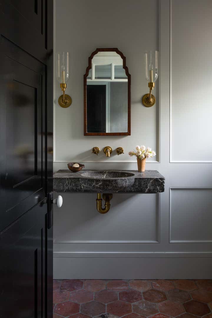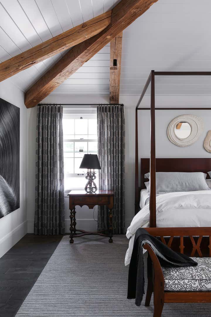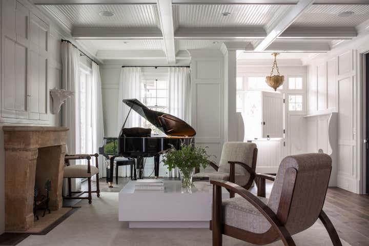 This La Jolla home defies classification. Though a new build, it feels firmly historical. Slyly beach bungalow in style, its details are more New England Colonial. Yet its formal tendencies are balanced with clear-cut casual moments. “The beach bungalow was really our jumping-off point because Hawaii is a very meaningful place for our clients,” Meier says. “But they also craved a sense of history and the visual intrigue that one sees in Colonial and Federal-era homes.” The floor plan casually welcomes while revealing refined moments like custom millwork and gracious antiques. In the entry, unexpected sentimental elements instill a sense of place and create a home that feels lived in and time honed. Simultaneously formal and carefree, the living room boasts the same confident coastal palette as the entry. Reclaimed-wood floors, millwork wall panels, and a salvaged 19th-century cheminée add character and depth. In the dining room, antique chairs upholstered with a graphic fabric surround a contemporary pedestal table. Textural hand-troweled plaster with a metallic tinge complements classic wainscoting. The palate meanders into a kitchen that feels both contemporary and deeply rooted. A hand-painted tile backsplash in shades of blue and green shimmers against light cabinets and quartz countertops. Striking leather bar stools inject a sense of weightiness, balancing the light scheme. Similarly theatrical, a black-on-black painting by James Austin Murray elegantly juxtaposes off-white walls, reclaimed beams, and a mahogany four-poster in the master bedroom. Fabrics with subtle pattern and organic movement soften hard lines. A serene extension of the bedroom, the master bath epitomizes a focus on quality versus quantity. A French drapier table topped with stone forms a vanity. Floor planks in a boxed mitered layout accentuate a pewter tub.