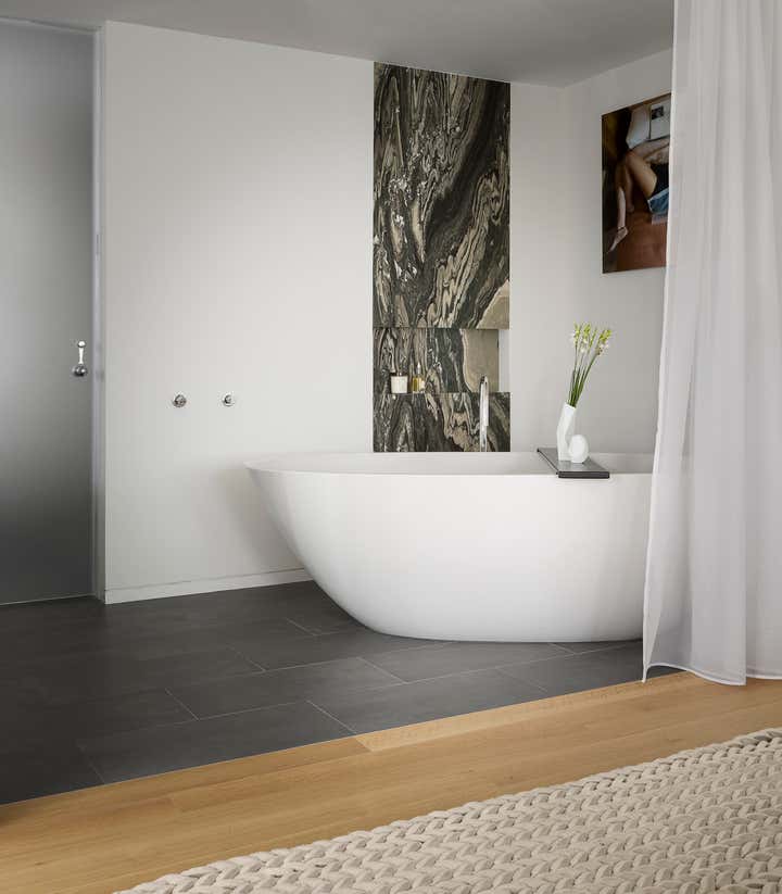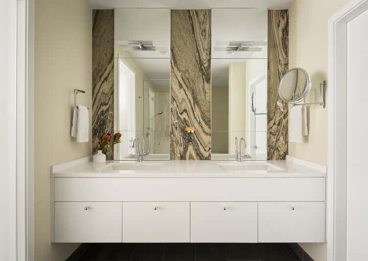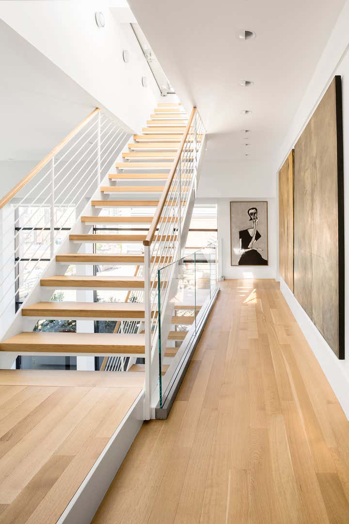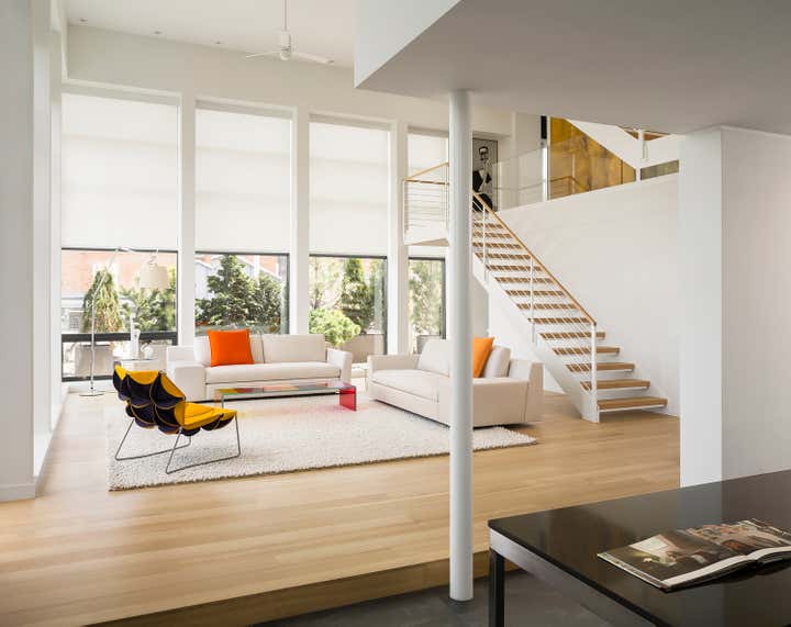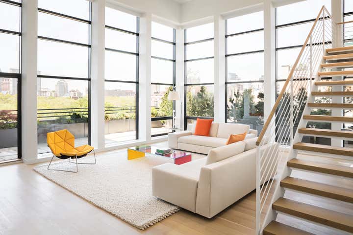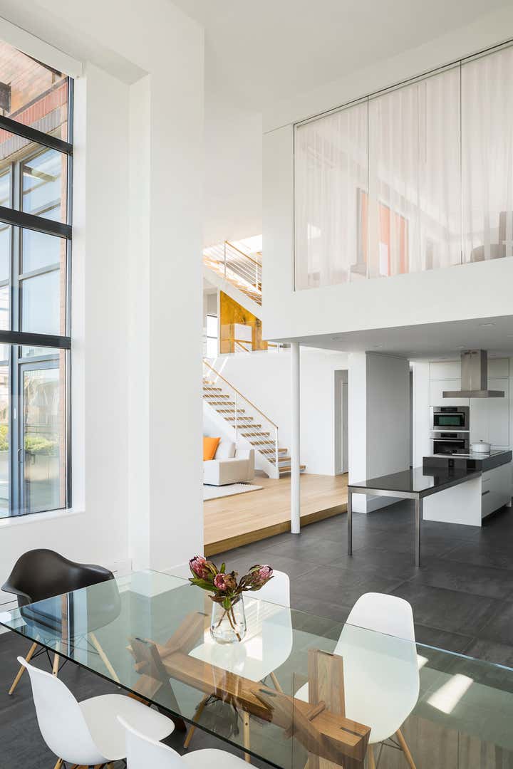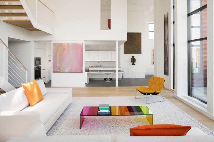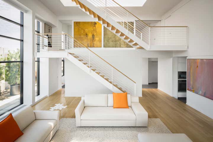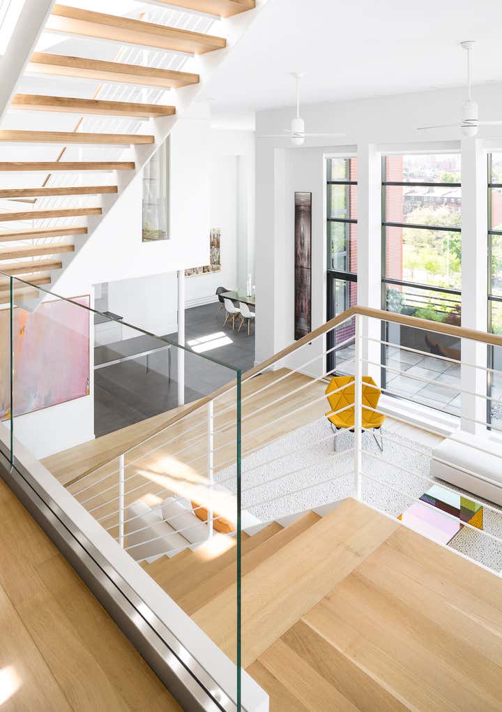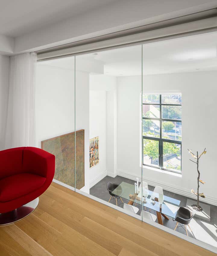 Focused around the client’s collection of contemporary art and appreciation for natural light and color, the design of this duplex penthouse loft is characterized by clearly defined volumes and a minimalist material palette. Located within H+A’s Laconia Lofts building, the living room’s double height space frames spectacular skyline views of Boston’s Back Bay and is connected to the upper bedroom level and roof terrace by a prominent staircase. All of the adjacent rooms and spaces, including a chef’s kitchen, three bedrooms and a study, physically and visually flow into one another while maintaining their sense of definition and privacy.