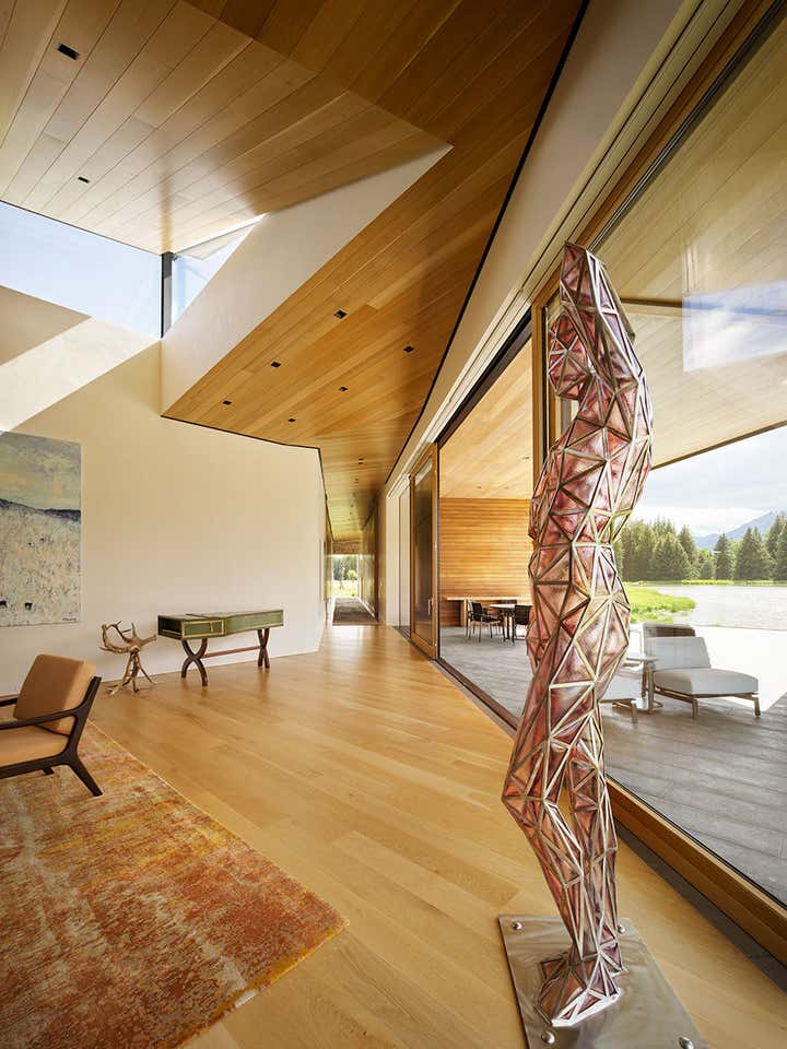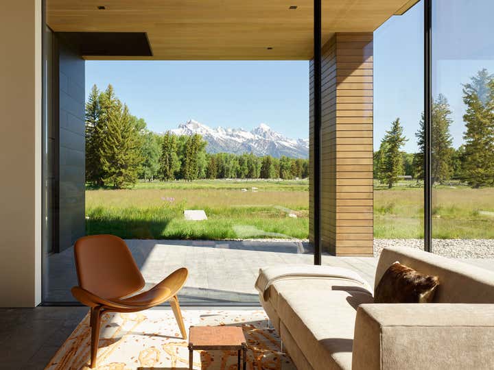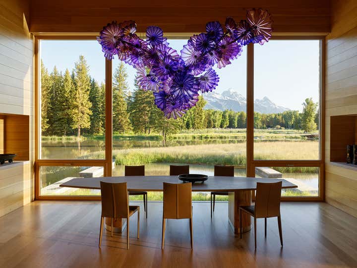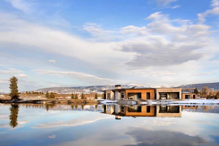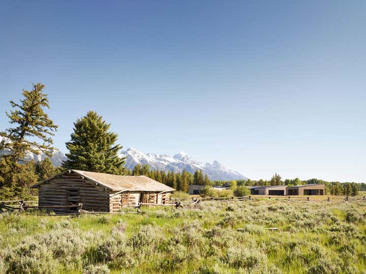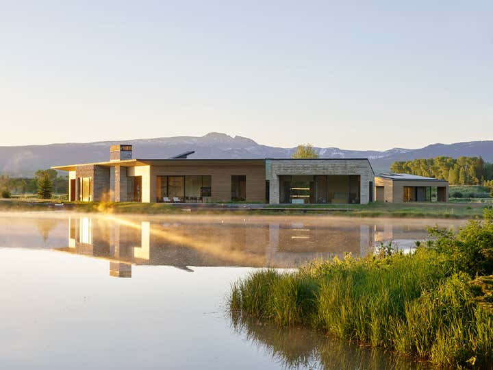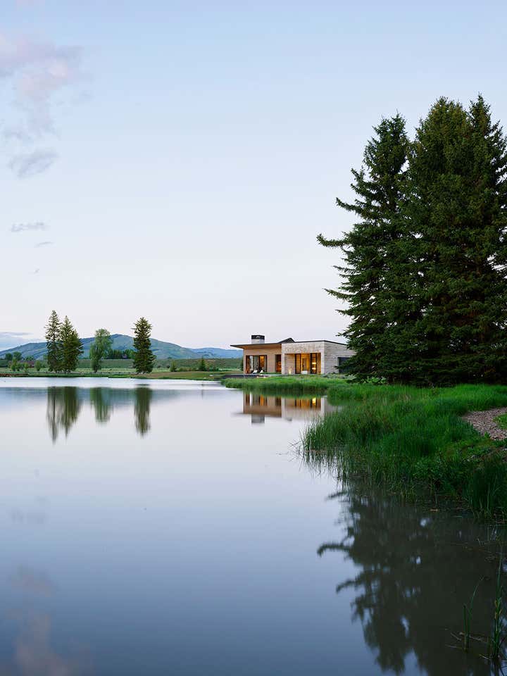 Lefty Ranch is located on the historic bed of Wyoming’s Snake River on a 35-acre property with remnant corrals and outbuildings ranging across it. A stand of mature pine trees forms the western boundary of the property, which features a large pond that reflects the surrounding views of the Teton and Gros Ventre Mountain Ranges.