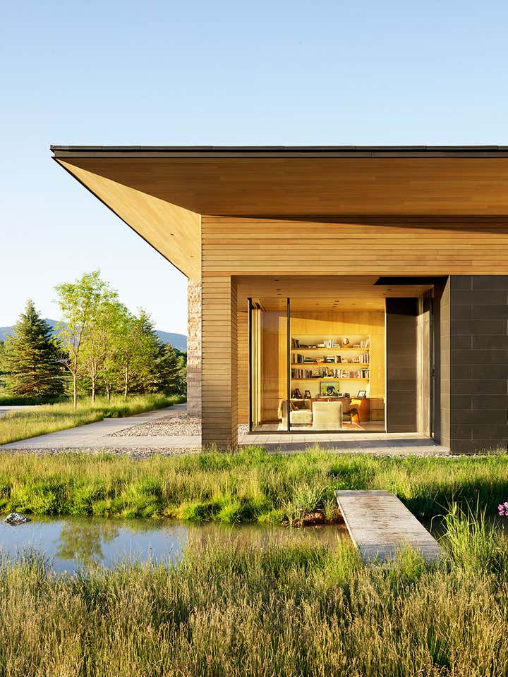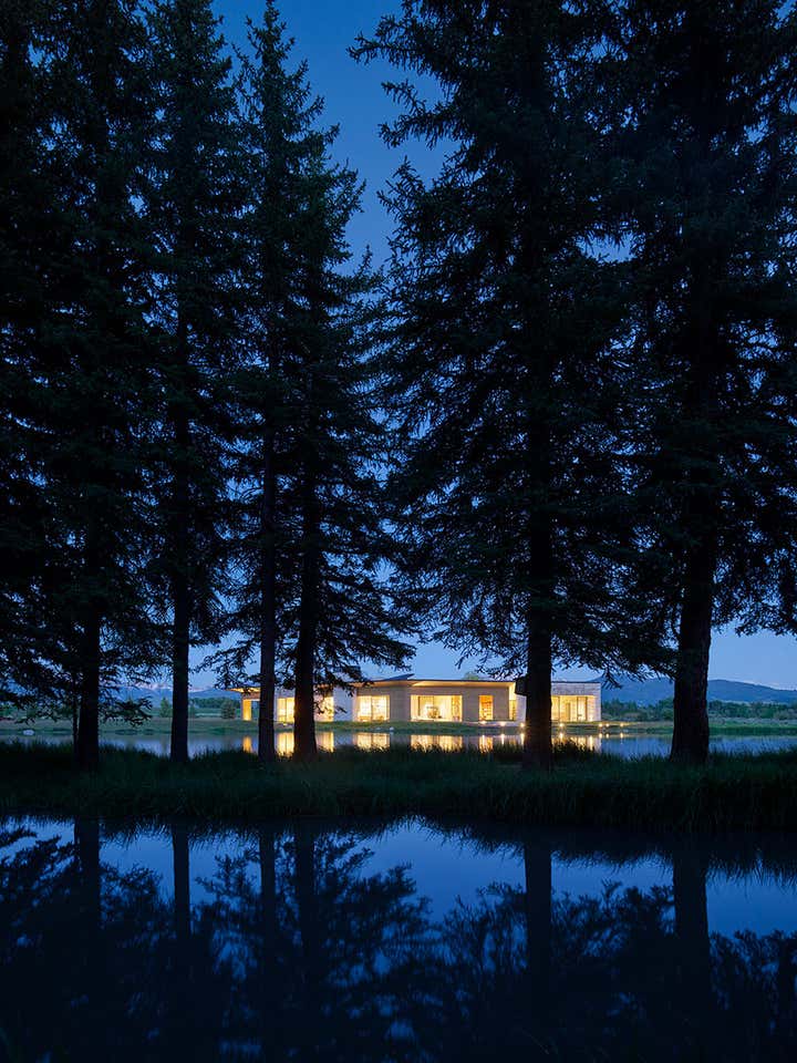 The main building is inspired by the regional vernacular expressed in “loafing sheds,” traditional agrarian structures used for shielding livestock from the elements. The home is contained under a single shed roof, its shape articulated to define a south-facing interior courtyard where an ornamental maple tree serves as focal point. The structure’s simple form is abstracted, with deeply carved overhangs that create shelter and signal entry points. Views of undulating ridges and valleys are mimicked in the building’s profile, while generous glass expanses create transparency. A roof connects the living space to the edge of the large pond, where stairs descend from the terrace directly into the water.