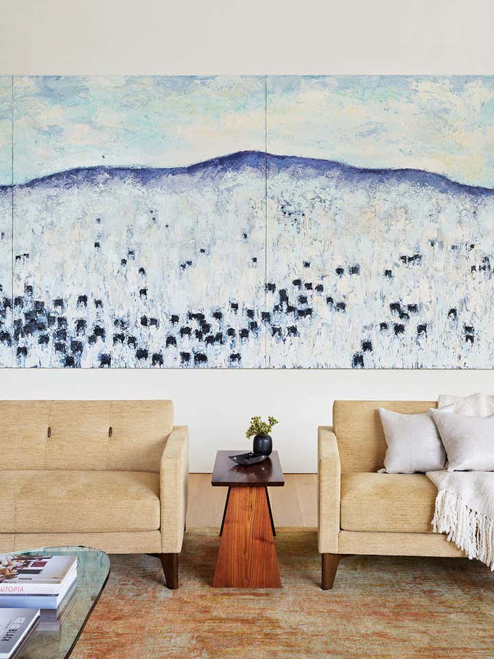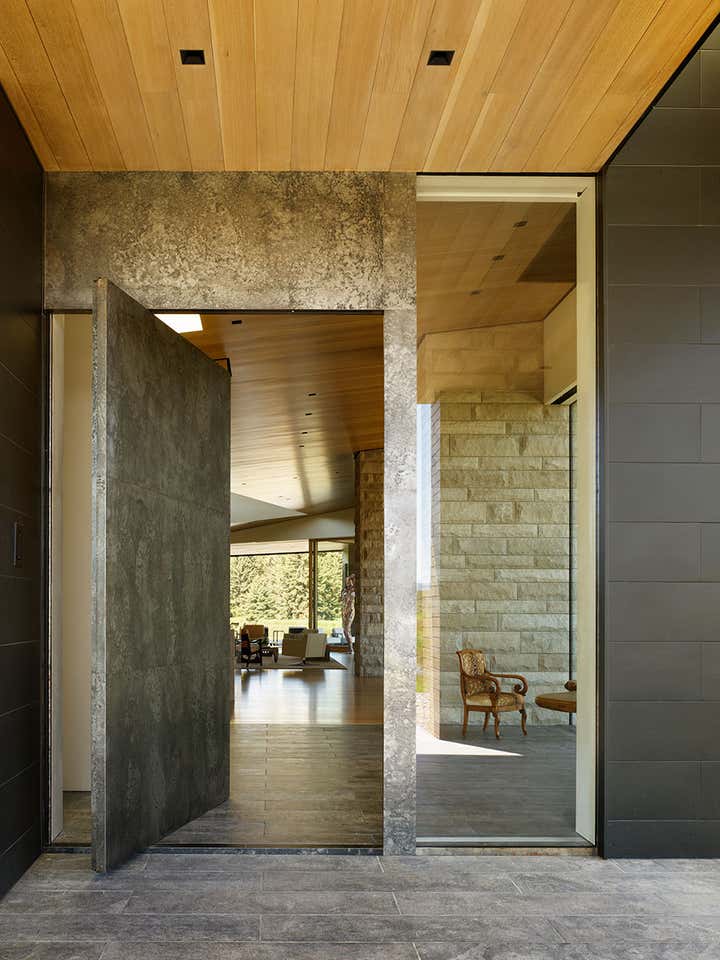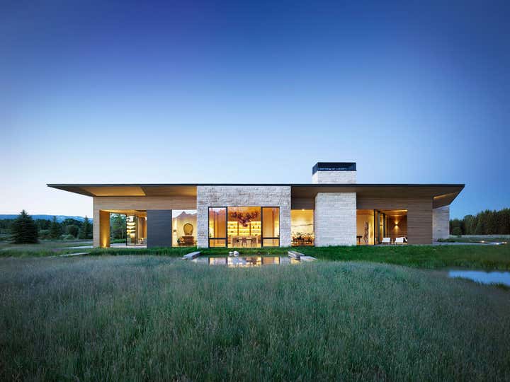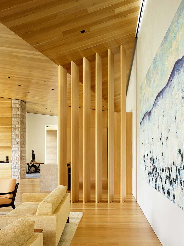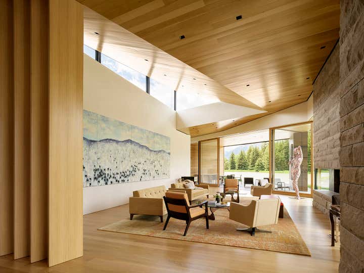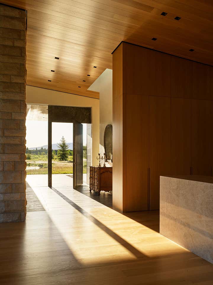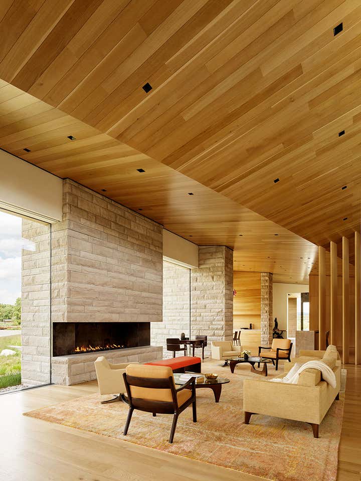 The main house is clad in limestone, each stone face chiseled to create depth and texture. Inside, the living room features an aperture in the sloping ceiling oriented to draw southern light, which traces the room during daylight hours. A reductive interior palette features ceilings and floors of white oak and locally quarried limestone. Deliberately placed glazing serves to admit light and frame views to privately commissioned artworks and the dramatic surrounding landscape.