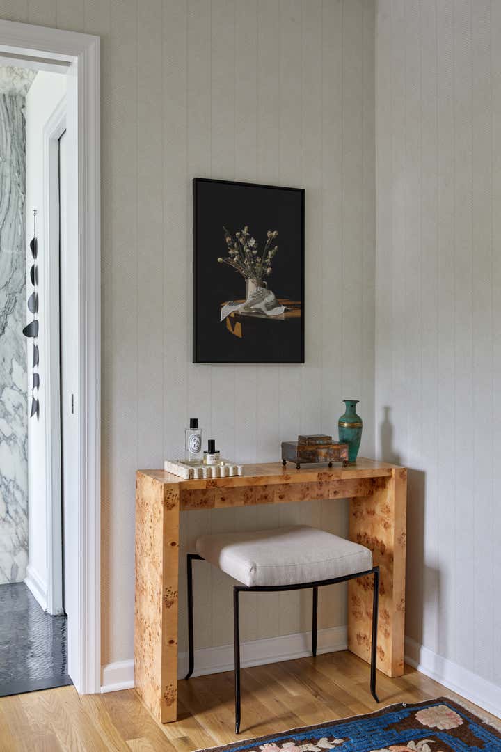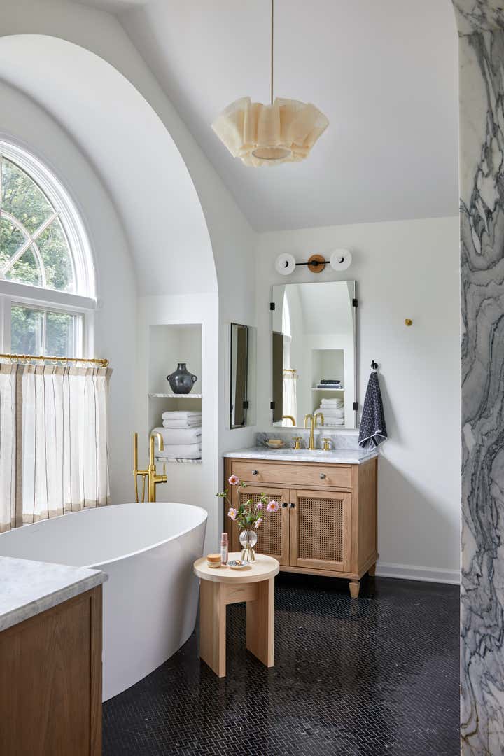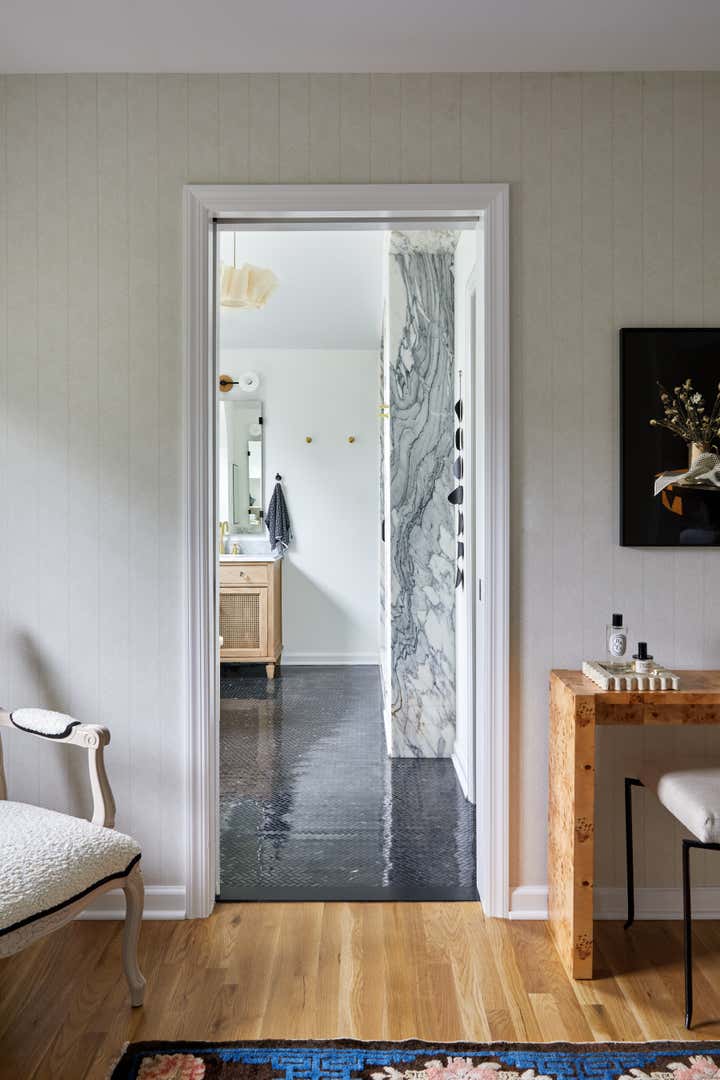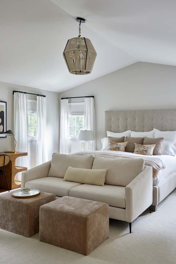 Textured, neutrals with a flair for cool was the creative brief for this family looking to upgrade their primary suite. A complete renovation of the bathroom allowed the infusion of varied materials like marble, ceramic, and oak; a combination that exuded understated luxury. In the bedroom soft linen curtains, a cozy wool carpet, and a cotton woven light fixture create a soothing retreat perfect for relaxation after a long day.