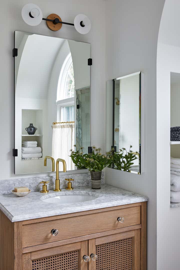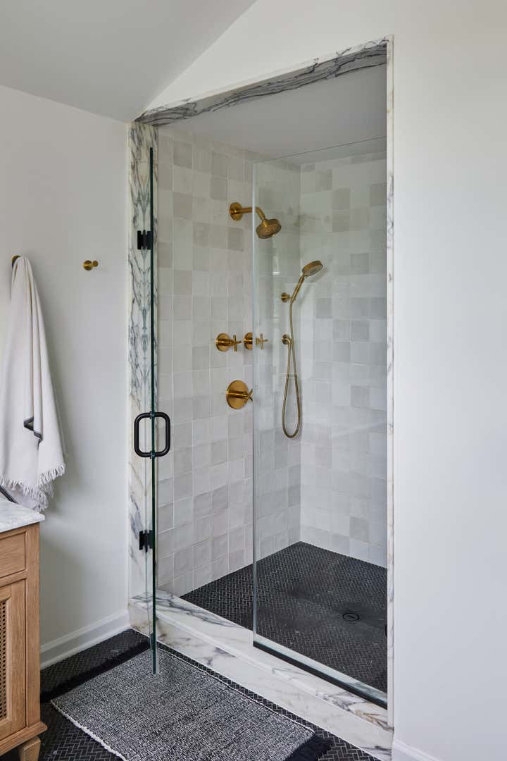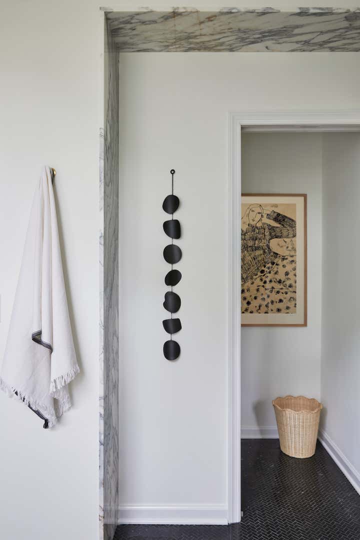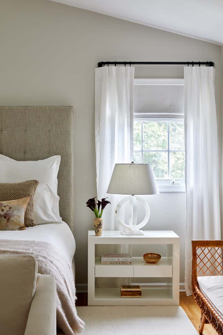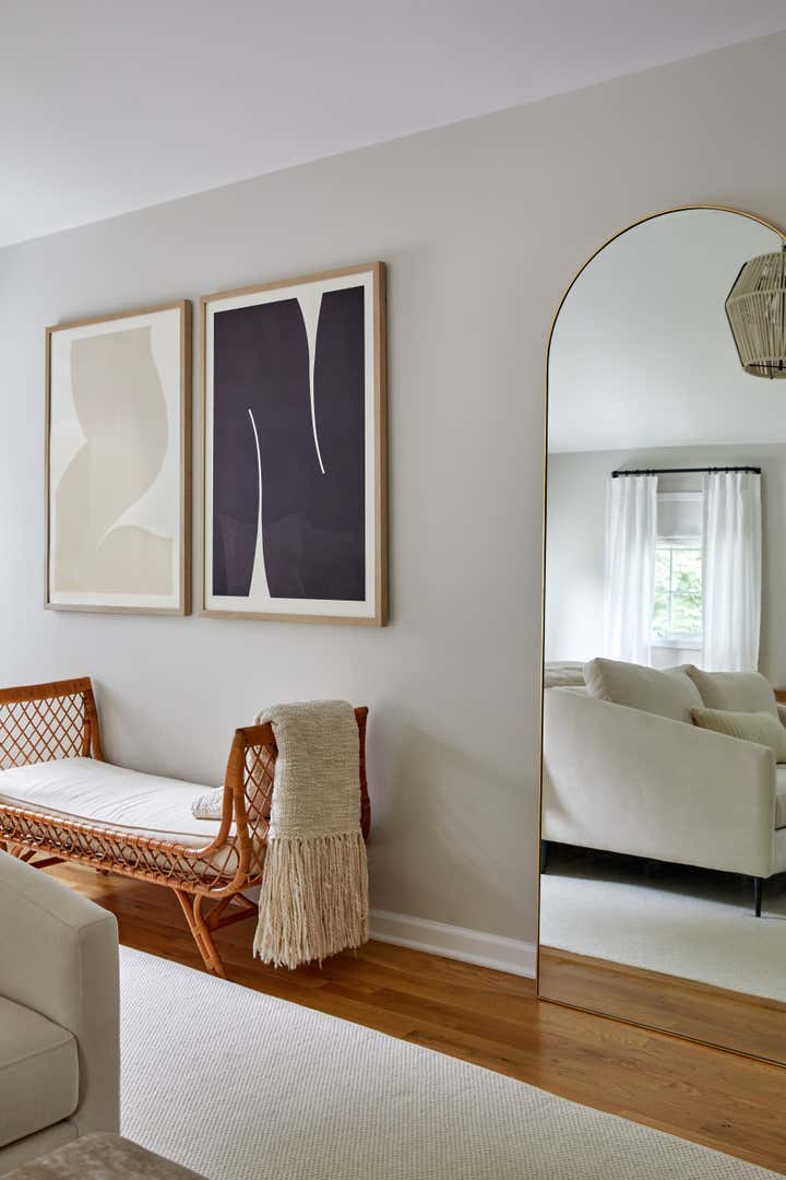 Textured, neutrals with a flair for cool was the creative brief for this family looking to upgrade their primary suite. A complete renovation of the bathroom allowed the infusion of varied materials like marble, ceramic, and oak; a combination that exuded understated luxury. In the bedroom soft linen curtains, a cozy wool carpet, and a cotton woven light fixture create a soothing retreat perfect for relaxation after a long day.