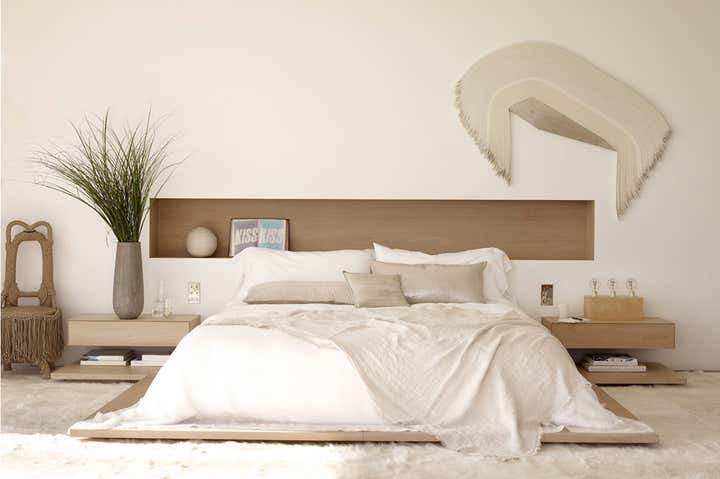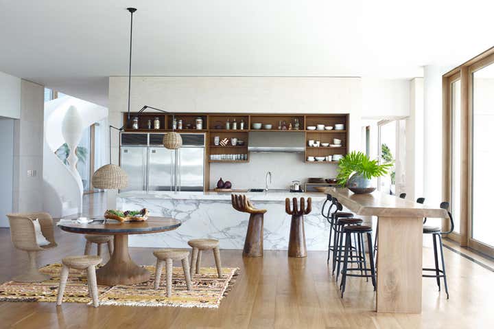 This is my home, the place where I most like to experiment, and the most pure expression of my personal design aesthetic. The house has evolved into something of a laboratory for my work, I am always moving things around, doing interventions on existing pieces or prototyping new designs, most of which end up here not always to my husband’s delight. The architecture is classically modern, with large volumes of limestone and glass tempered by matte plaster walls and warmly toned walnut floors. Most of the furnishings are either made by hand or have a hand wrought quality, with lots of vintage pieces, carved woods and textiles from around the world. The curved plaster staircase is a focal point meant to evoke both a nautilus shell and the powdery whitewashed tones of the Greek Islands. Our favorite gathering place is my husband’s library which glows at night from lighted bookshelves and where he usually presides from behind his desk, made from a discarded section of metal retaining wall.