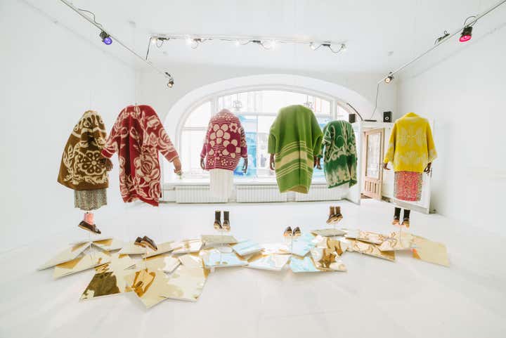 Borrowing its name from the Estonian title for Chekhov’s novel “Let Me Sleep,” the conceptual collection “Longing for Sleep” is about the haunting wish to sleep during dark wintery times, kaamos. Kaamos is an untranslatable word only known in Estonian and Finnish languages, referring to the period in the Northern Hemisphere when the days are very short, and it barely gets light outside. To materialize the feeling of a wish to stay in bed wrapped in a blanket all day long, Marit Ilison has created a collection using vintage Soviet wool blankets. Some of them
