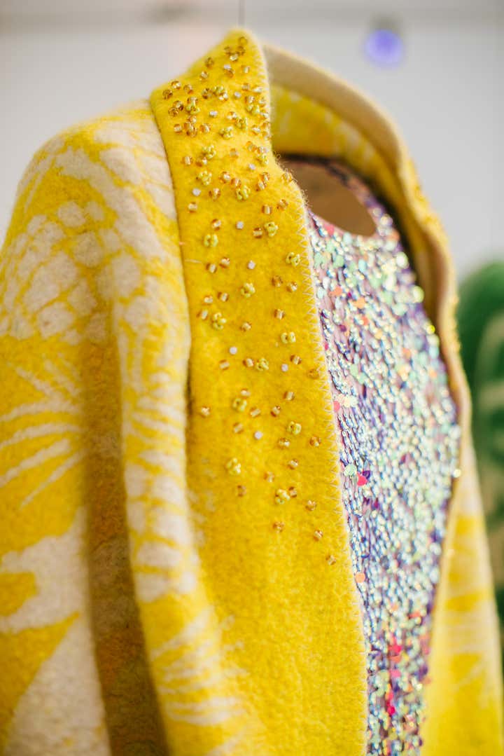 Reflecting Marit Ilison’s trademark of translating feelings into beautiful physical matter, there is a reason why the embellishment is discretely hidden inside the coats. Though she’d like to stay wrapped in a blanket for a whole day during deep winter, she hears a pricking conscience whispering in her ear that she should be working instead. This little voice is like sand on her side or a pea under the mattress, which won’t let her fall into slumber. Therefore, she has translated this feeling into the rich embellishments inside of the coats, which also reflect an idea of a secret dream world inside the coat, shimmering with beautiful dreams. We use the best crystals and create unique embellishments for each piece.