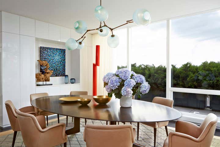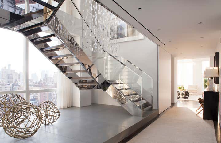 Nestled atop The Lucida, the first LEED-certified luxury residential tower on the Upper East Side, sits an expansive duplex penthouse featuring dramatic double-height spaces and breathtaking panoramic views of the Manhattan skyline. Designed for an active family, the layout is intelligently organized into four distinct zones: an opulent living and dining wing perfect for lavish entertaining; an ample family area with den, kitchen, and breakfast room suitable for casual gatherings; a luxurious master suite and home office; and finally, a lively color-blocked children’s wing with airy bedrooms, play area, TV lounge and an imaginative “study hall”, featuring bright, dedicated study carrels for each child. At the core of the residence, around which all these spaces pivot, is the home’s centerpiece: a gleaming foyer, featuring a floating chrome and glass staircase, elegantly set against a framed vignette of an iconic New York City vista.