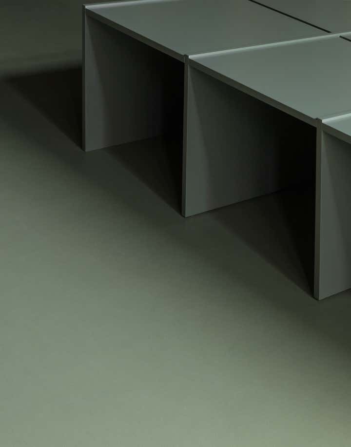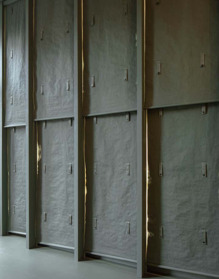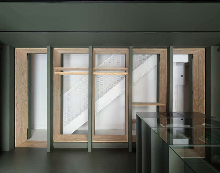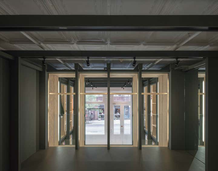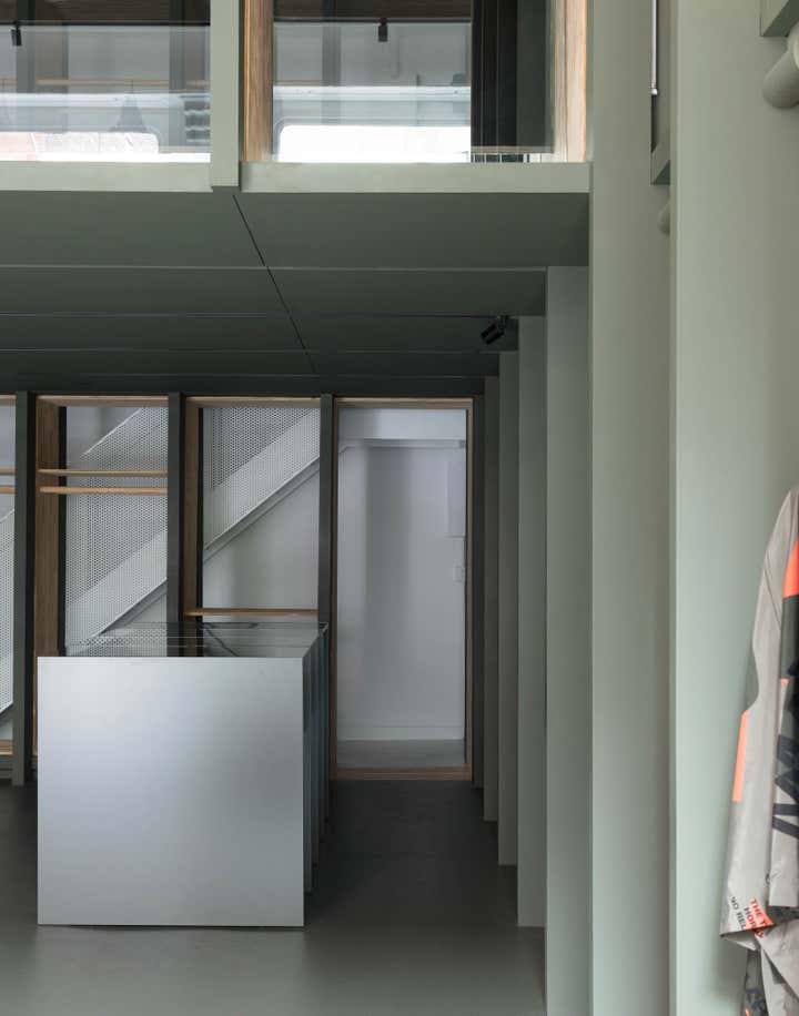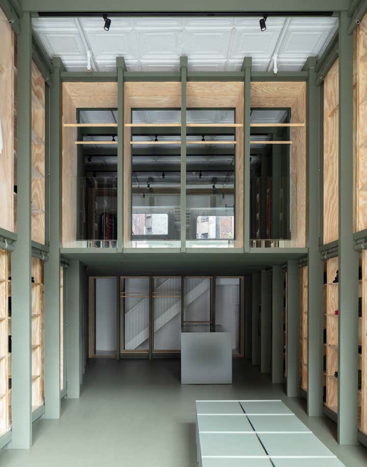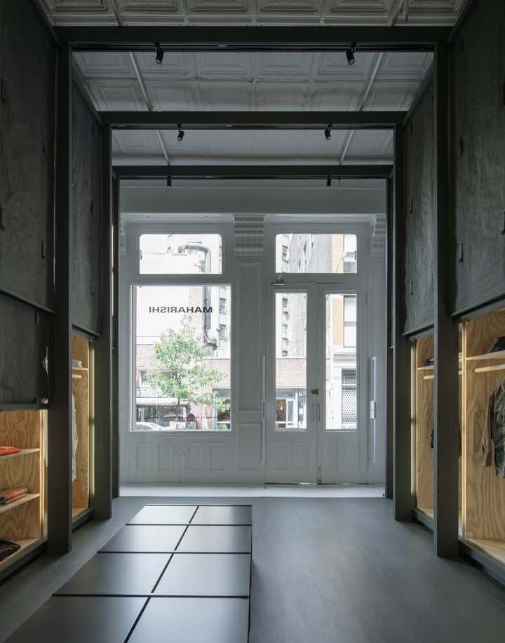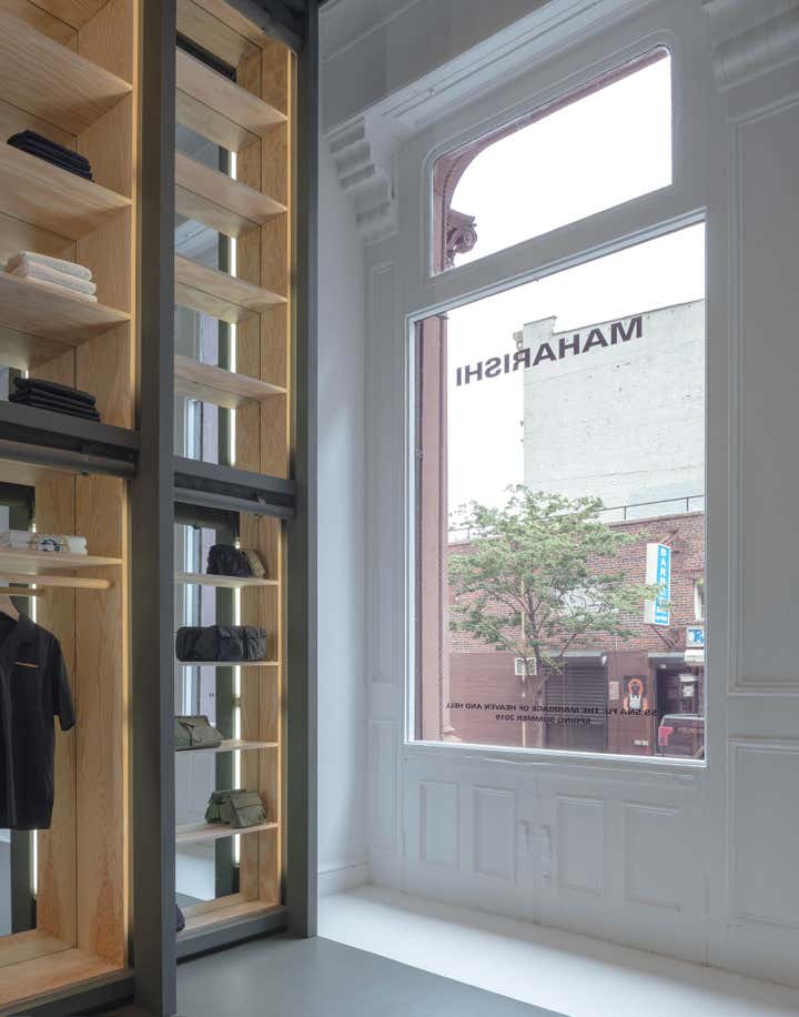 Situated in a landmarked Tribeca loft building, the new US headquarters for British clothing brand maharishi is both a showroom and distribution hub. A kind of building-within-a-building, the project preserves the space’s details by placing the new shop inside the historic interior, floating within it. A grid of cabinetry defines the insertion, marking out two levels: halfway through the space, a mezzanine levitates above the shop, creating another, more intimate room.