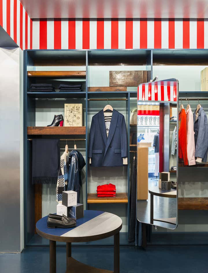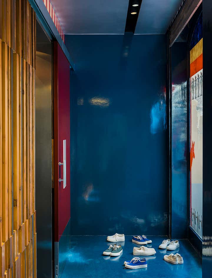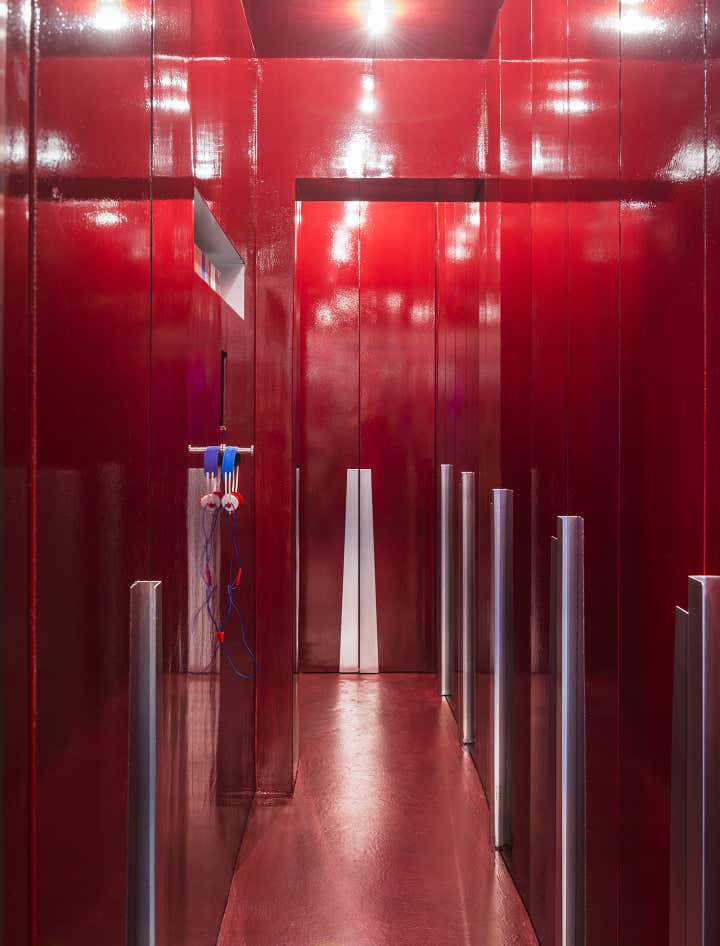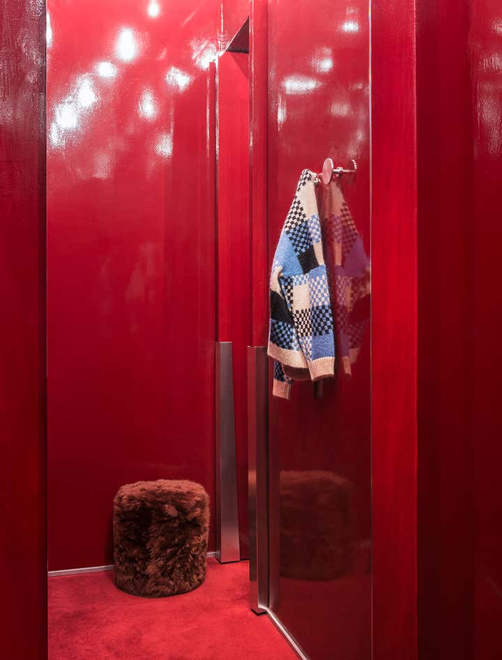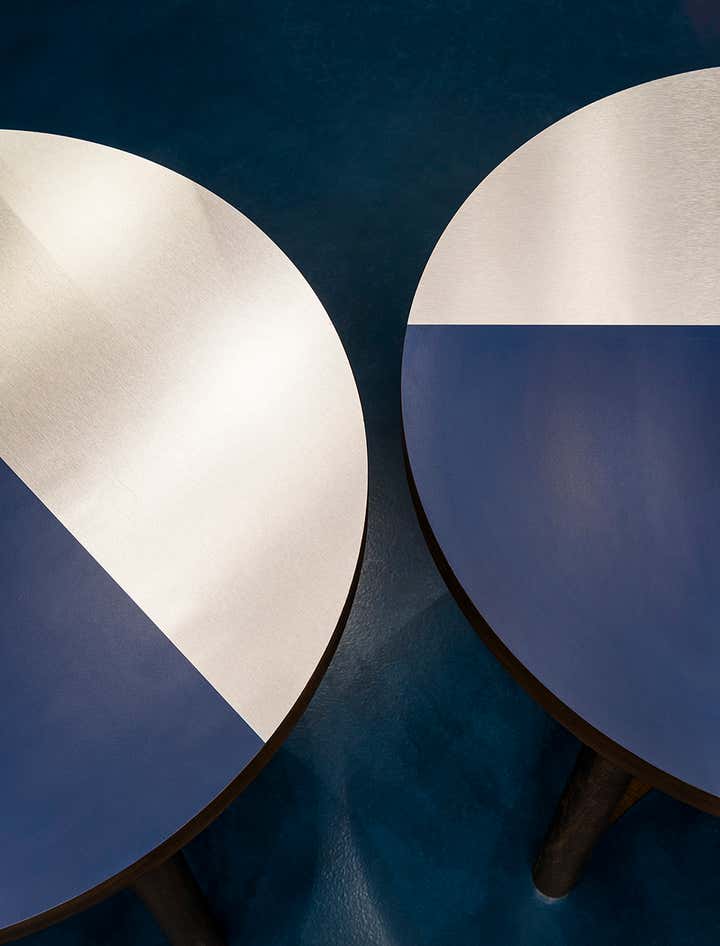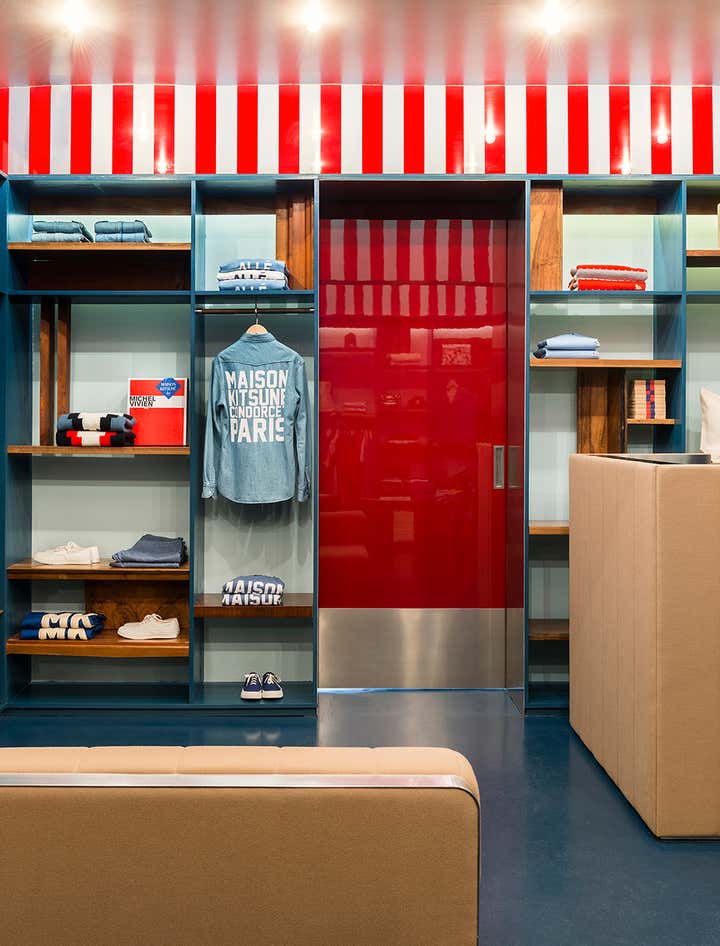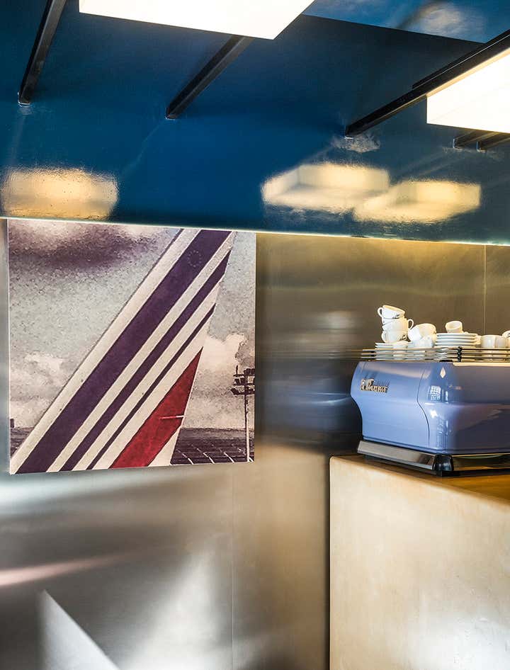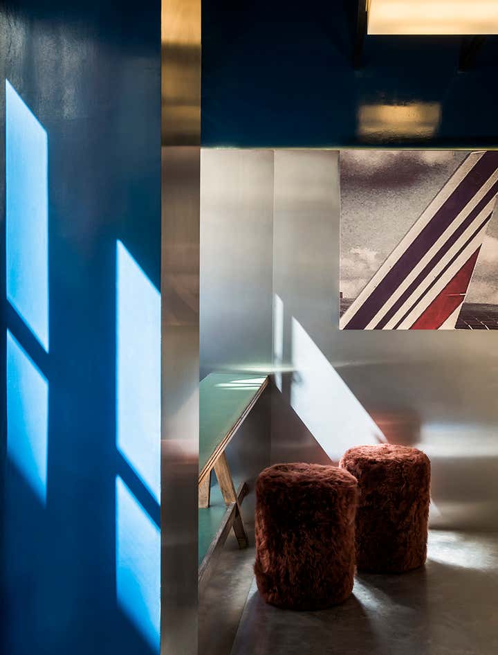 Each environment flows adjacent and into the next, smoothly and softly. Satinated aluminium covers the walls, portals and floors. Lapis glaze resin coats the floor and ceiling. The vertical graphics are carmine. Recuperated wood with a variety of essences and dimensions reshaped and 'made to measure'. The ad hoc illumination with Edison's transparent bulbs used as ceiling light. The small tables are in laminated blue and Ivory wood. The cafe's seating is on amaranth fur and the board is in fibreglass. The boutique sofa is lined with woollen jute cloth as is the cash counter.