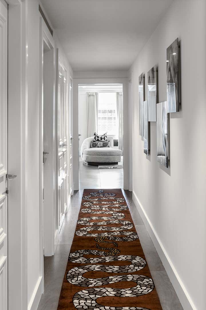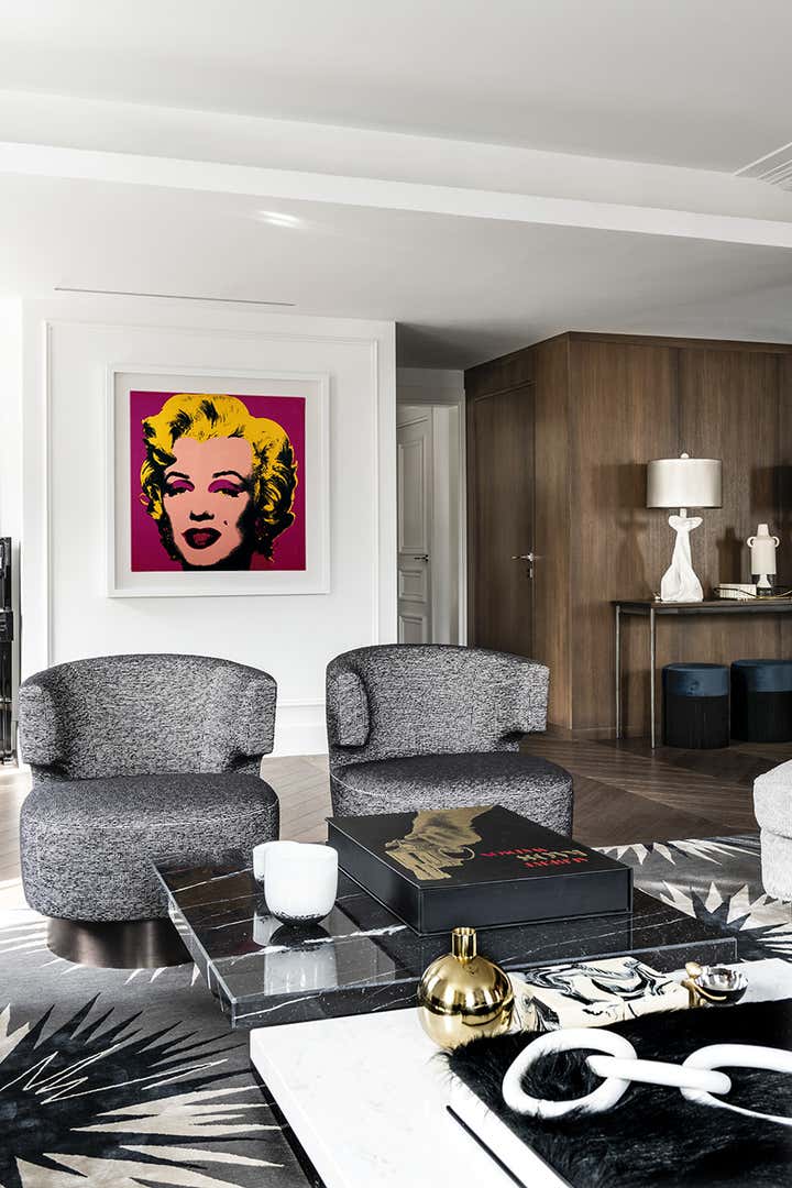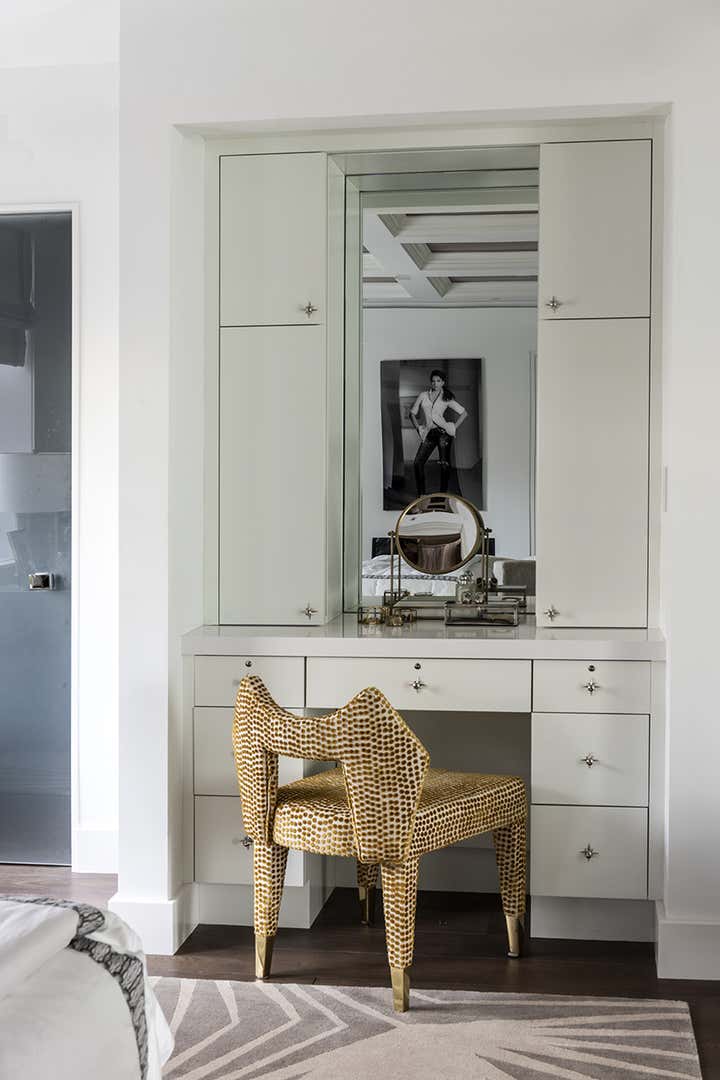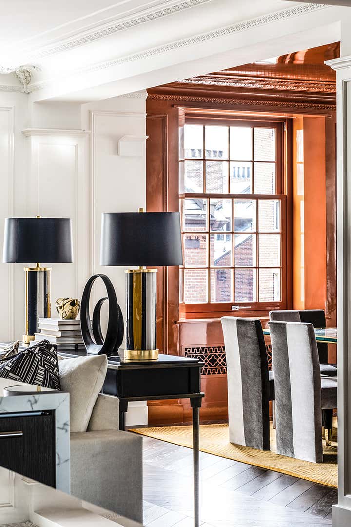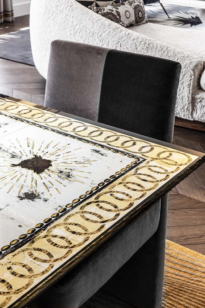 The first concept presented to the client was the lacquered, cognac stripe on the dining room ceiling. To highlight the Mathieu Lehanneur light fixture/art installation, the bold stripe was painted in the rich color of cognac to not only add warmth for Boston’s colder climate, but also a wow-factor. Pulling from the homeowner’s Italian heritage, an artist was commissioned to back-paint the glass of the dining room table in the eglomise style, with an Italian- influenced motif. The custom dining chairs are split with two shades of gray fabric. When pushed together, the chairs create wide vertical stripes all around, producing an interesting play of color blocking. This striking dining room is seen immediately upon entry, making a daring design statement.