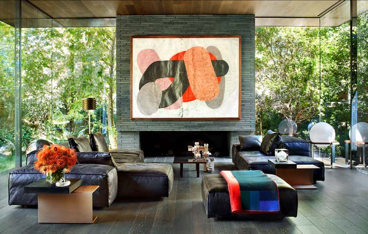 Against a backdrop of dark finishes and metal accents to bring the surrounding garden to the forefront, the interiors are designed for both relaxing and regaling. Our wood and metal shops built custom pieces—including a dining table, side tables, and a pool table—in a palette of solid woods and metals, including smoked oak, walnut, and natural and patinated bronze. Complementing the custom pieces are classic, comfortable furnishings, many dating from the 1960s.