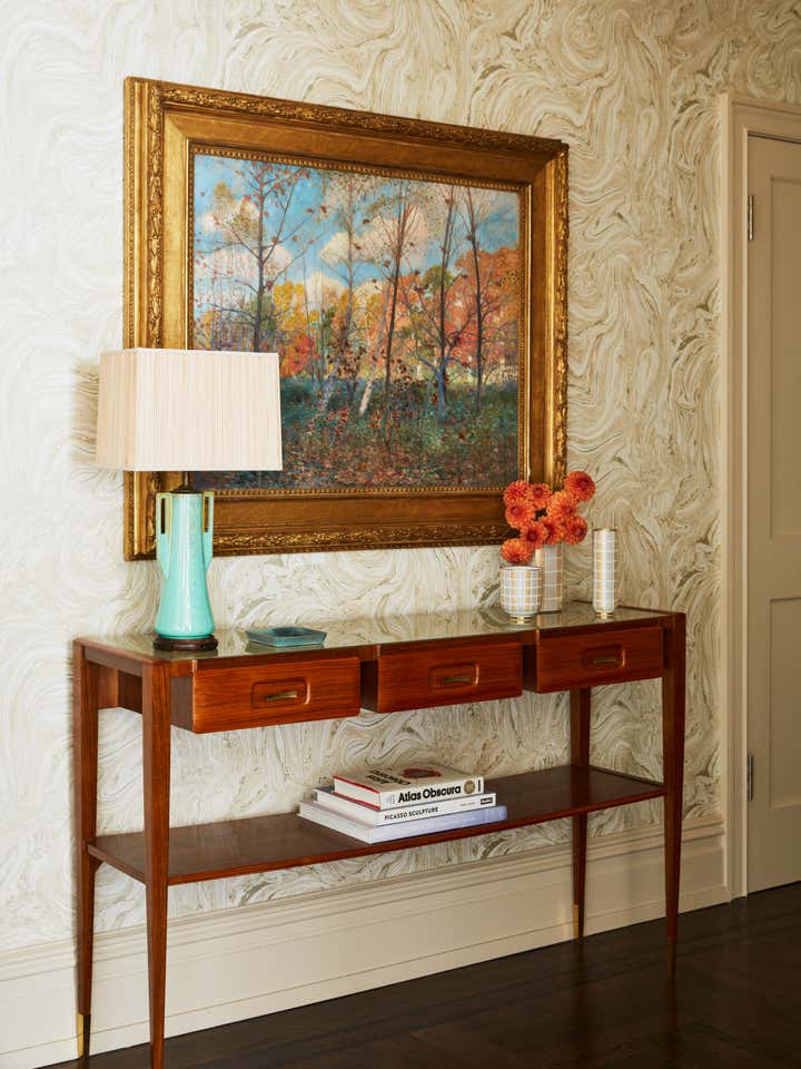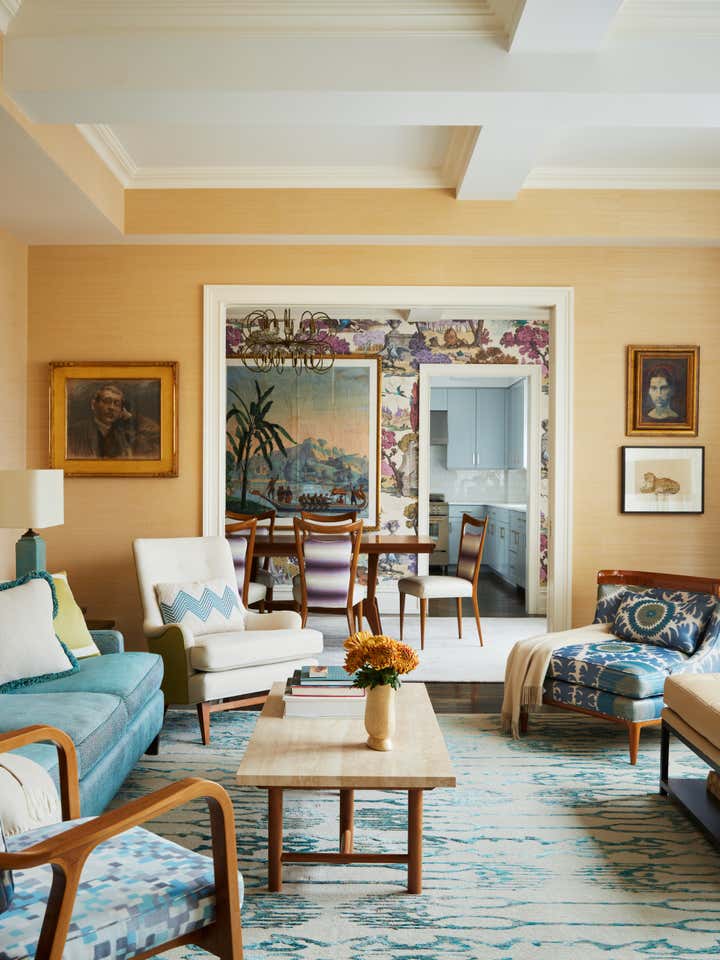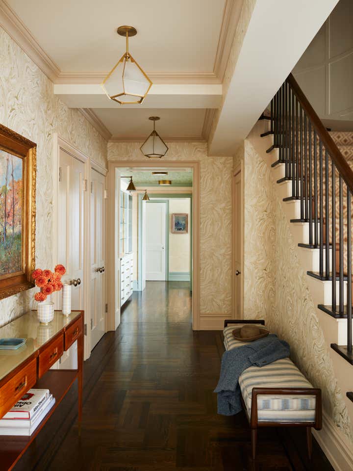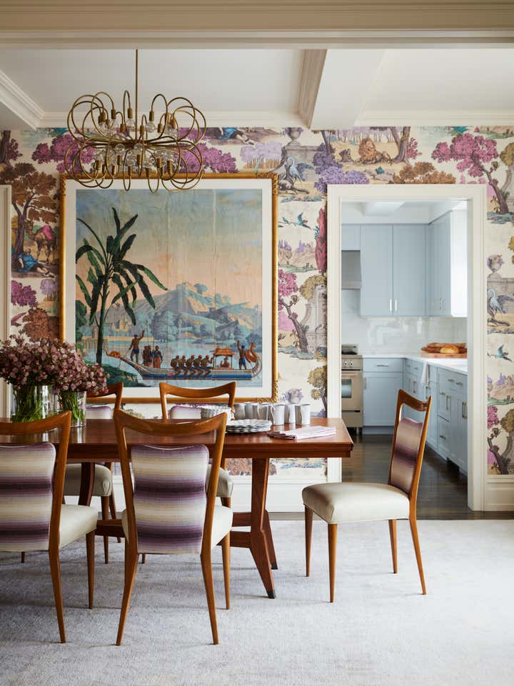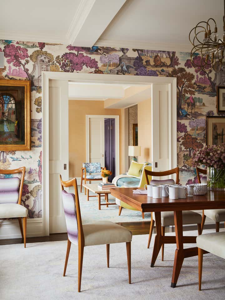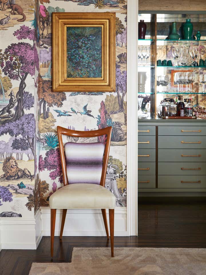 In this Upper West Side apartment, the vibrant personalities of our clients inspired the energy of the design. The client’s own artwork harmonizes against bold wallpaper. Rich, complementary hues create a vista of color from room to room. Creative millwork personalizes the framework of the home, from custom closets that make for functional storage space to a “jewel box” built-in bar that expands entertainment options.