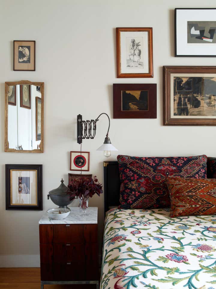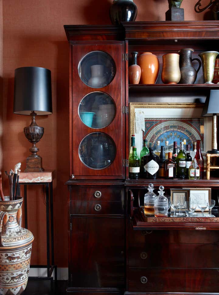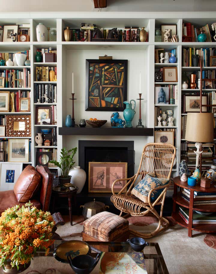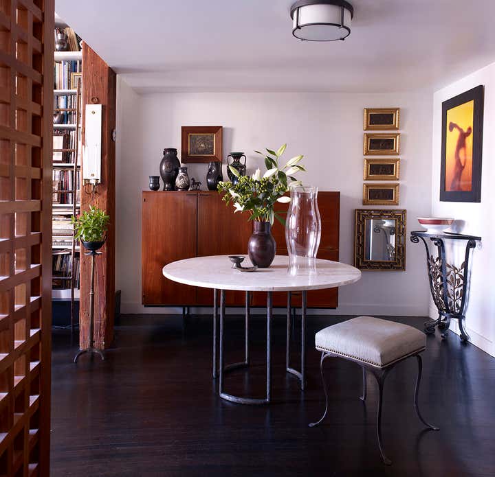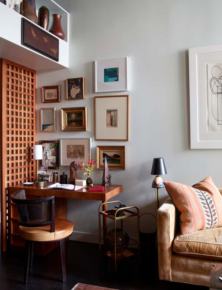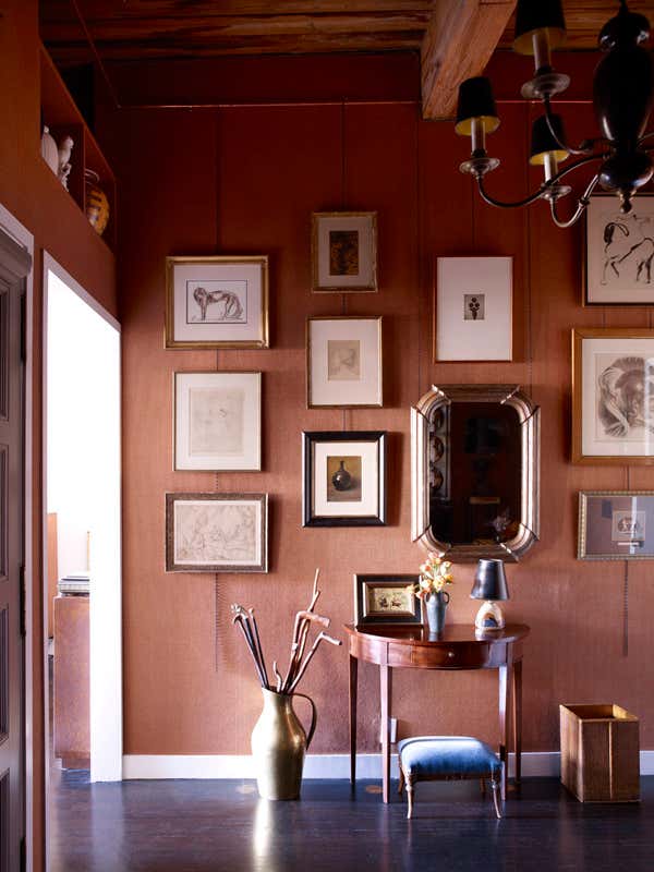 The client presented us with a unique challenge: reimagine a 10' x 15' foyer which lacked definition and point of view. Looking to legendary architect Sir John Soane's own home, we aimed to celebrate the client's own spirit of the collector, and create an aperture to an astonishing volume and variety of decorative arts, books and works on paper. Devising an art hanging system from common materials such as copper plumbing and steel chain, which reflected the industrial nature of the building, we sought to elevate the mundane to the extraordinary and accommodate an ever-evolving rotation of pochoirs, gouaches, and paintings. Silk burlap, a moody palette, and sublime textiles form the back drop to a vast treasure of books, dinanderie, and French pottery in the rooms beyond, all of which were given a curatorial polish.