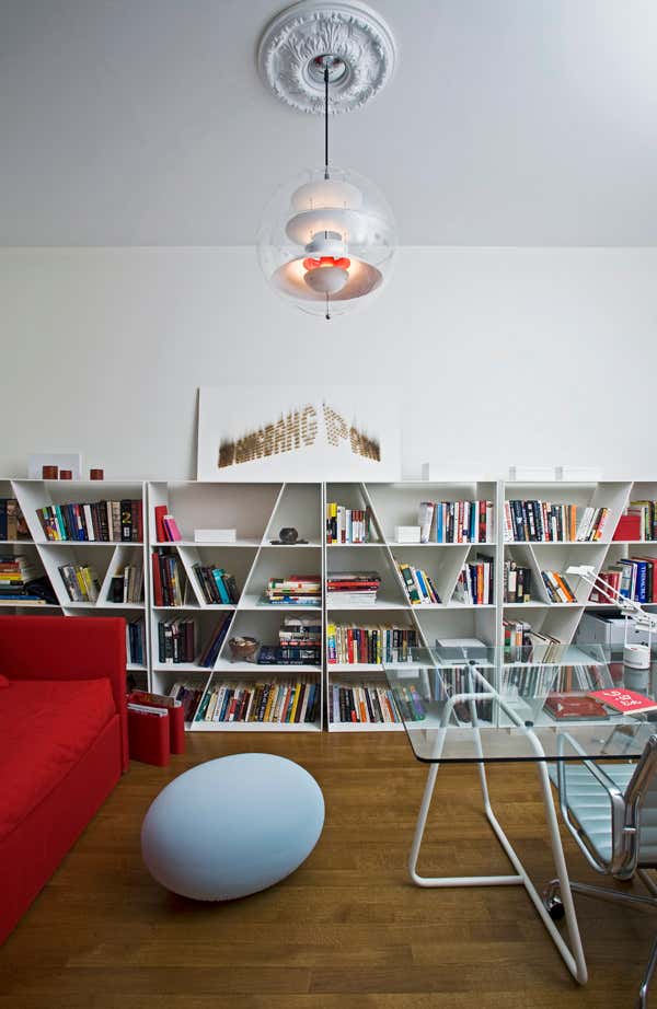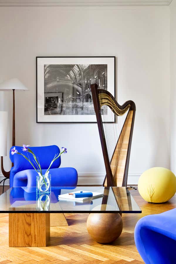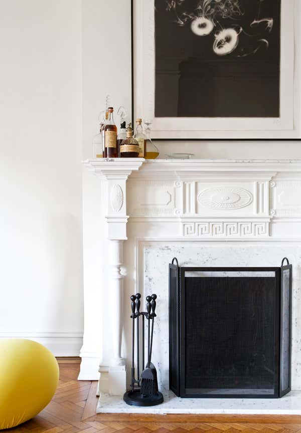In a landmarked building on Gramercy Park, immaculate rooms of plaster walls and herringbone floors serve as minimalist backdrop to sculptural furniture and chromatic pops. Colors are concentrated in focused groupings, and period appropriate restorations create frisson between stately architectural shell and whimsical furnishings.