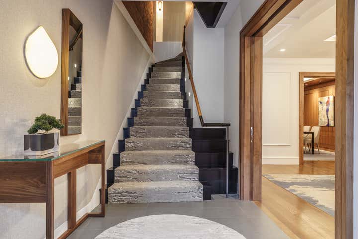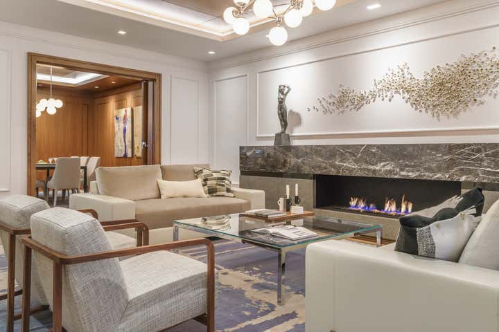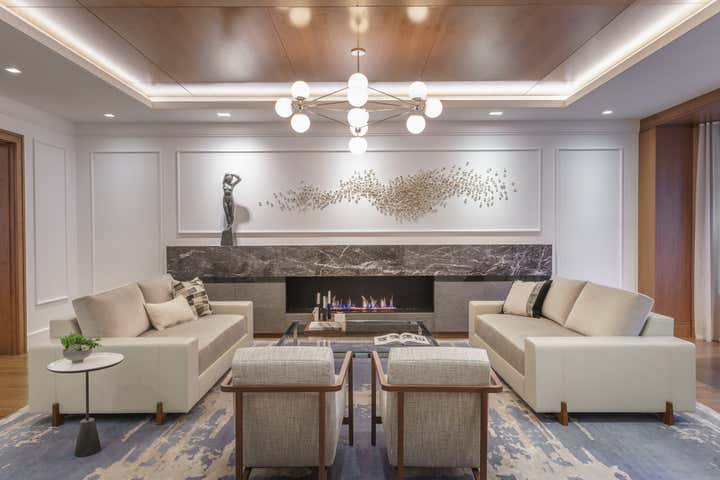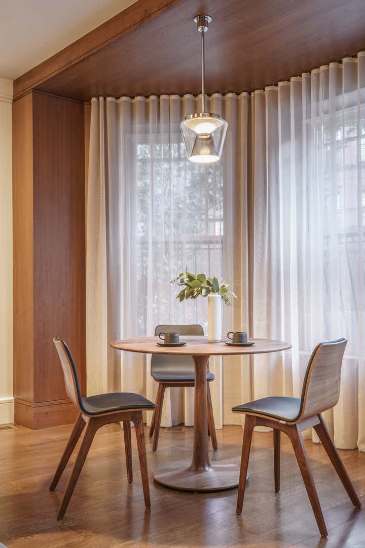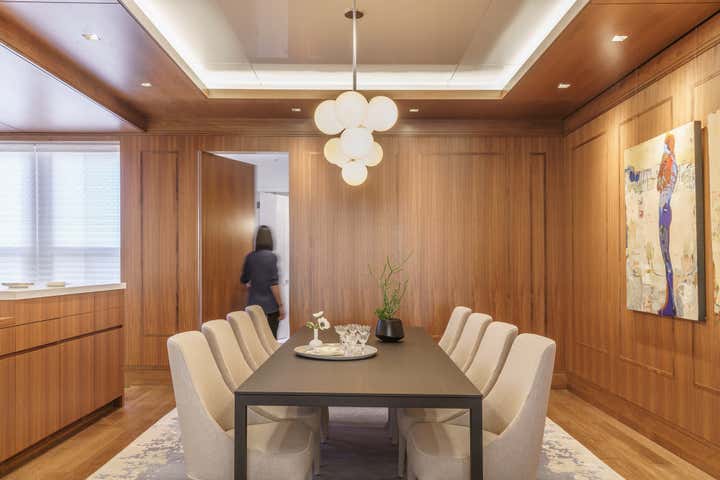 Marlborough Townhouse involved the conversion of the ground level of a three-story home into a refined entertainment parlor that maintains the essence of formal Back Bay style while embracing a more contemporary aesthetic. The architectural and interior design renovation included a new entry experience, an elongated marble fireplace with a custom sculptural art installation, a coffered ceiling, and floor-to-ceiling paneling that conceals access to the guest bedroom and powder room, creating necessary distinction between the public and private spaces. The owners were attracted to the concept of paneling as it allowed for the reinterpretation of classic parlor detailing; darker, custom-designed walnut paneling surrounds the dining space and a white lacquered finish brightens the nearby parlor room, making it ideal for gatherings.