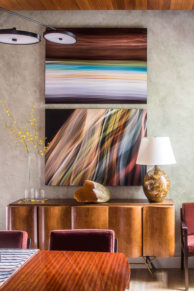 This is a mid-century modern inspired home defined by sophisticated, clean lines. We wanted to add softness and fun elements for a family with young children. The architect is Barnes Vanze.