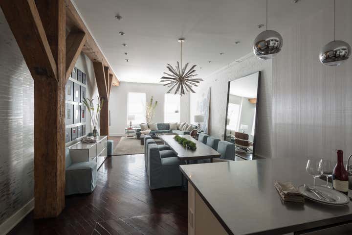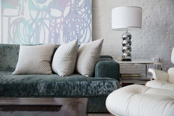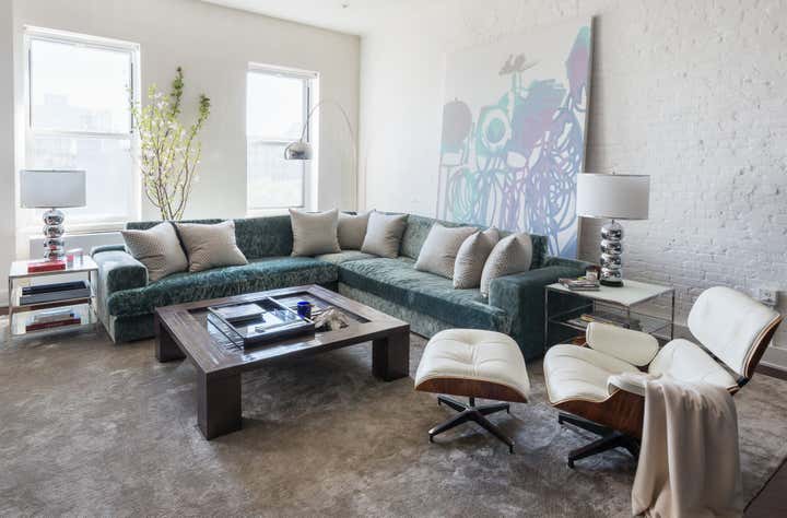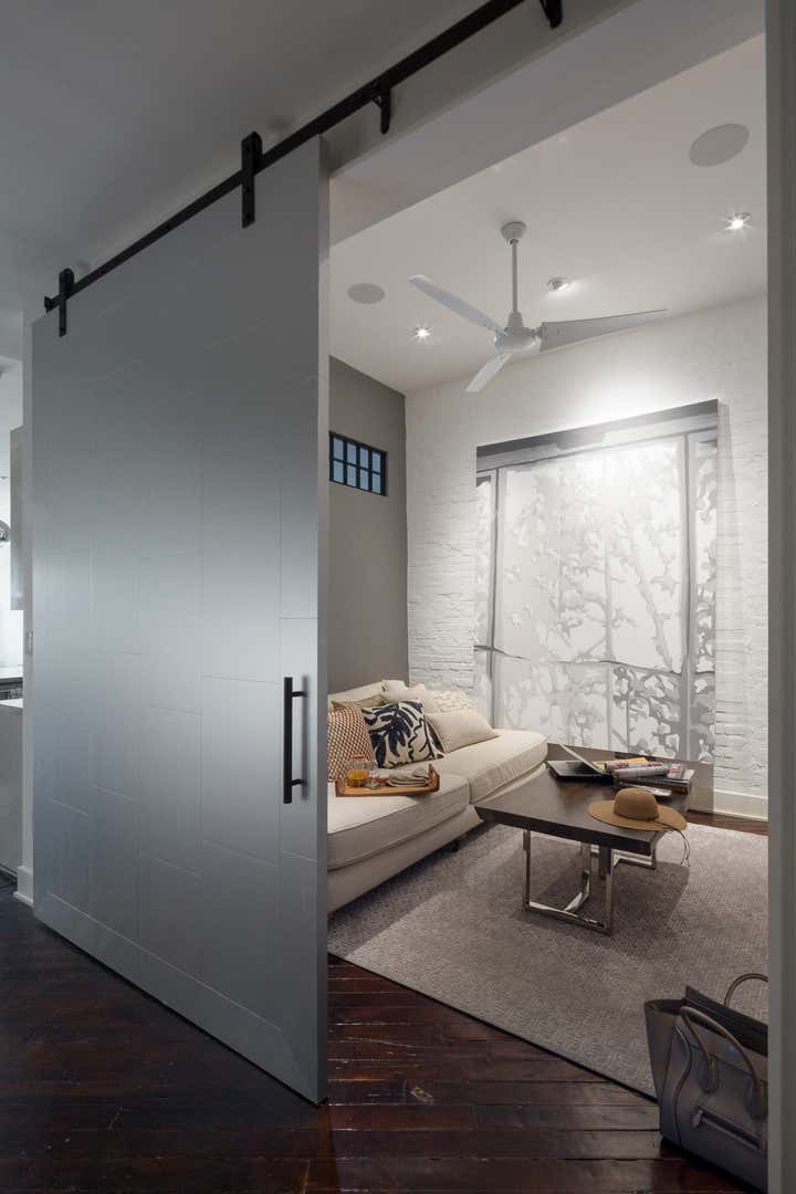 This authentic Brooklyn loft is located in a warehouse dating back to 1850. I modified the floorpan to incorporate a yoga room, improve the circulation between rooms, and increase the natural light to a guest bedroom. Every surface has been considered to create a tactile experience that reflects natural light in different ways. The sofa is upholstered in crushed velvet, the coffee table has a hand-lacquered, split-bamboo finish, the rug is natural silk, and each wall in the living room is either painted brick or treated with a reflective wall covering to create a dynamic envelope as you pass through the space.