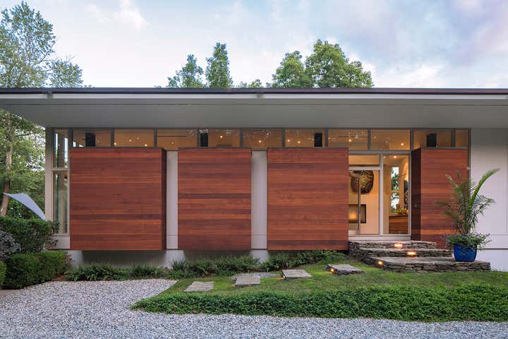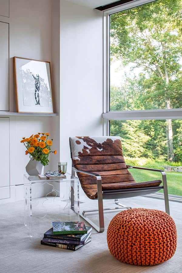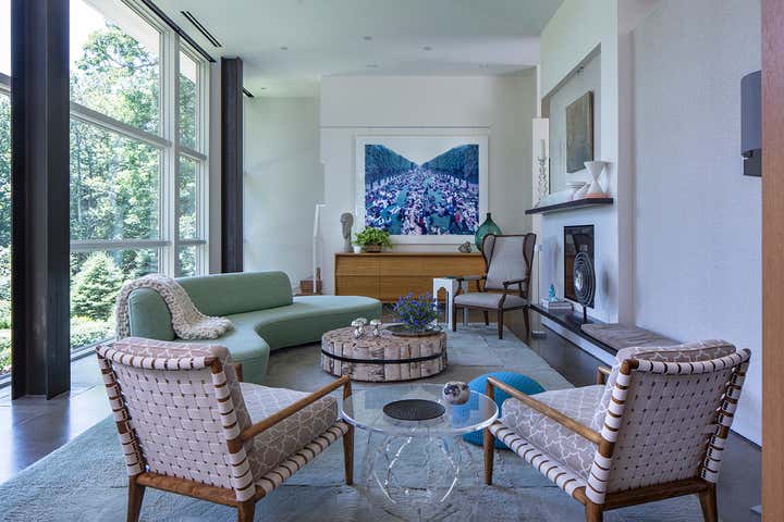 Concrete, steel and glass may strike some as cold, but in the hands of White Webb, it’s anything but. For this weekend home in upstate New York, we emphasized the connection to the outdoors by establishing a foundation of natural materials (linens, leathers, and warm woods), which we layered with verdant greens and other poppy colors from the landscape. Bold, contemporary artwork anchors the rooms while creative contrasts – such as the pairing of a sinuous Kagan sofa with a birch log coffee table or a lacquered Fornasetti dining table with more austere, leather-clad Klismos chairs – make for a vibrant interior that is uncluttered, but far from minimal.