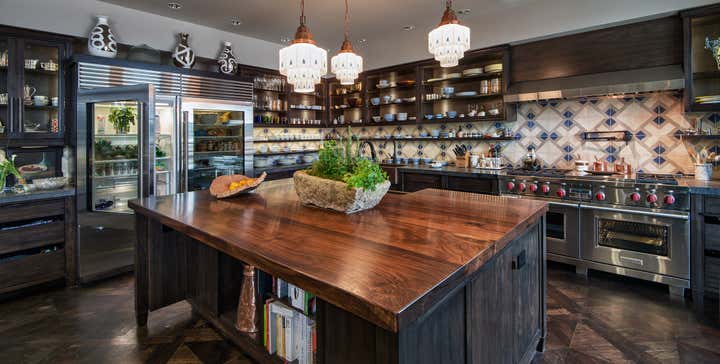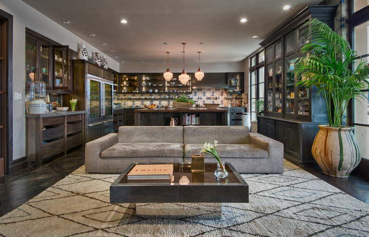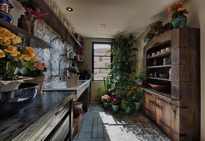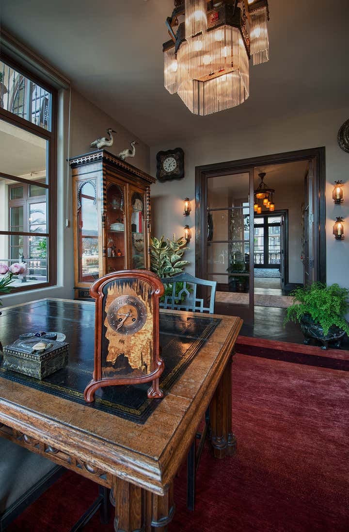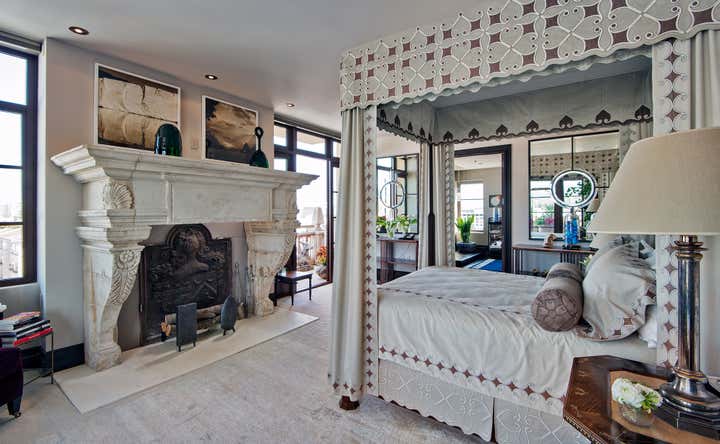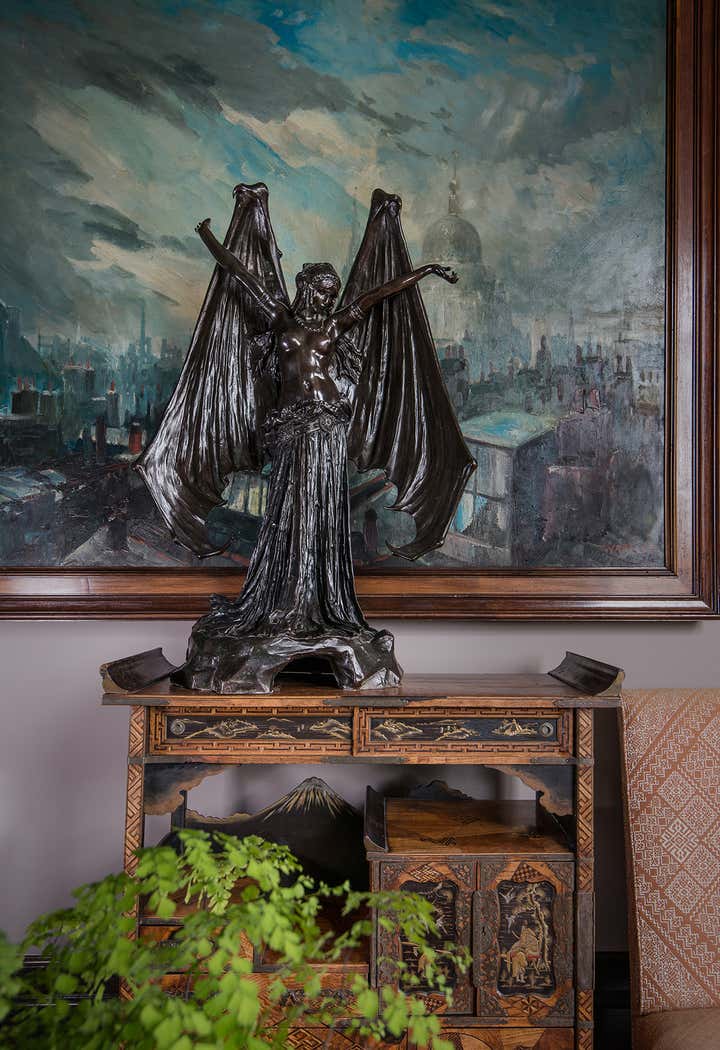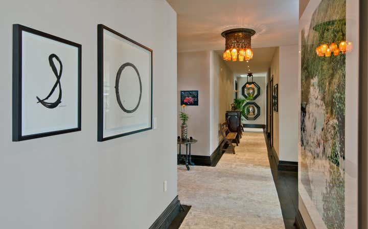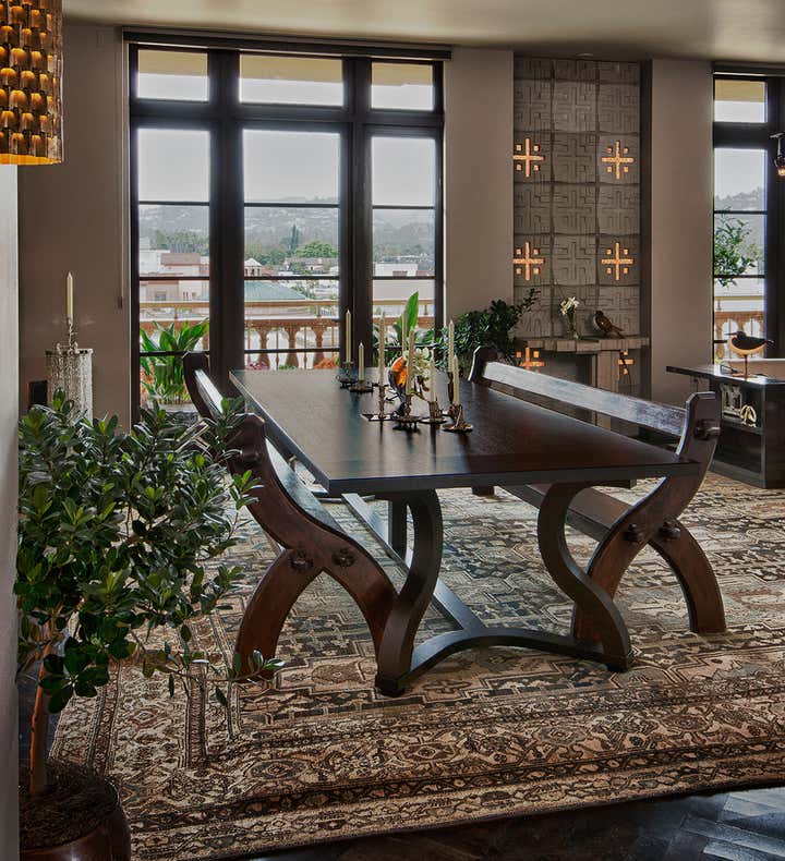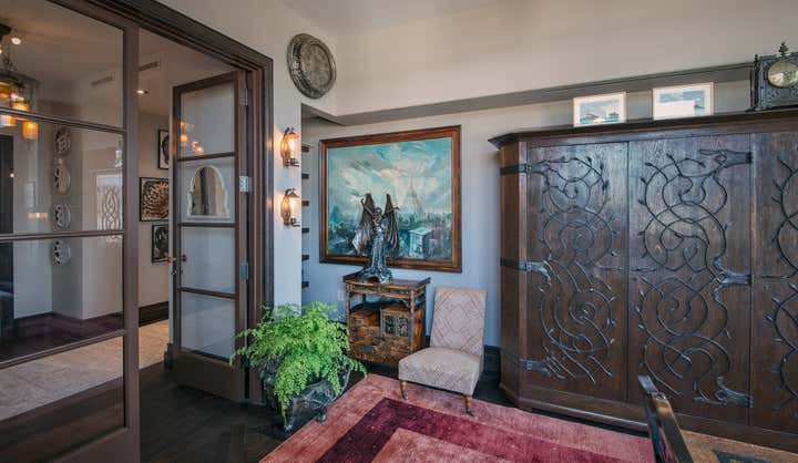 Occupying an entire wing of Beverly Hill's glamorous Montage Hotel, this spacious, light-speckled penthouse, with full-length landscaped terrace, is principally Gothic Revival meets “Bladerunner”. Quoting from the European Aesthetic Movement with twentieth-century modernist tweaks, the apartment has a recurring Frank Lloyd Wright motif, Bugatti tables, Richard Riemerschmid and E.W. Godwin furniture, and Agathon Leonard statuary. Everything is oriented along an open hallway cum art gallery, featuring the work of Raymond Pettibon, Massimo Vitali and L.A. graffiti artist RETNA. The residence is imbued with a stylish yet homey elegance, with the added convenience of being just steps away from one of the great commercial centers of the Western world.