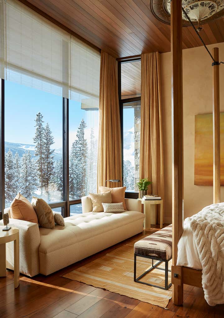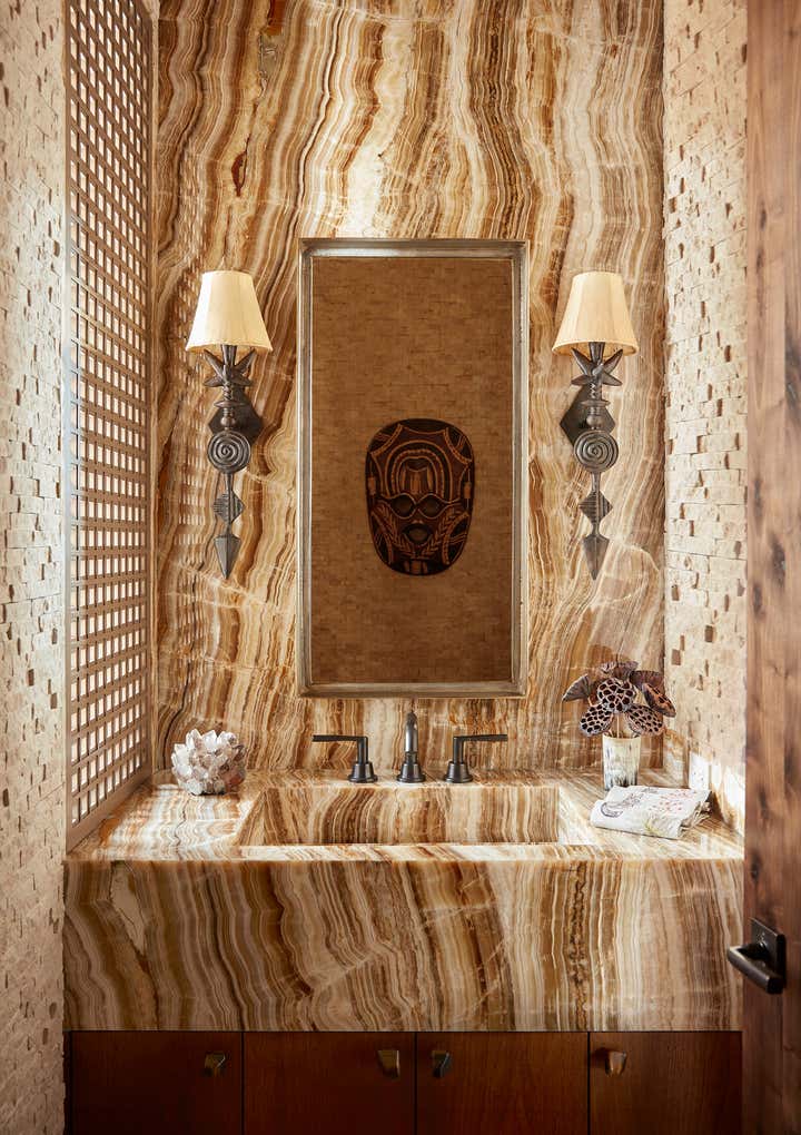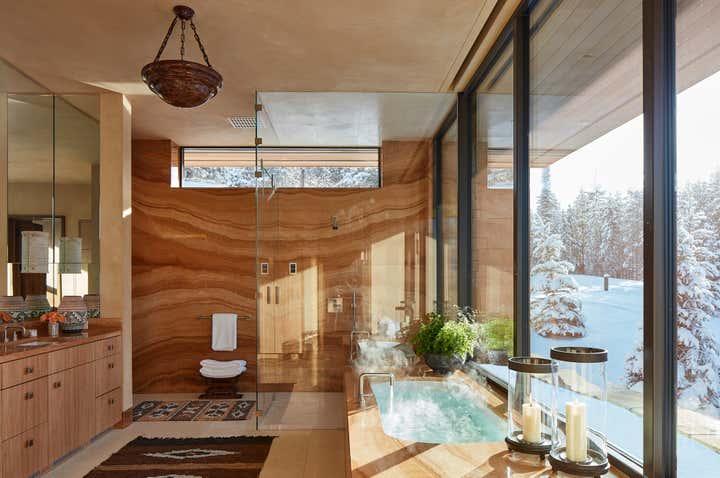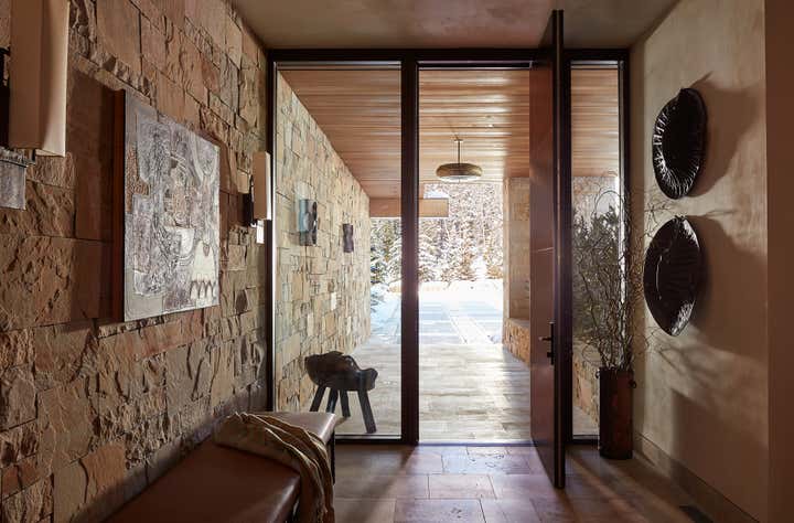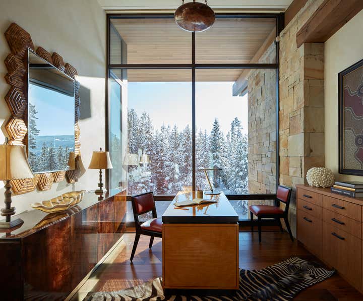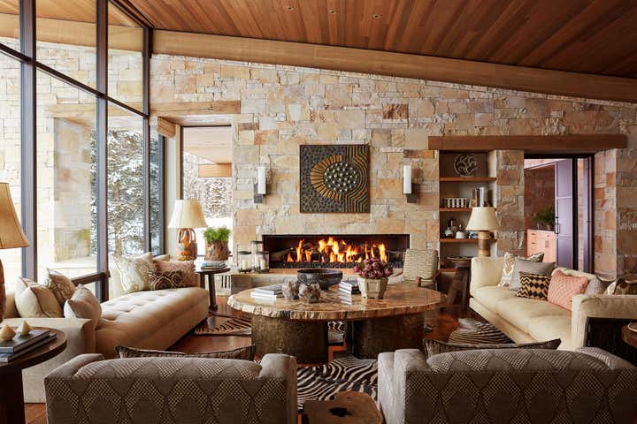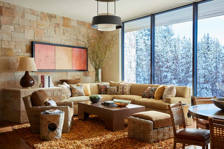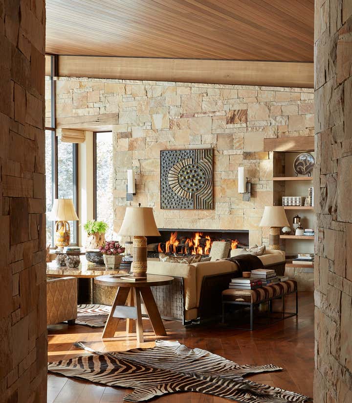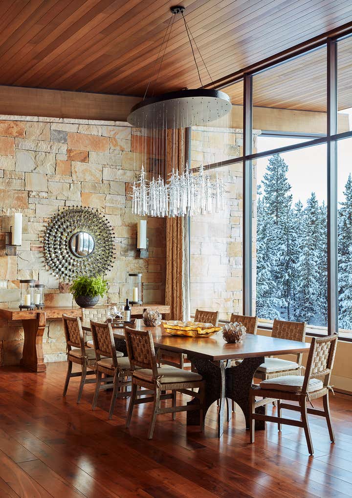 This vacation home, in majestic Big Sky country, called for interiors that felt equally compelling and organic. Thus, we looked for materials, textures, furnishings, art, and objects that met the scale of each space and the primeval drama outside. Yet these rooms still called for comfort and seduction. We accomplished this with the humanizing touch of the handcrafted and warm, earthy hues pulled from the surrounding terrain. There is a harmonizing tension between rustic and refined throughout the home: petrified wood, iron, bronze, and leather play to the massive stone walls. Luxurious upholstery and embroidered curtain panels add warmth and comfort. A light fixture of clear glass trees creates ethereal contrast in the dining room. Whether our clients visit during the summer months or at the winter solstice, their mountain house at eight thousand feet beckons with a modern, open lifestyle in a landscape from the beginning of time.