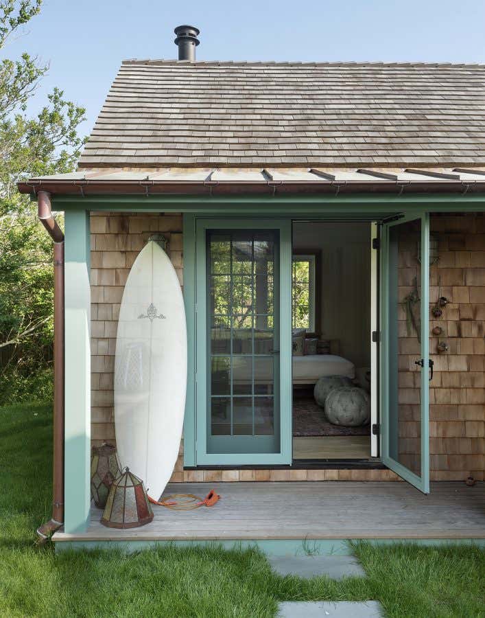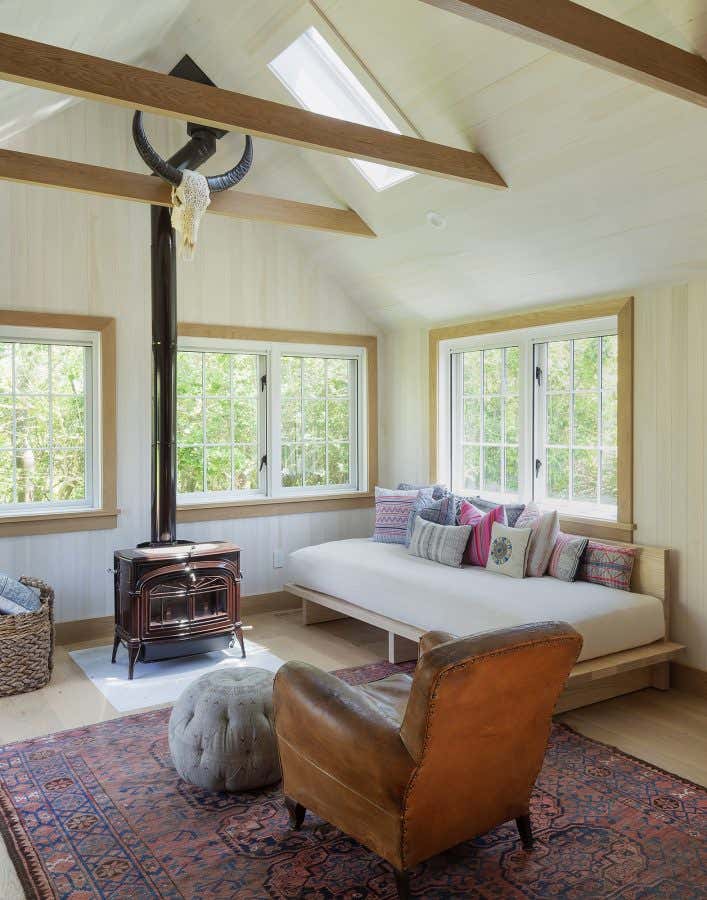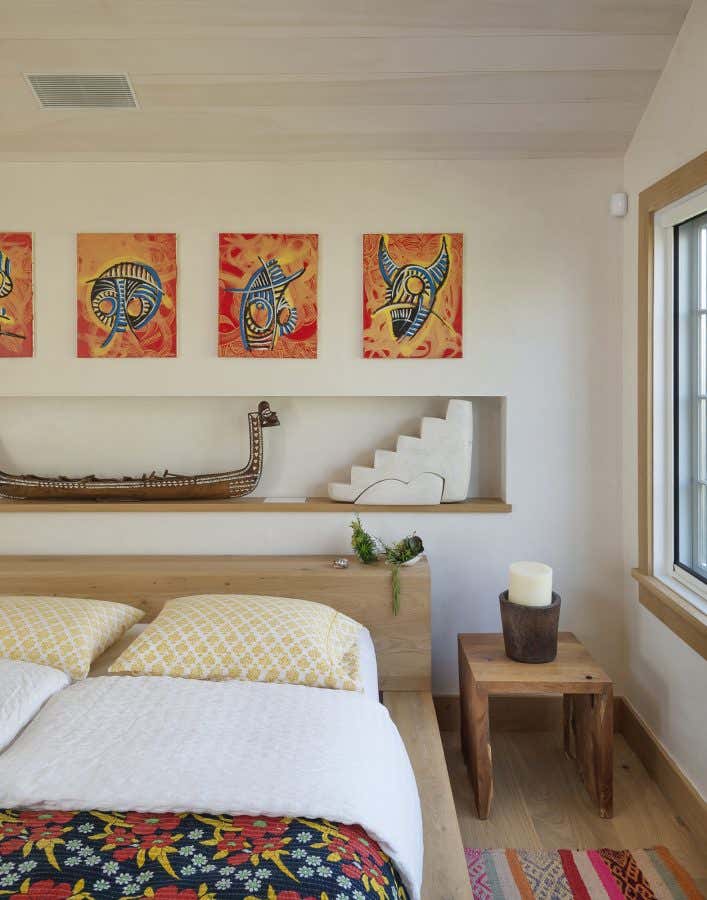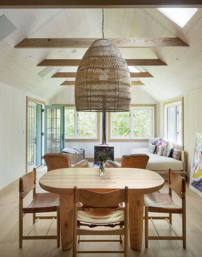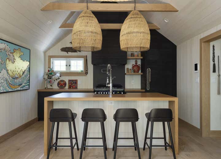 The Brooklyn Home Company was enlisted to design a surf shack with a bohemian aesthetic in Montauk. Following a renovation, lead interior designer, Holly Waterfield, led the decor sourcing and design for this bungalow including vintage Børge Mogensen chairs, seagrass pendants from Zoco Home, and poufs from Cisco Brothers in St. Frank cactus fabric. Art in the home includes a bespoke wooden sculpture from Fitzhugh Karol, as well as the client's own pieces by abstract expressionist Vernon O’Meally and a contemporary piece by Harif Guzman.