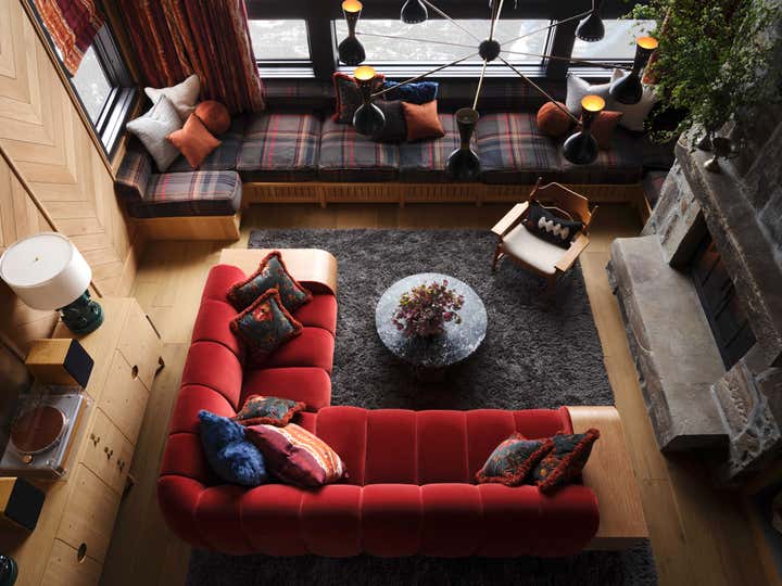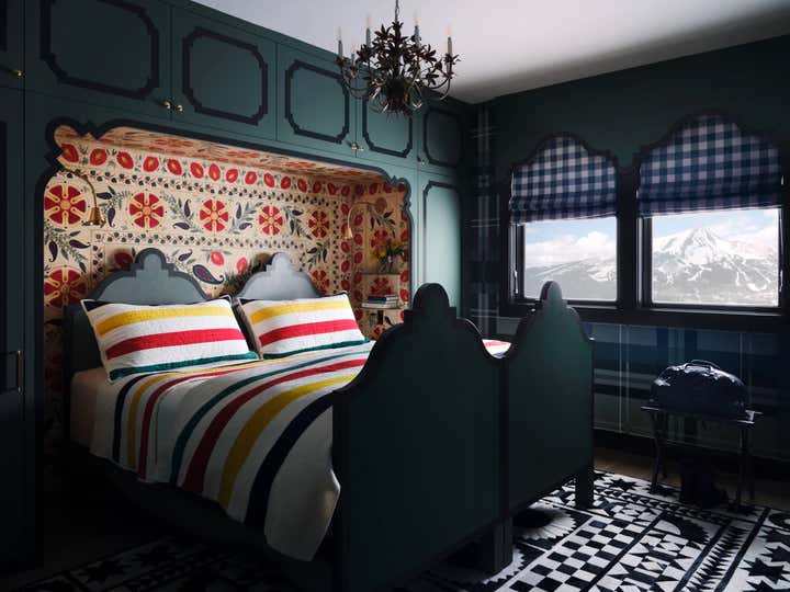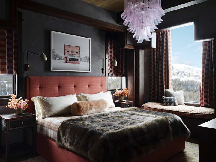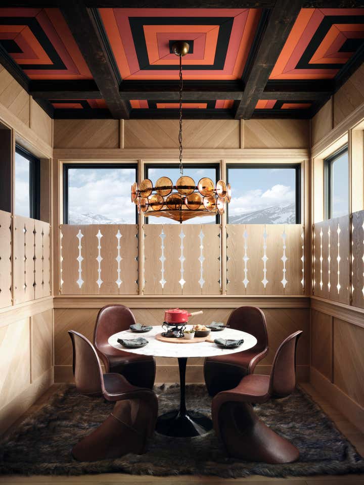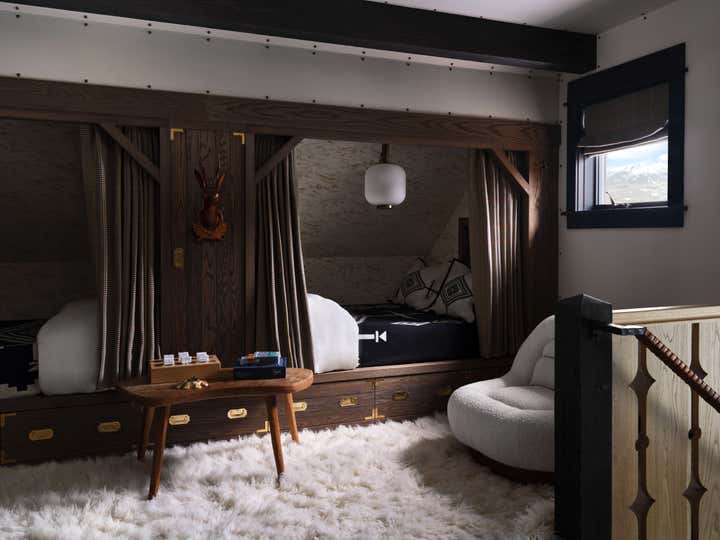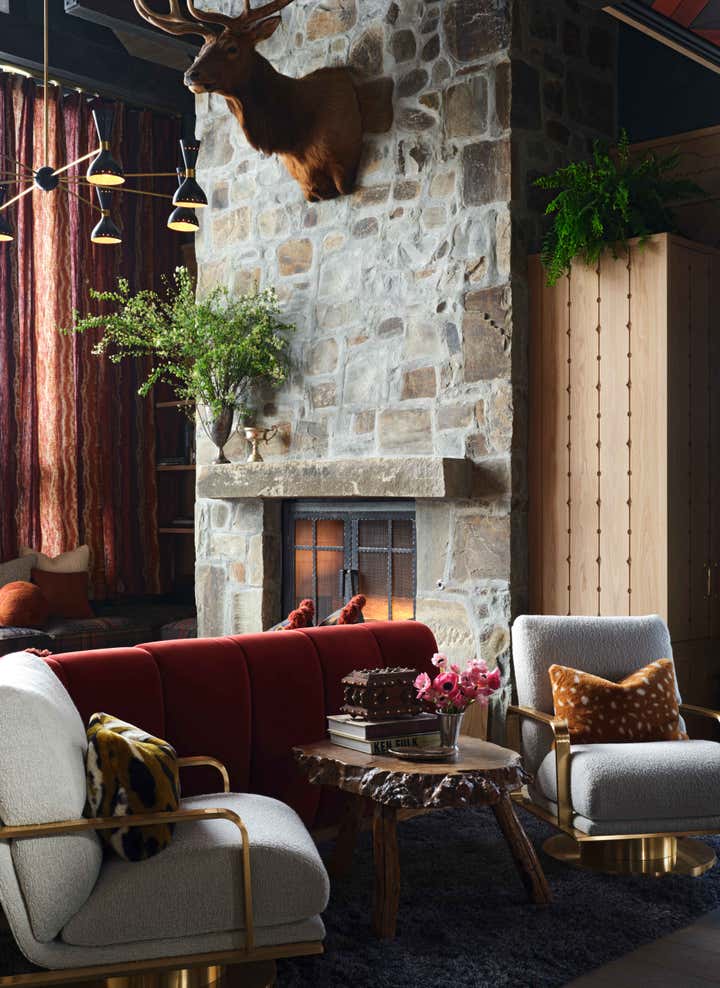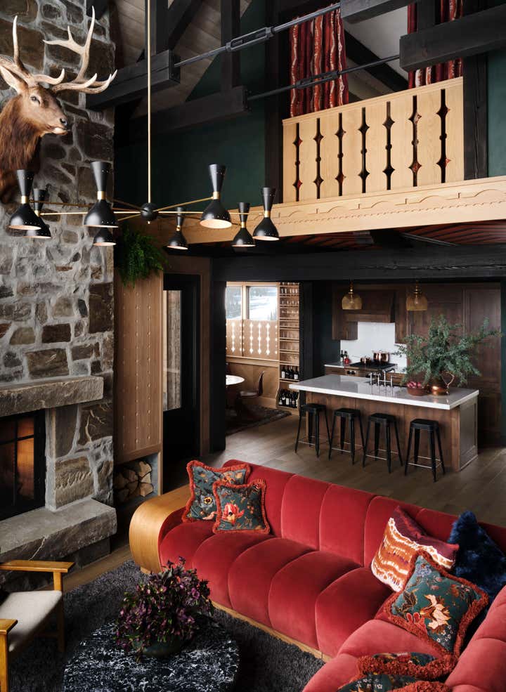 A Greatest Hits collection of après-ski style in one of most enviable private ski resorts. For one of our favorite clients, who happens to be an actual rockstar, we translated mountain lodge style as a mix of modern and nostalgic references to create a rustic yet groovy family getaway. Inglenooks and carved wood banisters reference a classic Swiss chalet while slinky velvet seating and fur rugs offer a midcentury St. Moritz swagger. Traditional Native American patterns and rough-hewn stone mix with graphic treatments worthy of an 80s ski film adorn ceilings, walls, bunkbeds—even a tiger-striped car pet runner. The end result is an energetic getaway designed to spark memorable.