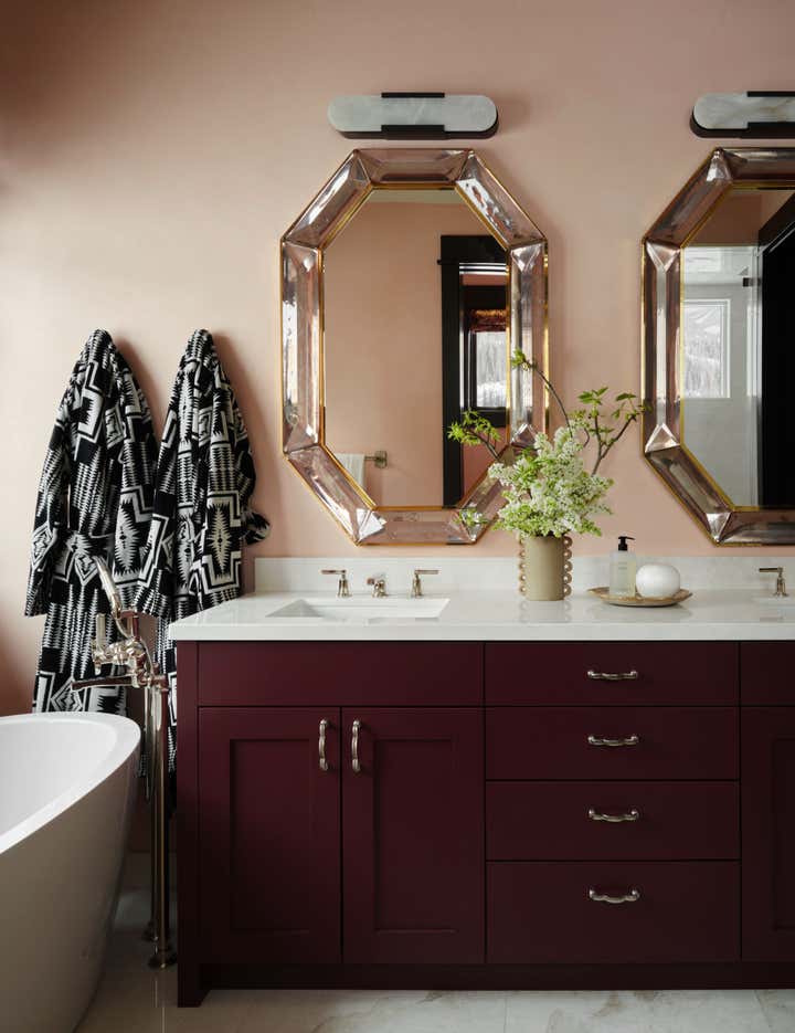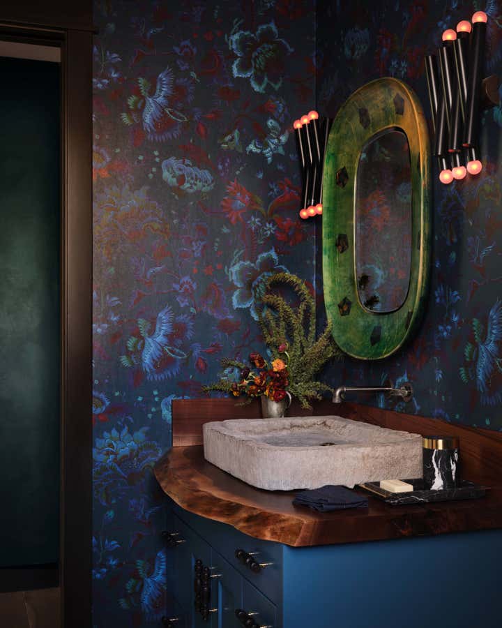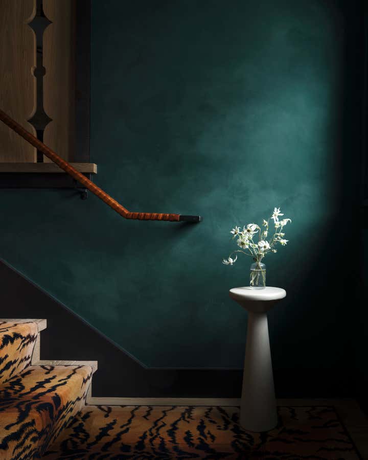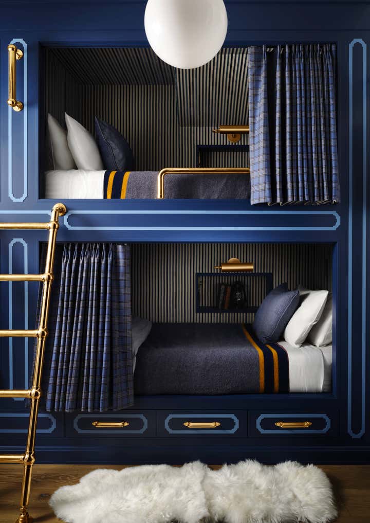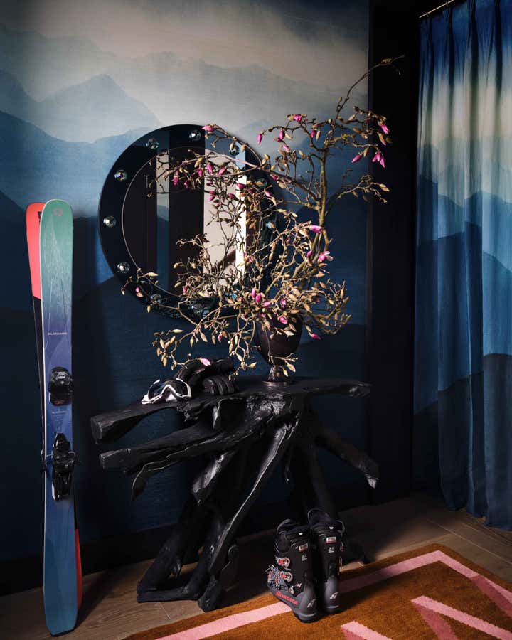 A Greatest Hits collection of après-ski style in one of most enviable private ski resorts. For one of our favorite clients, who happens to be an actual rockstar, we translated mountain lodge style as a mix of modern and nostalgic references to create a rustic yet groovy family getaway. Inglenooks and carved wood banisters reference a classic Swiss chalet while slinky velvet seating and fur rugs offer a midcentury St. Moritz swagger. Traditional Native American patterns and rough-hewn stone mix with graphic treatments worthy of an 80s ski film adorn ceilings, walls, bunkbeds—even a tiger-striped car pet runner. The end result is an energetic getaway designed to spark memorable.